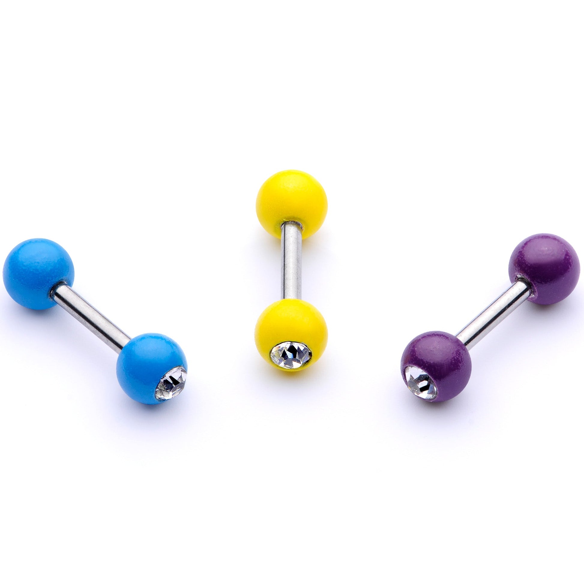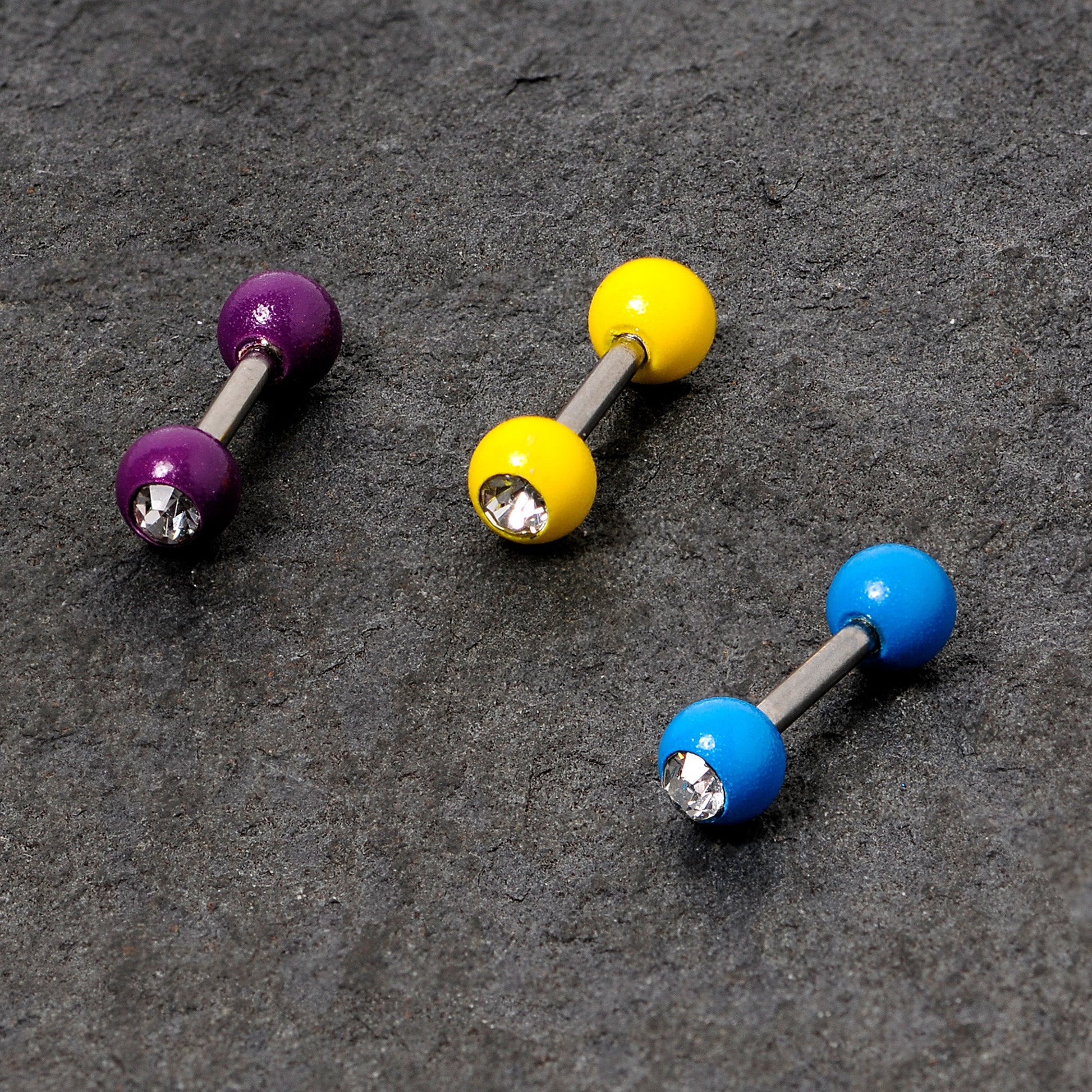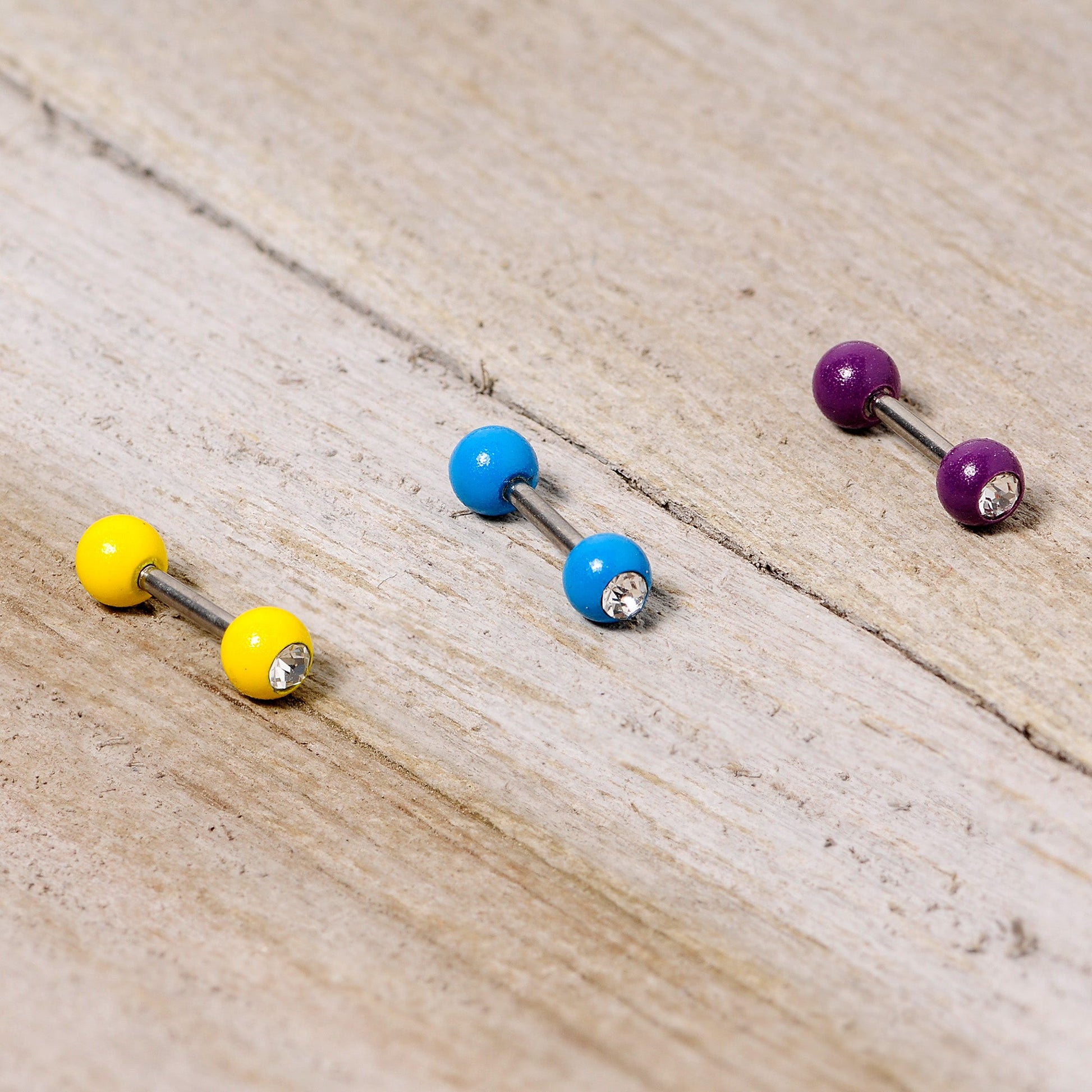 Give your cartilage piercings a healthy glow with this set of 16 gauge cartilage barbells! They're made with 6mm durable 316L surgical grade stainless steel straight barbells with 4mm ball ends. You get one each with purple ball ends, blue ball ends, and yellow ball ends....and each one has a clear gem set into the front ball end. Even better, turn off the lights and these glow in the dark! Best of all, these work in multiple piercings including cartilage piercings like the tragus, helix, and some conch piercings! Glow on and glam up your piercings with these gorgeous, glow in the dark tragus earrings! Sold as a set of three.Specifications