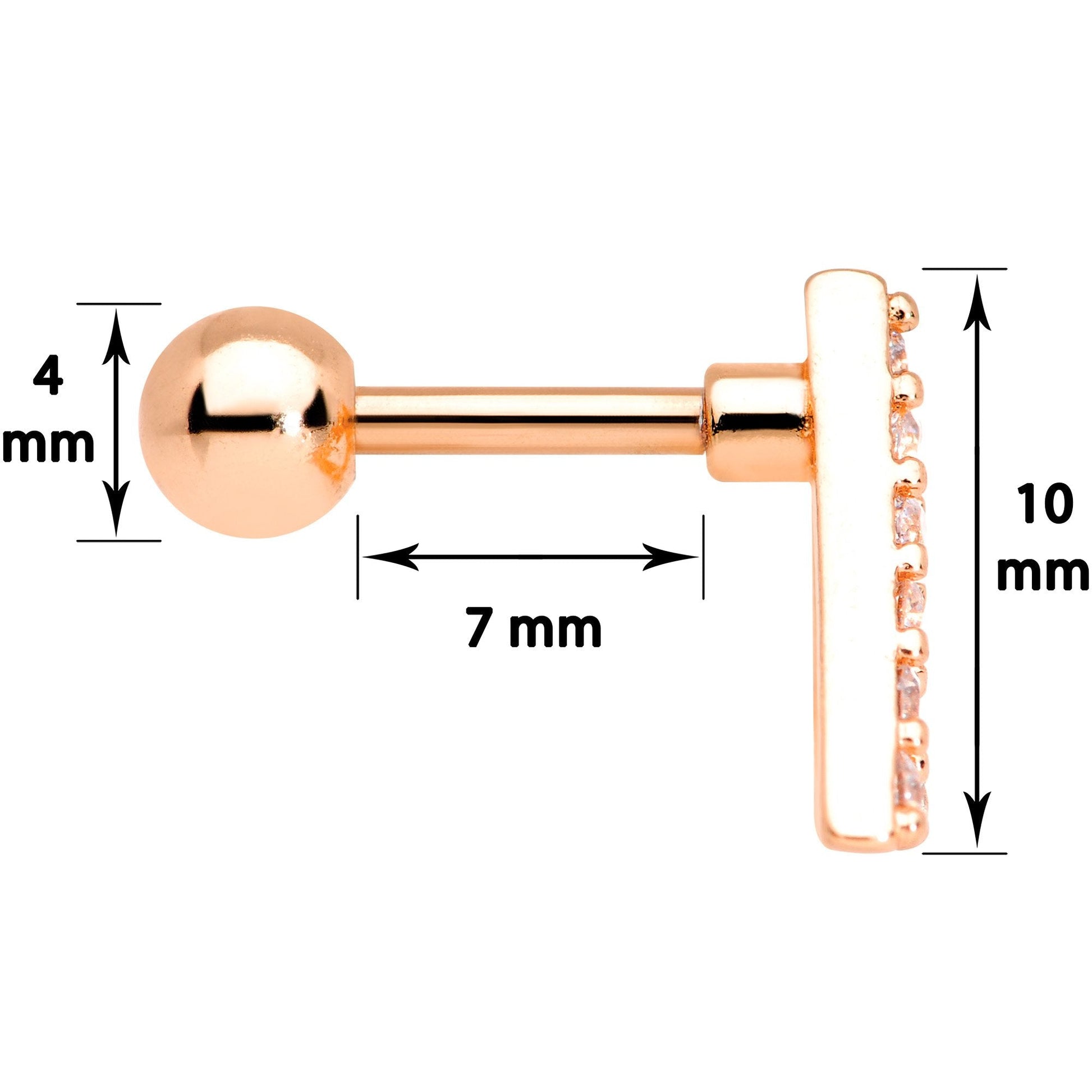 Whether you are curating the perfect pierced cartilage look or just love something unique this 16 gauge cartilage piercing is a perfect choice for you. Made with 6mm rose gold tone plated over 316L surgical grade stainless steel straight barbells, this tragus jewelry features a cutout triangle charm framed with clear gems.Specifications
