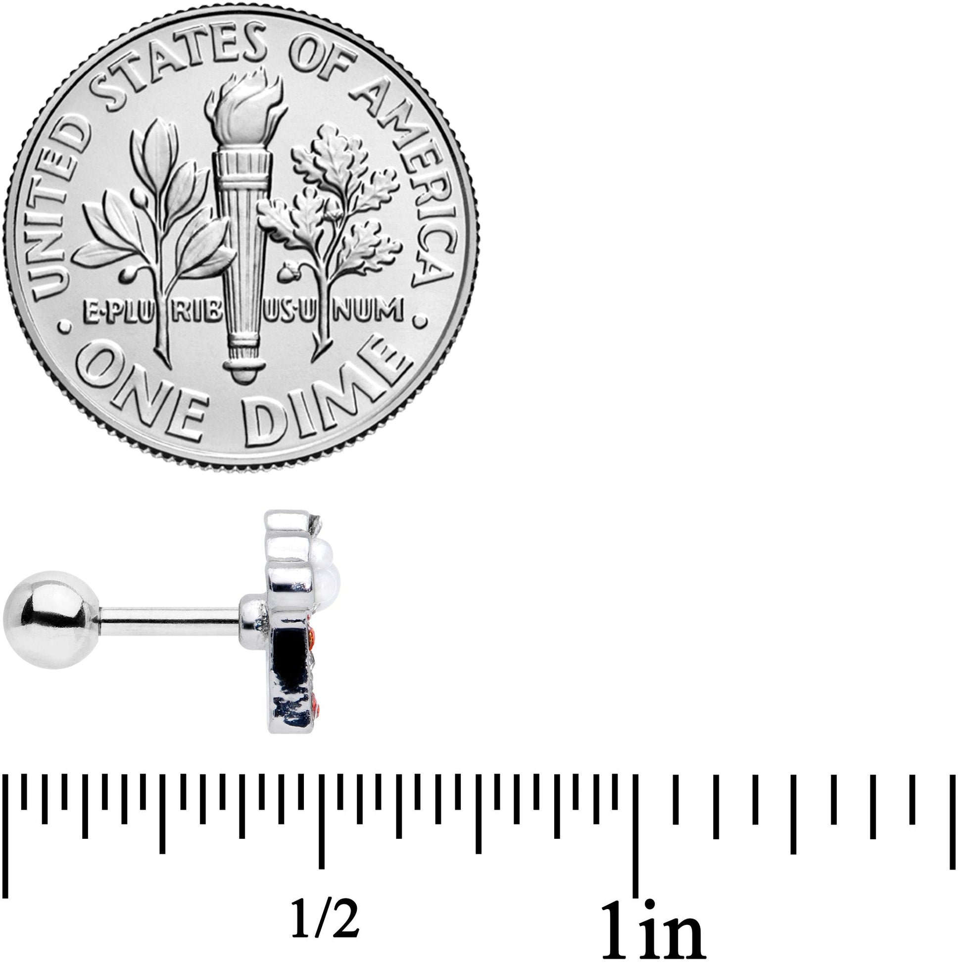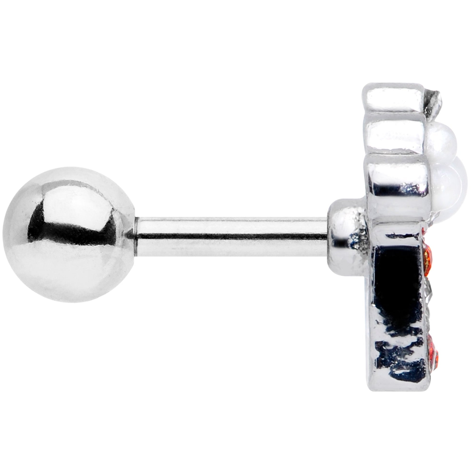 If you can't wait to dig into all of your favorite sweets at the movies then you're going to gobble up this 16 gauge cartilage jewelry. Made with a 6mm durable 316L surgical grade stainless steel straight barbell with a 4mm ball end, this tragus stud features a popcorn charm end with a clear and red gem carton as well as white orb popcorn inspired by the classic theater treat. And it works beautifully in multiple piercings such as a helix, tragus, and some conch piercings. Mmmmm......pass the popcorn!Specifications
