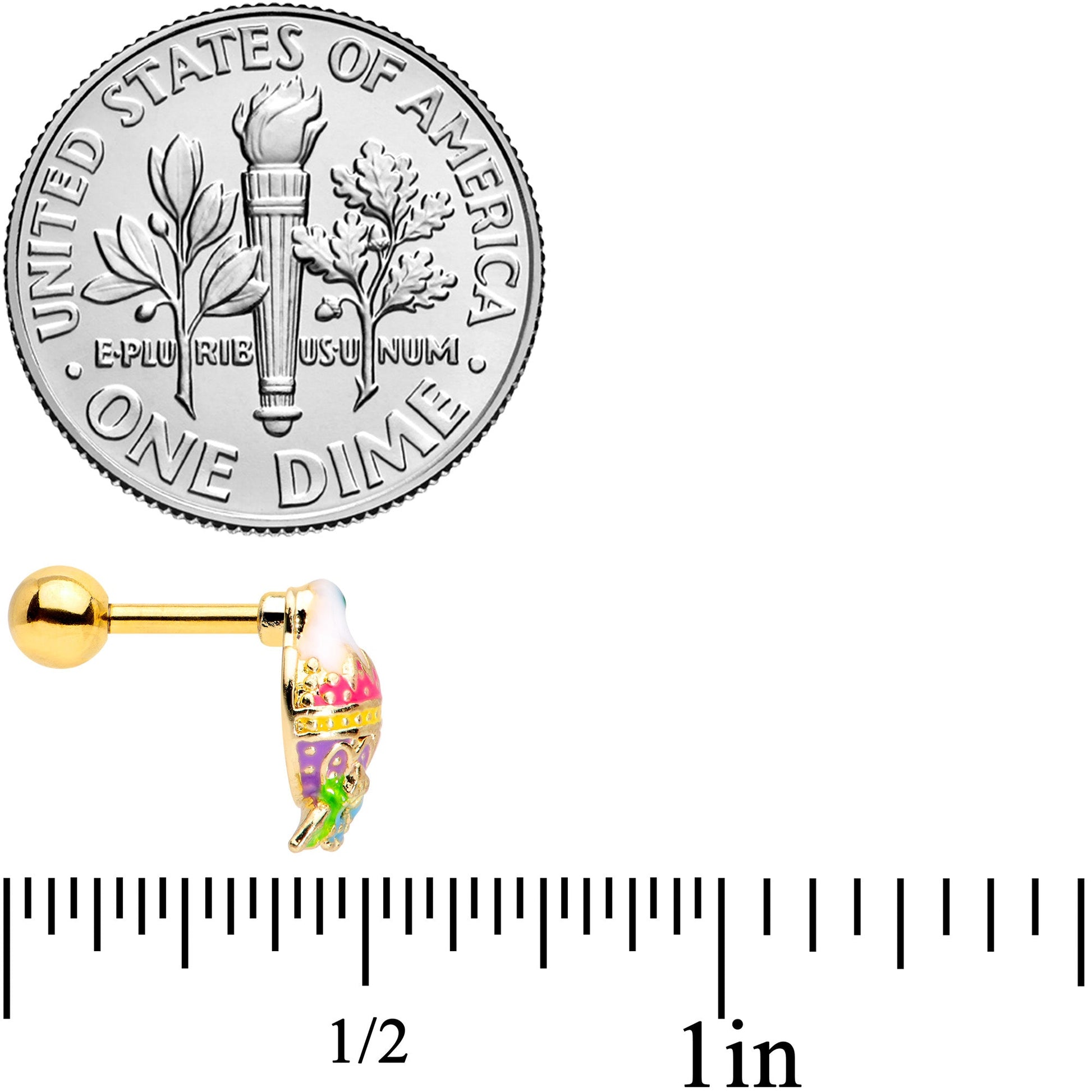 The chick on this 16 gauge cartilage stud is living like royalty! It's made with a 6mm gold tone PVD over 316L surgical grade stainless steel straight barbell with a 4mm ball end. It features an Easter egg charm with a little chick peeking its head out of the top. The egg is lavishly embellished with pink, yellow and purple inlay. At its base are leaves and flowers, further embellishing it for a look that is truly opulent. You can even boast this bird in multiple piercings including tragus, helix, and some conch piercings. Let your cartilage piercings look like royalty this Easter with this elegant Easter egg tragus stud!Specifications