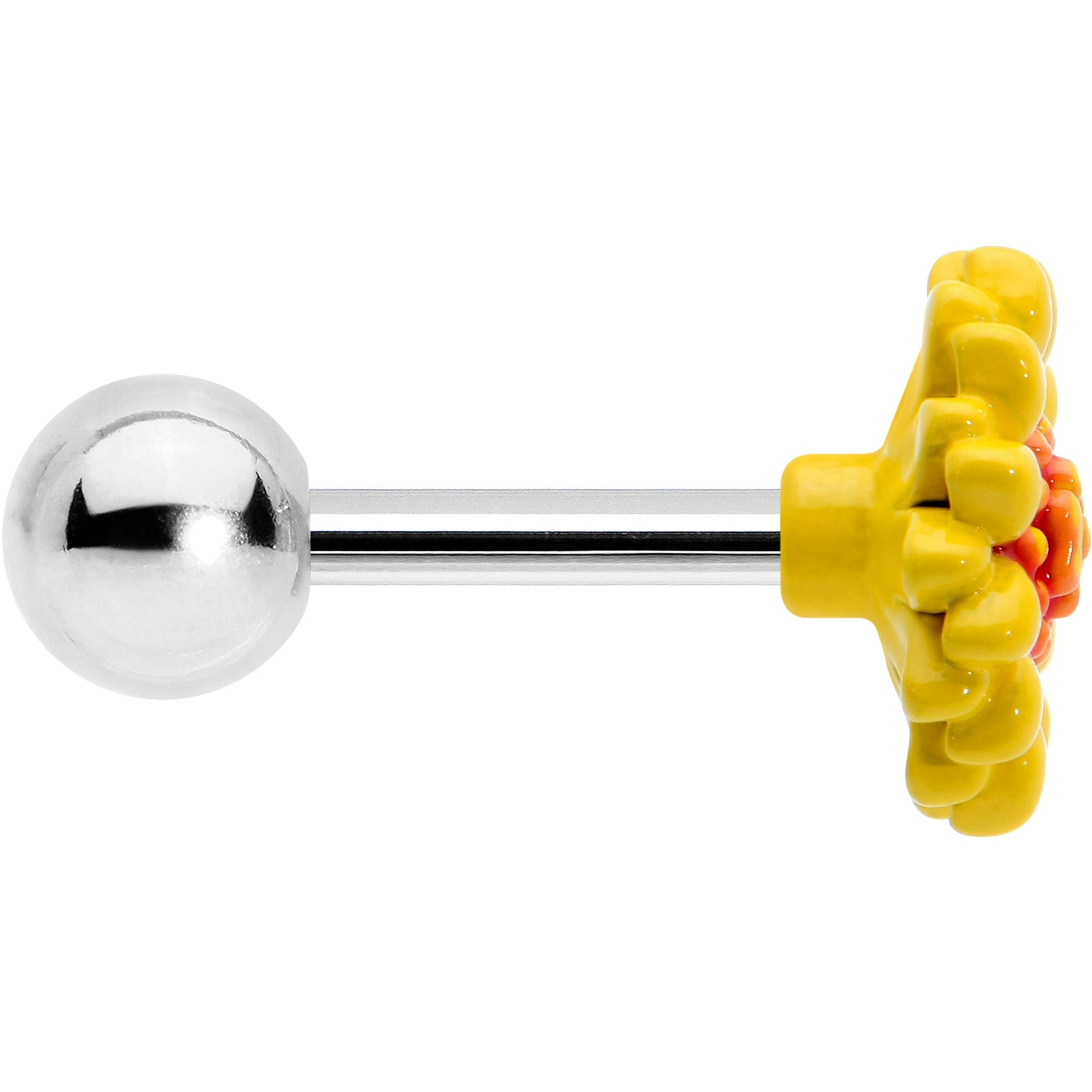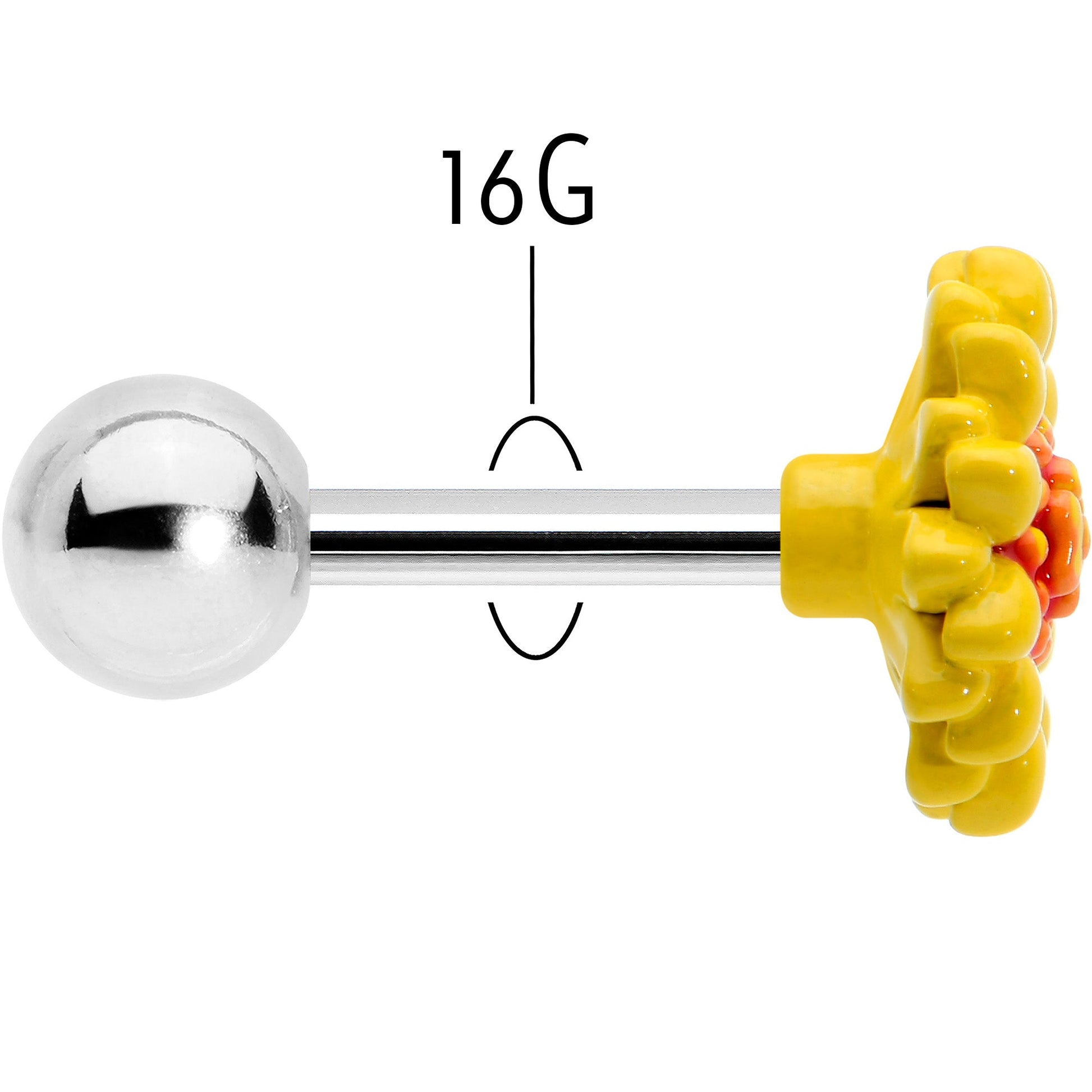 The sun is out...and it's brought some friends on this 16 gauge tragus stud, It's made with a 6mm durable 316L surgical grade stainless steel straight barbell with a 4mm ball end. It features a yellow sunflower charm with textured, contrasting detailing at its center. You can even rock it in multiple piercings including tragus, helix, and some conch piercings. Make every day a sunny day with this striking sunflower cartilage piercing jewelry.Specifications