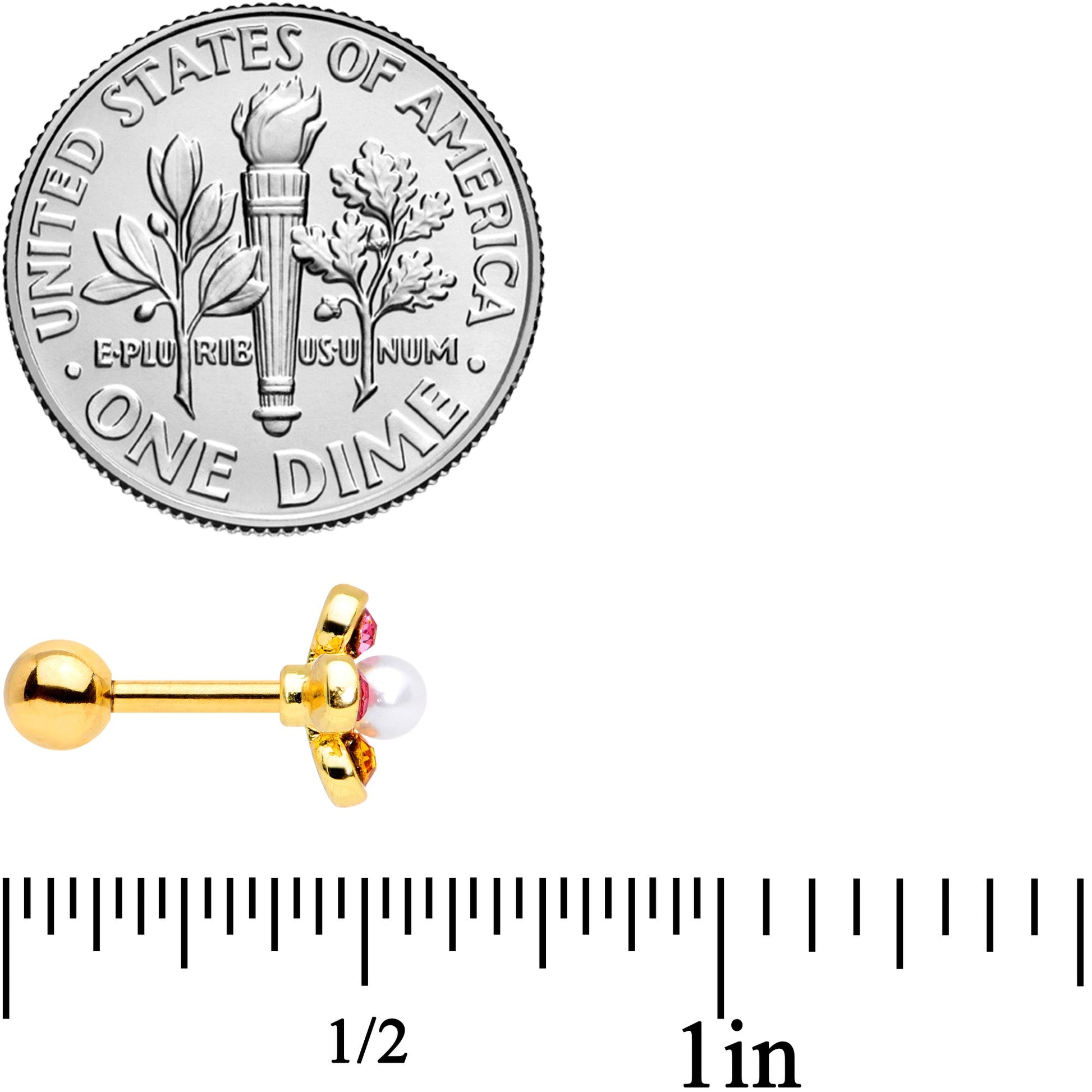 Put a little flower power in your cartilage piercing with this 16 gauge cartilage stud! It's made with a 6mm gold tone PVD over 316L surgical grade stainless steel straight barbell with a 4mm ball end. It features a flower charm composed entirely of gems, with each petal a different color. There's one petal each in light pink, deep blue, golden yellow, and hot fuschia pink. At the center, the flower is further embellished with a white pearlescent orb that gives the piece a cohesive feel without overwhelming it. And it works beautifully in multiple piercings including helix, tragus, and some conch piercings! Your cartilage piercing will have the power to bloom proudly with this whimsical tragus stud in it!Specifications