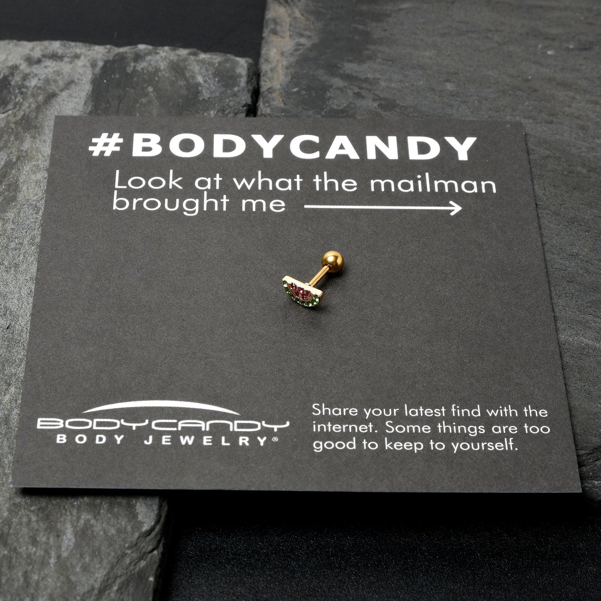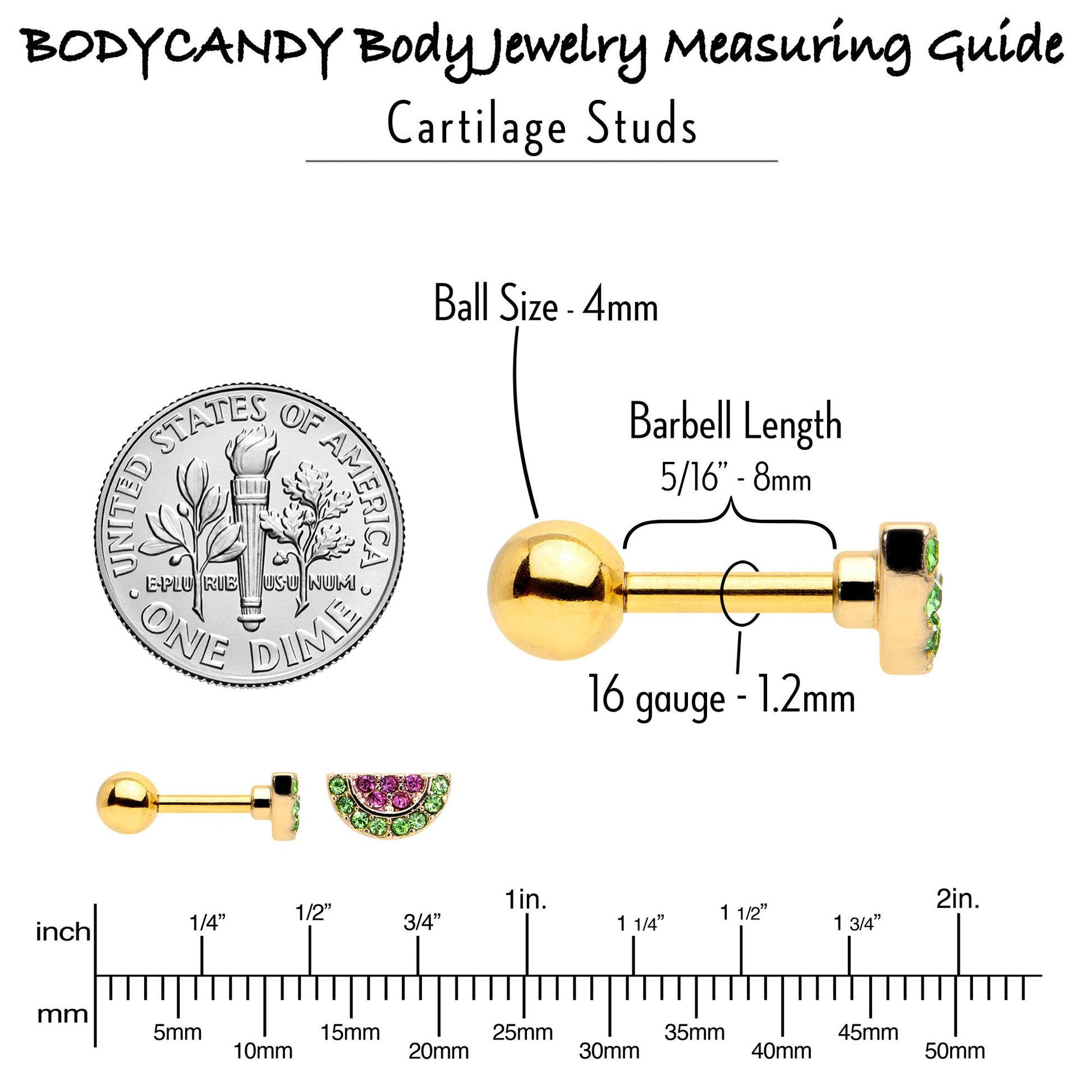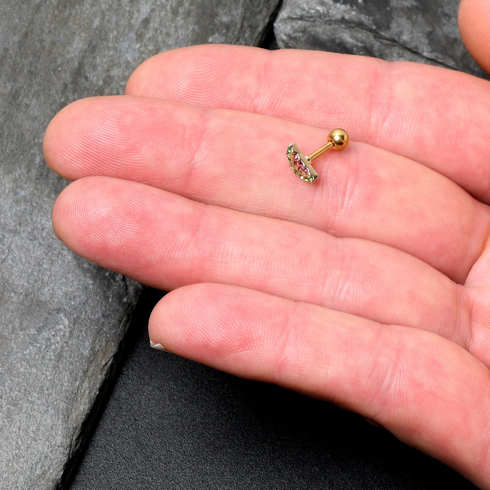Your cartilage piercings will look downright delicious when you are wearing this 16 gauge tragus stud. It is made with a 6mm gold tone PVD over 316L surgical grade stainless steel straight barbell with a 4mm ball end. The front features a wedge of watermelon charm, paved in green and pink gems. You can wear this marvelous melon in multiple piercings including tragus, helix, and some conch piercings. Get a tasty summer look with this wonderful watermelon cartilage piercing ring.Specifications