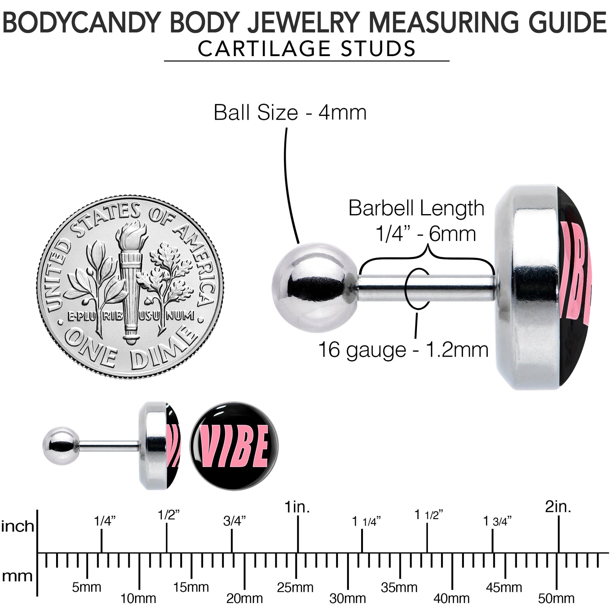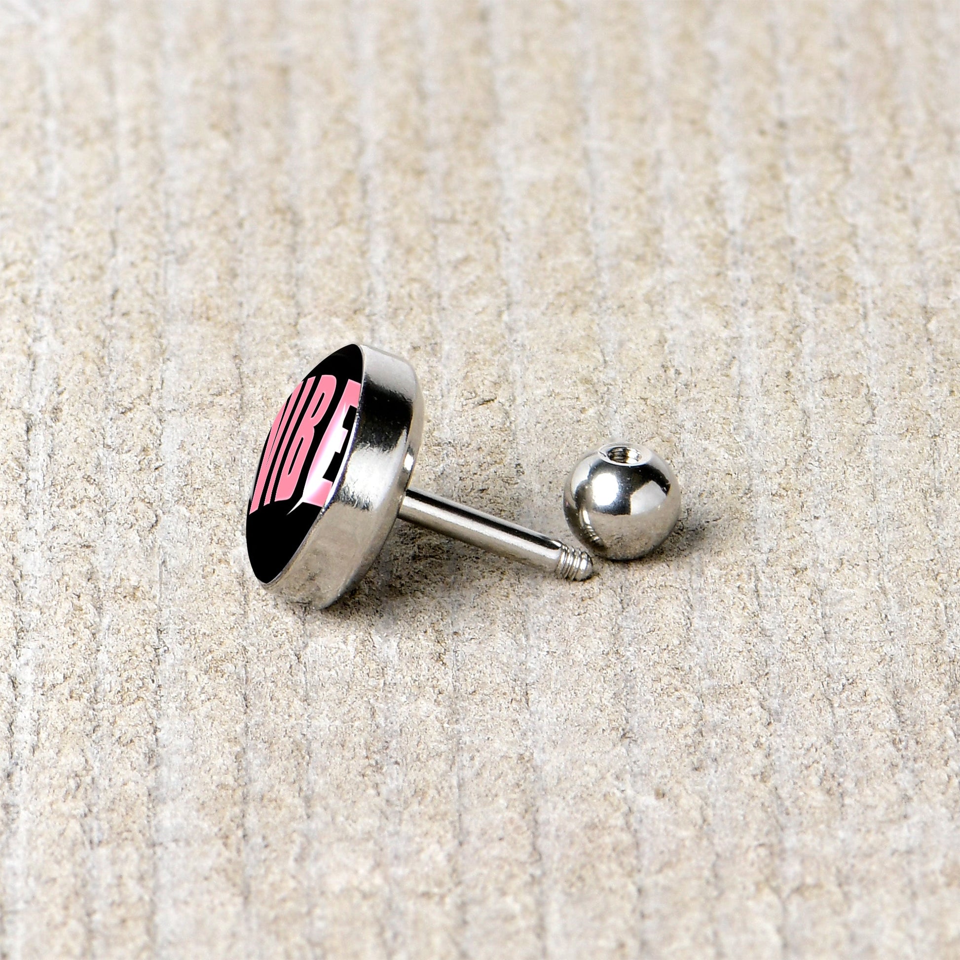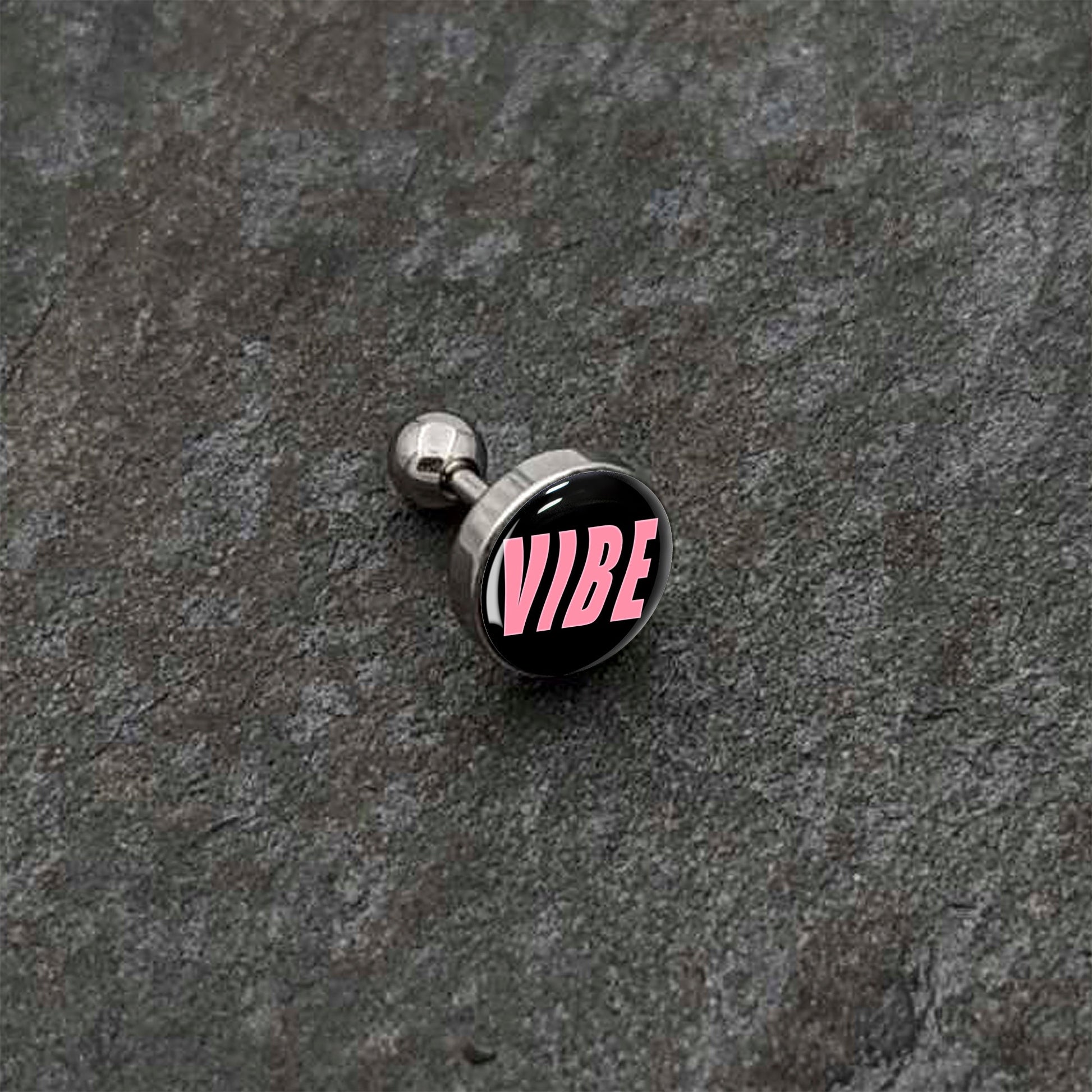 Feel the vibes with this 16 gauge tragus stud. It is made with a 6mm durable 316L surgical grade stainless steel straight barbell with a 4mm ball end. The front end features a black disc shaped charm. It has the word vibe on it in pink, for gorgeous color contrast and you can rock it in multiple piercings including tragus, helix, and some conch piercings. If you are feeling the vibes, tell the world with this simply statement cartilage piercing ring.