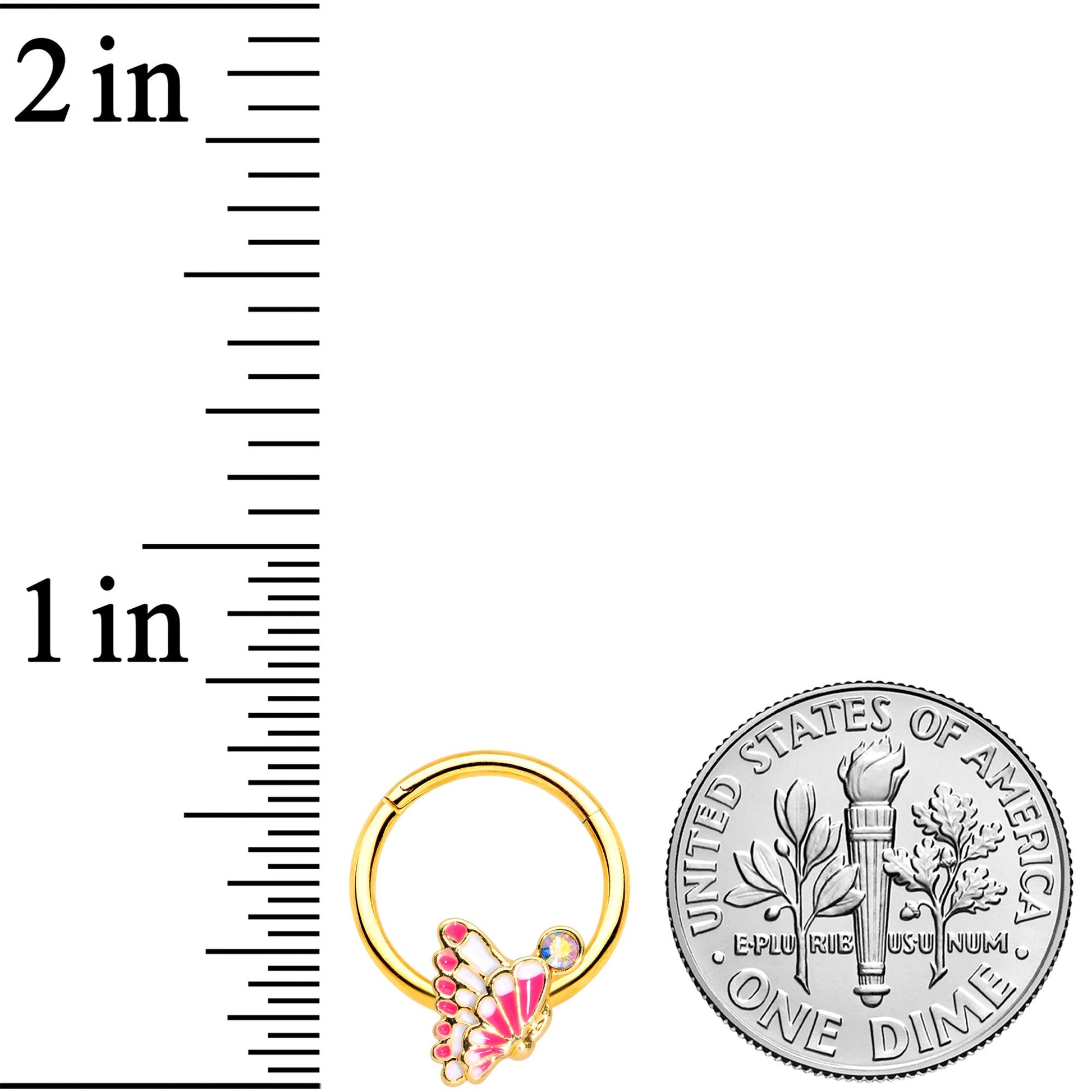 This 16 gauge cartilage jewelry will have you thinking of springtime all year long! It's made with a 10mm gold tone plated over 316L surgical grade stainless steel hinged circular ring. It features a pink and white butterfly charm with an aurora color gem. It also features a hinged, non-removal segment that makes insertion and removal a breeze and you can even rock this butterfly in multiple piercings including tragus, helix, and septum piercings. Go wild with this beautiful butterfly septum ring!Specifications