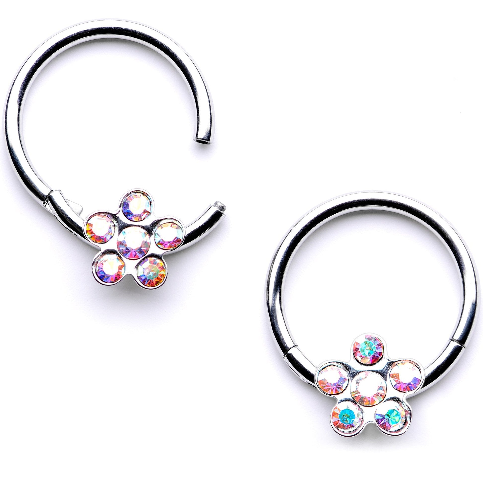 Exquisite design meets sophisticated taste on this striking segmented circular ring set. This pair of 16 gauge rings features a series of aurora gems arranged in a four petal flower shape. The five gem flower design is mounted on the hinged segment of these circular rings, which are made with 10mm durable 316L surgical grade stainless steel. These rings feature a hinged, non-removable segment for easy insertion and removal from your piercing. Grab this pair of universal rings to be worn in the cartilage, nipples, or whatever piercing is a perfect fit for you. Sold as a set of two for you!Specifications