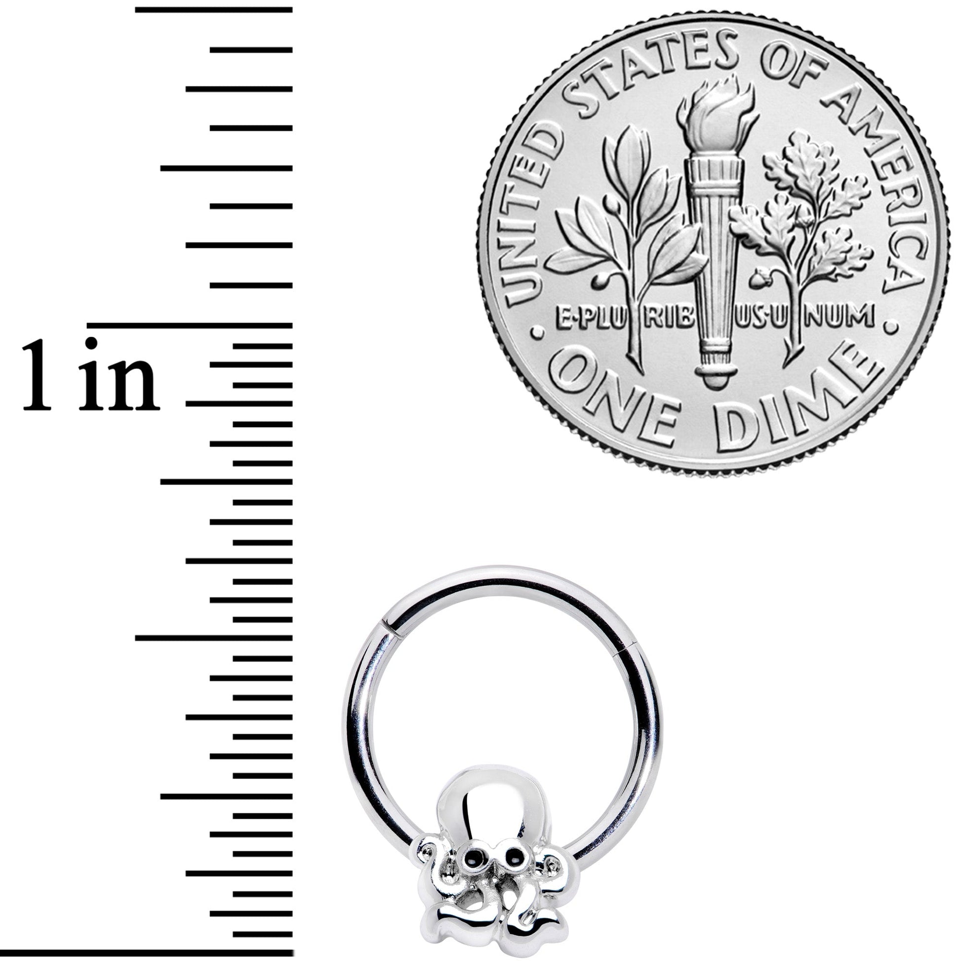 This octopus looks a bit creepy, like it was awoken from his slumber? This 16 gauge cartilage earring is made with 10mm durable 316L surgical grade stainless steel hinged circular ring. It features our fearsome creature, with tiny black gems. This type of cartilage ring has a non-removable hinged segment that makes it super easy to insert and remove. You'll love this feature because they work so well in multiple piercings including your septum as well as cartilage piercings like the helix, rook, daith, tragus and more. So if you swoon for sea creatures, this cartilage jewelry will be right at home in one of your piercings!Specifications