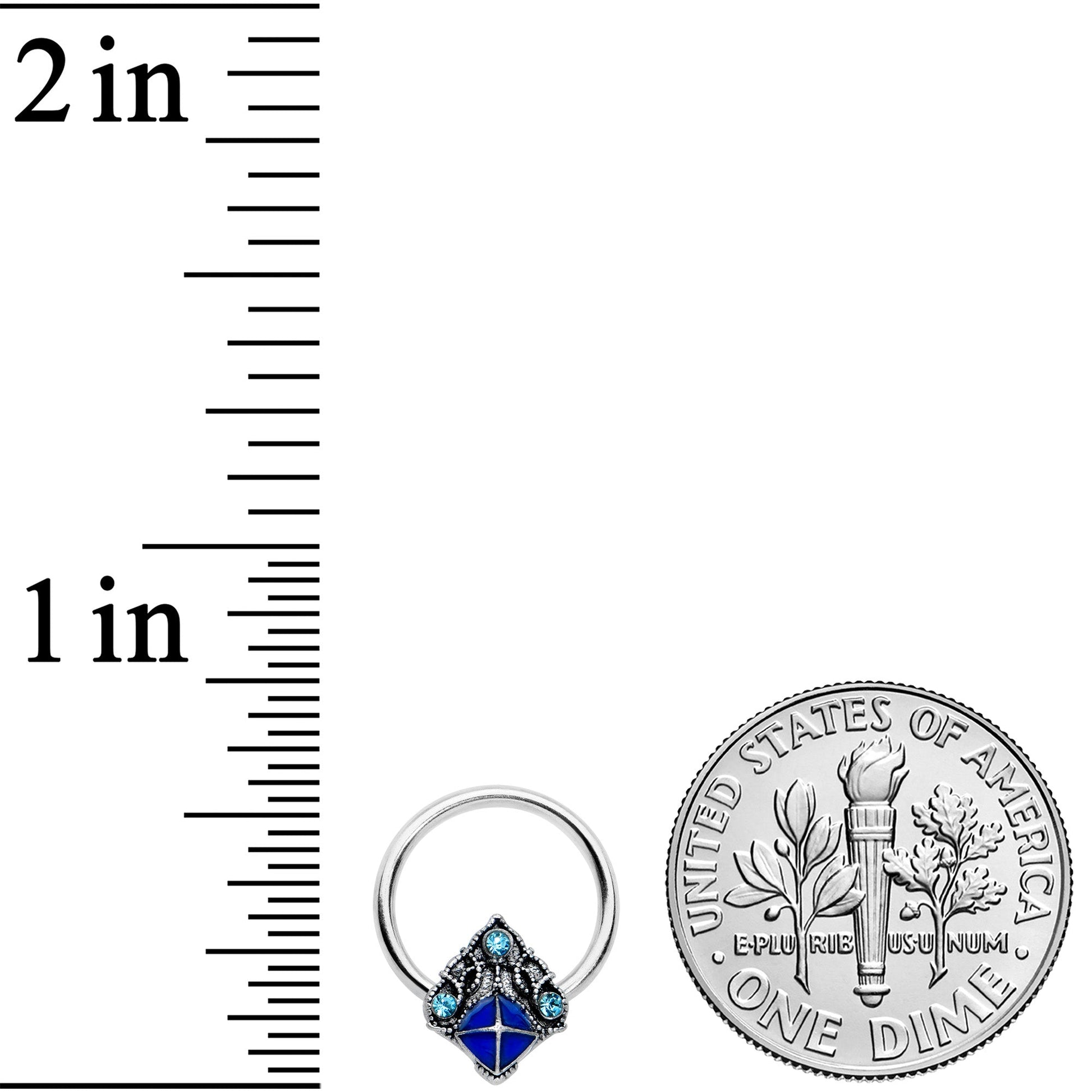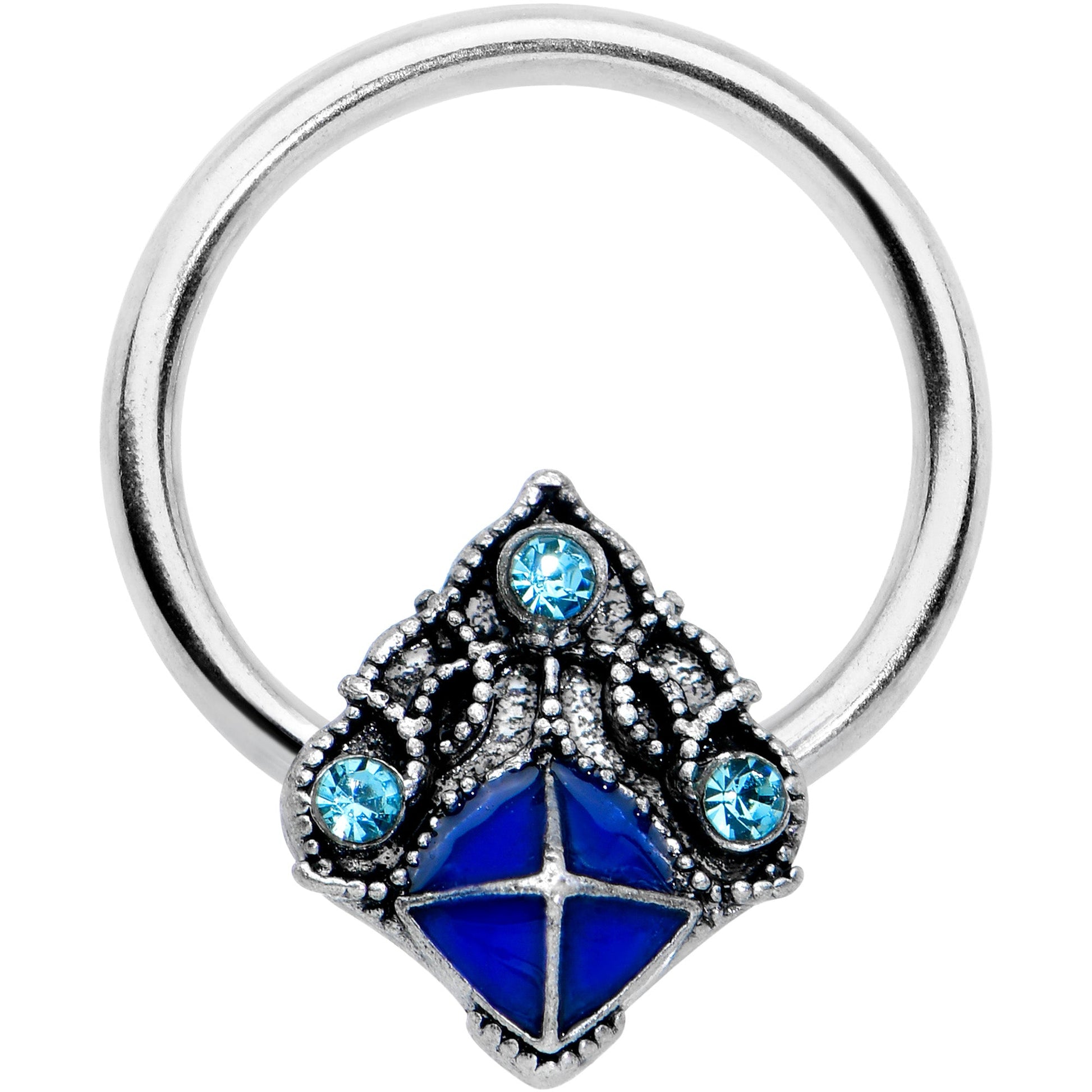 You'll be happy to sing the blues when you're rocking this 16 gauge septum ring! It's made with a 10mm durable 316L surgical grade stainless steel circular ring. It features a rhombus shape captive charm, set with a trio of blue gems and rococo embellishment along the top. Underneath it features darker blue inlay for color contrast. You can even rock it in multiple piercings including tragus, helix, and some daith piercings. You'll love having the blues with this opulent and elegant captive charm ring!Specifications