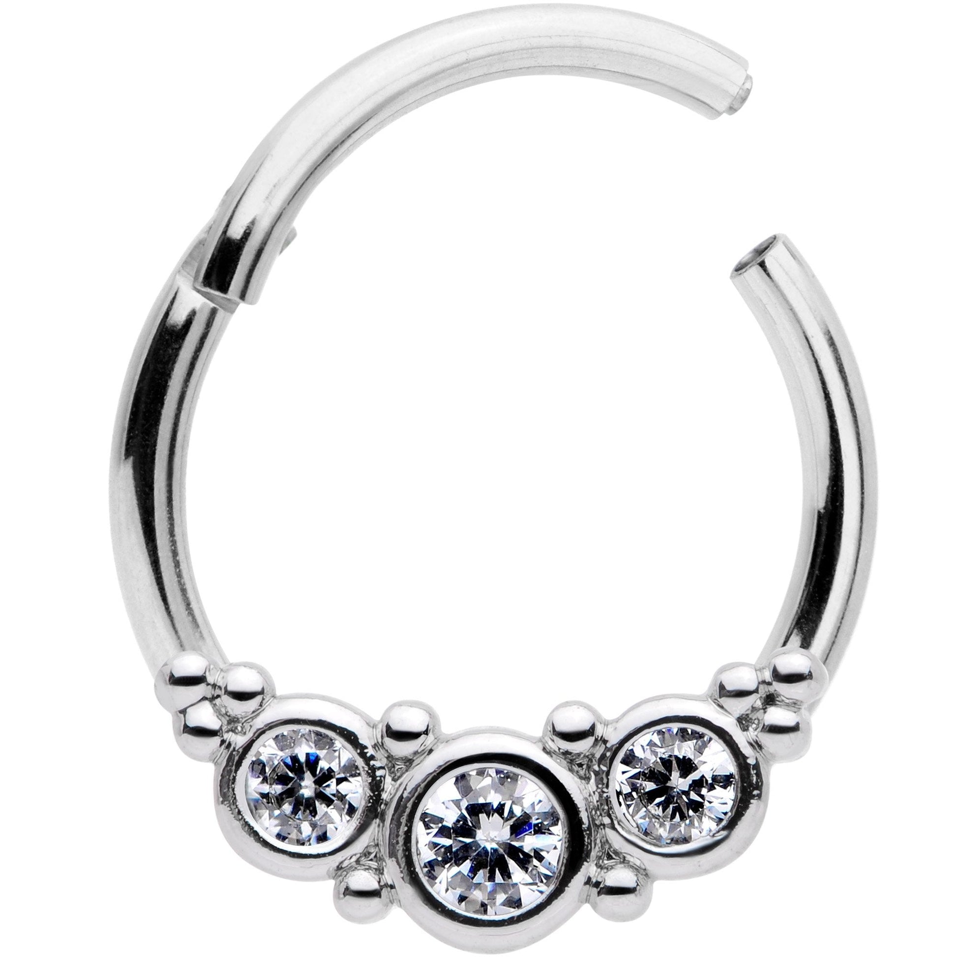 It's not just the bad things that come in threes - sometimes it's really wonderful things like this 16 gauge cartilage ring! It's made with a 10mm durable 316L surgical grade stainless steel hinged circular ring and features a charm of three round clear cubic zirconias. It also features a non-removable hinged segment for easy insertion and removal which is perfect because this ring works well in multiple piercings including cartilage piercings like the helix, tragus, daith, and rook, as well as the septum. Beauty, convenience, and multiple uses - three good reasons to grab this circle trio segment ring!Specifications