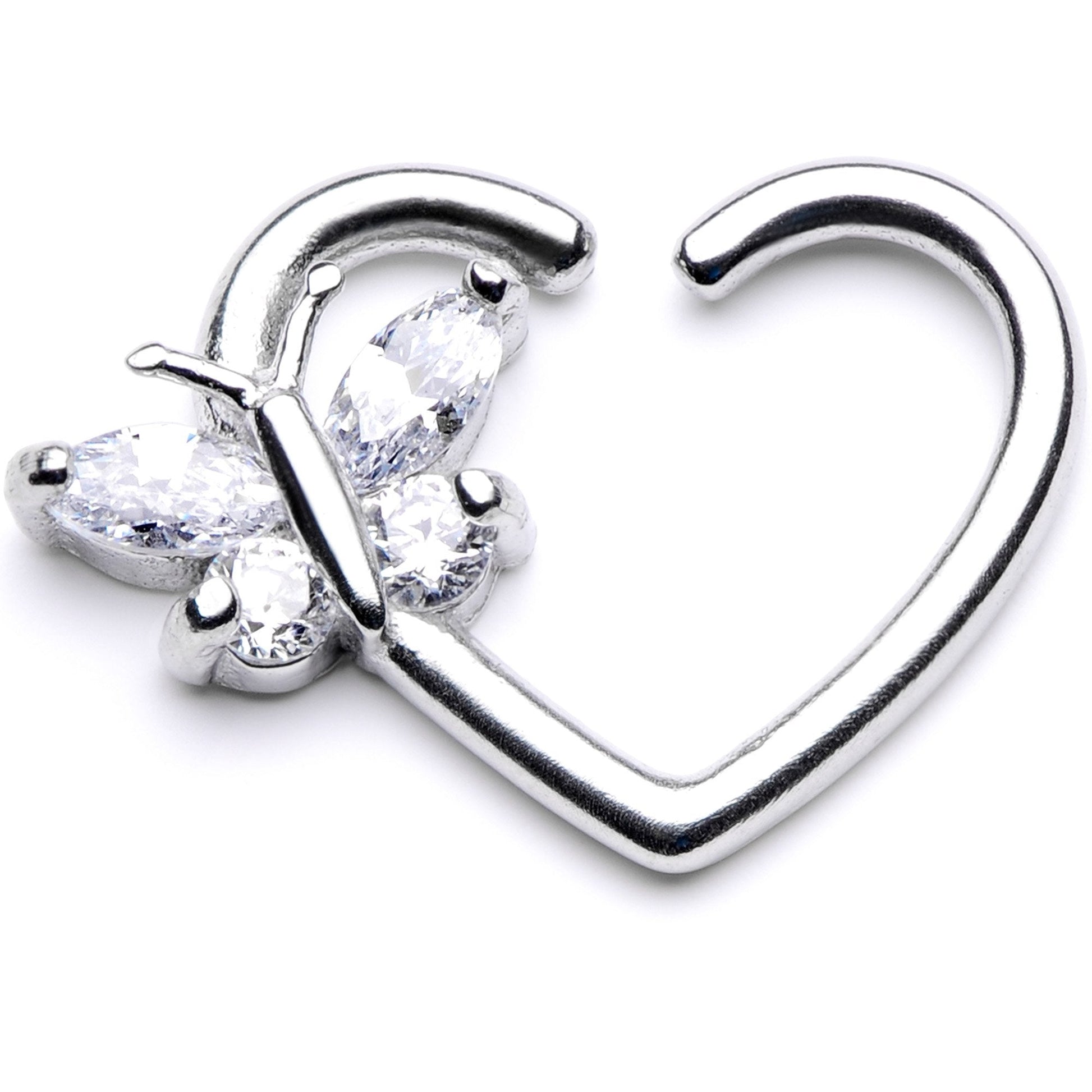 Feel free like a summer butterfly when you wear this fun heart-shaped closure ring. On one side of this heart-shaped closure ring is a fluttering butterfly made with clear cubic zirconia gems. Designed to be worn in the right ear, this beautiful heart-shaped ring is made with durable 316L surgical grade stainless steel. To use, twist the ends slightly and gently pull away to insert into your piercing. This cartilage earring is perfect for wearing in a variety of ear piercings including the helix, tragus, rook, and daith!Specifications