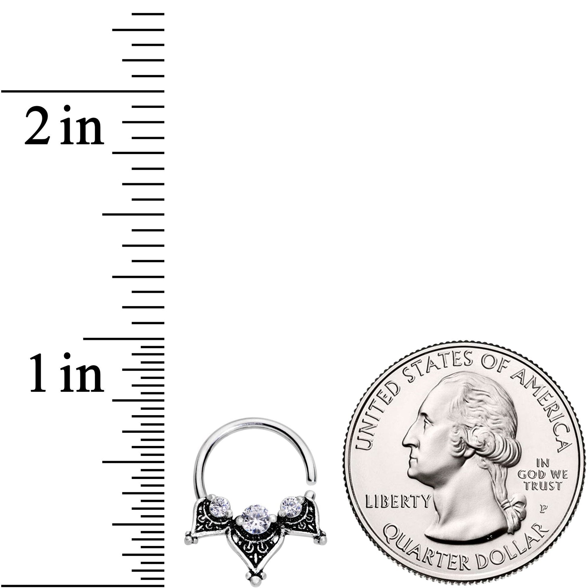 Don't wait to deck out your septum piercing! Do it now with this 16 gauge septum ring that has tons of style! Made with an 8mm 316L surgical grade stainless steel circular ring, this nose ring features three clear gems and a triad of triangle details that can be worn in a variety of piercings including cartilage, helix, and more. Simply twist gently open, insert, and twist shut again.Specifications