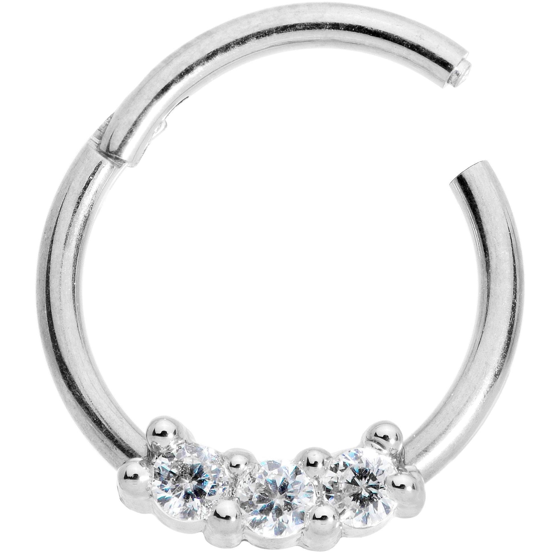 This 16 gauge segment jewelry is the perfect balance between simplicity and seriously sumptuous style. It's made with a 10mm durable 316L surgical grade stainless steel circular barbell and features three clear cubic zirconia gems. It's elegant without being plain and eye-catching without being overwhelming. And best of all, it features a non-removable hinged segment that allows for incredibly easy insertion and removal. If you love the look of hoop jewelry in your piercings but don't want to use a captive bead ring, this is your solution! This universal ring works wonderfully in multiple piercings including the septum, daith, tragus, helix, rook, and more making this feature one that you're going to love!Specifications