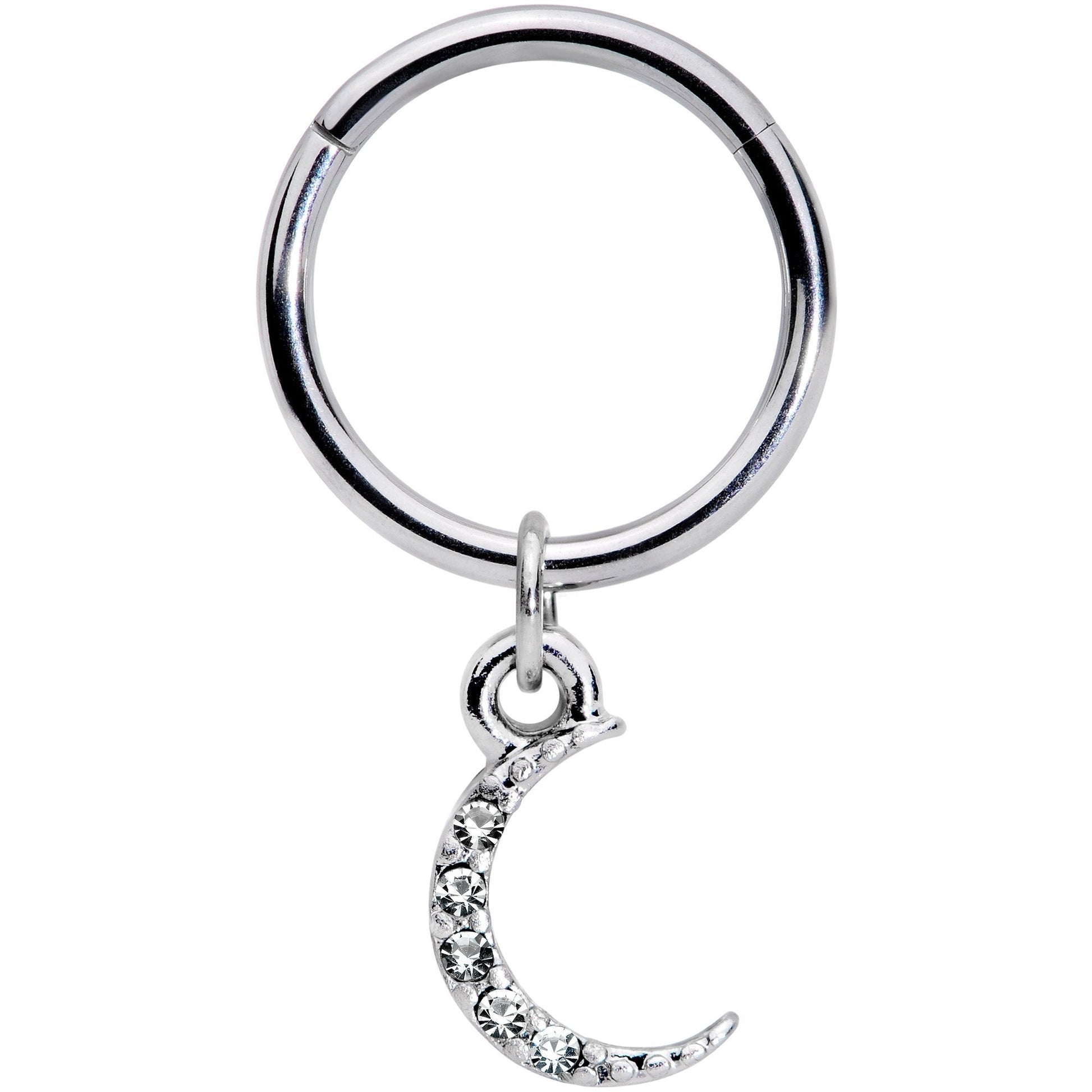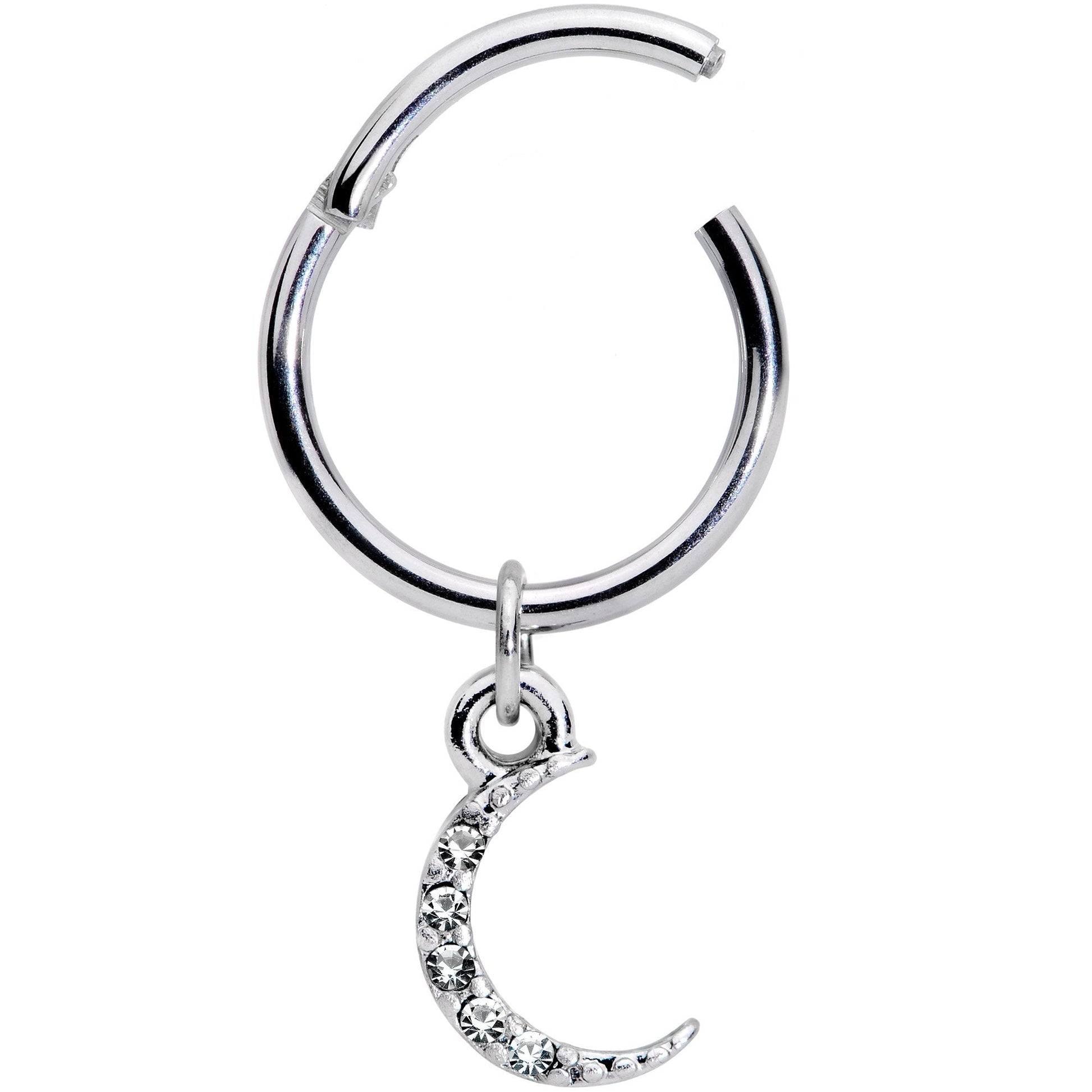 We've all looked up at the moon at night and been awed by the beauty of the universe, but now you can have a piece of that awe-inspiring beauty for yourself! This 16 gauge cartilage ring is made with a 10mm durable 316L surgical grade stainless steel hinged circular ring. It features a dangle that's shaped like the narrowest of waning crescent moons, paved with clear gems for a look of true celestial splendor. The ring itself features a non-removable hinged segment that makes it super easy to insert and remove. You'll love that because it works so well in multiple piercings including daith, tragus, and helix. This cartilage ring proves you can be a moon and a star at the same time!Specifications