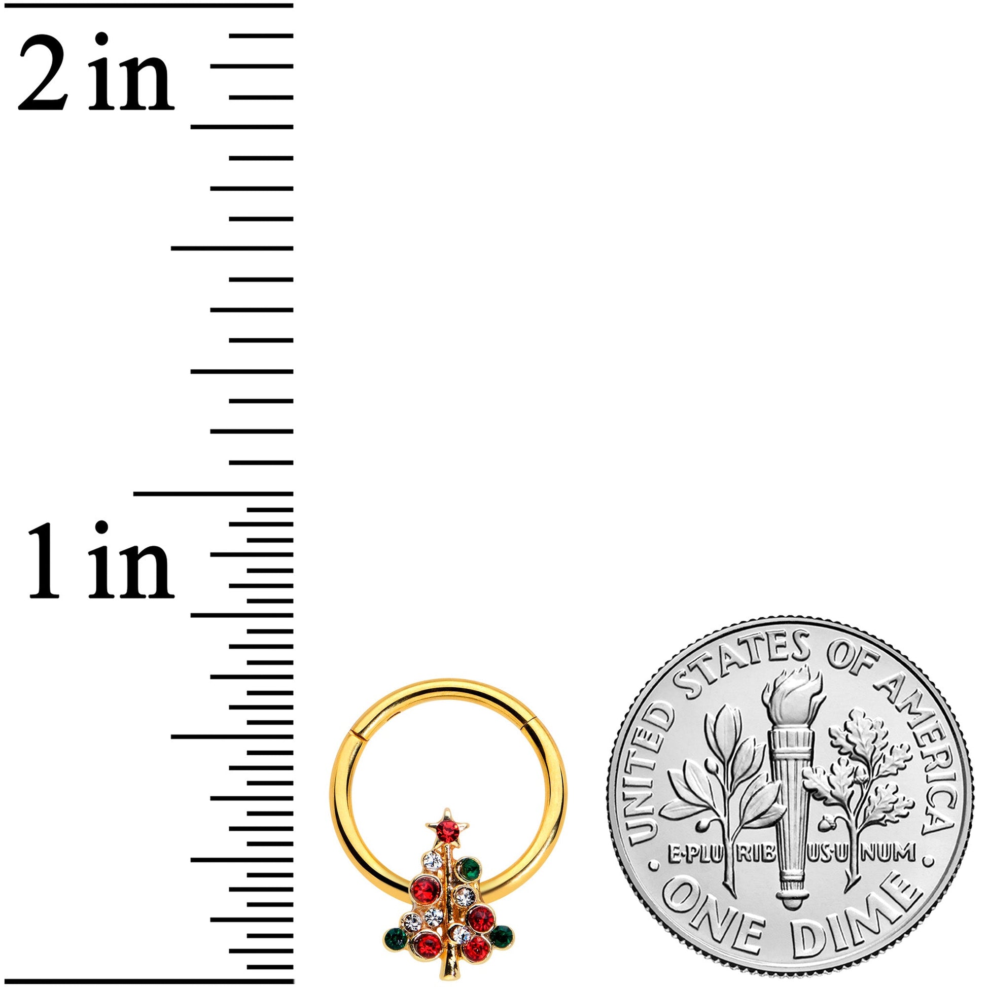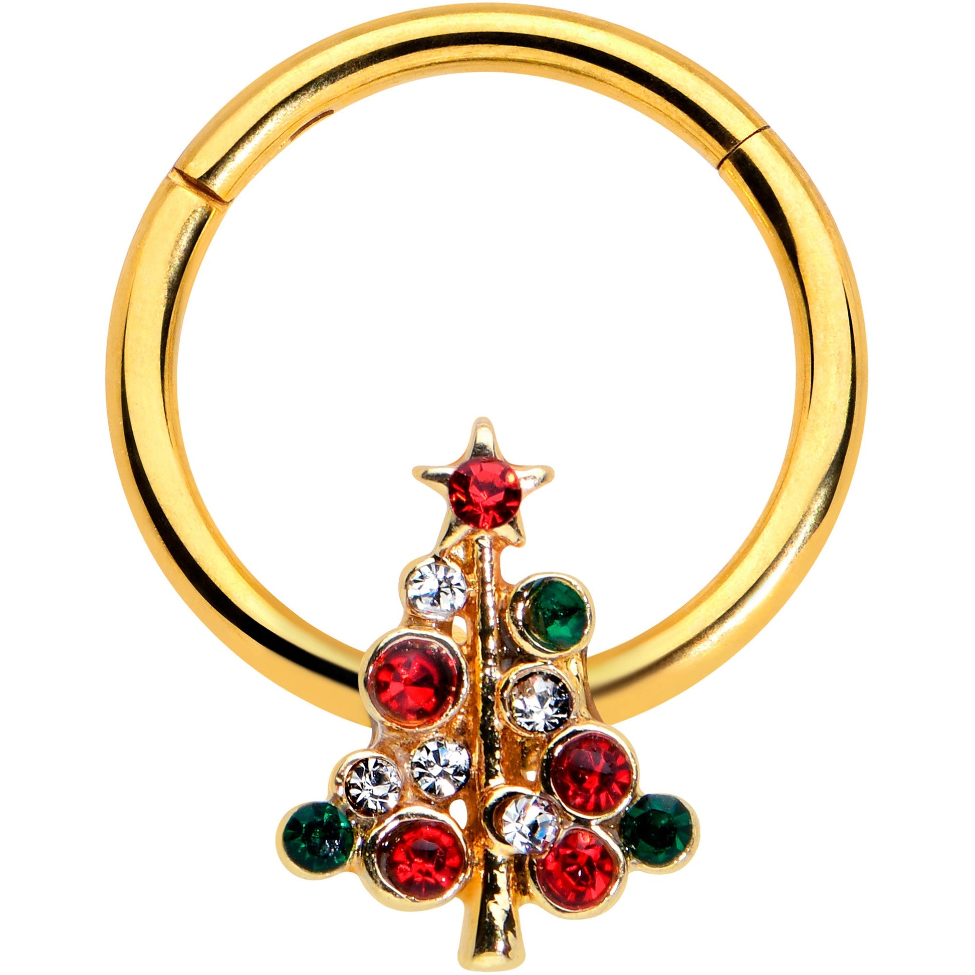 Oh, Christmas tree, you look so lovely on this 16 gauge septum ring! It's made with a 10mm gold tone PVD over 316L surgical grade stainless steel hinged circular ring. It features a Christmas tree charm, composed of festive green, red, and clear gems. It's even topped with a tiny star, which is set with a tiny red gem. It also features a hinged, non-removable segment that makes insertion and removal a snap and you can wear it in multiple piercings including tragus, helix, and septum. Your look will be all about a merry Christmas with this colorful, festive cartilage jewelry.Specifications
