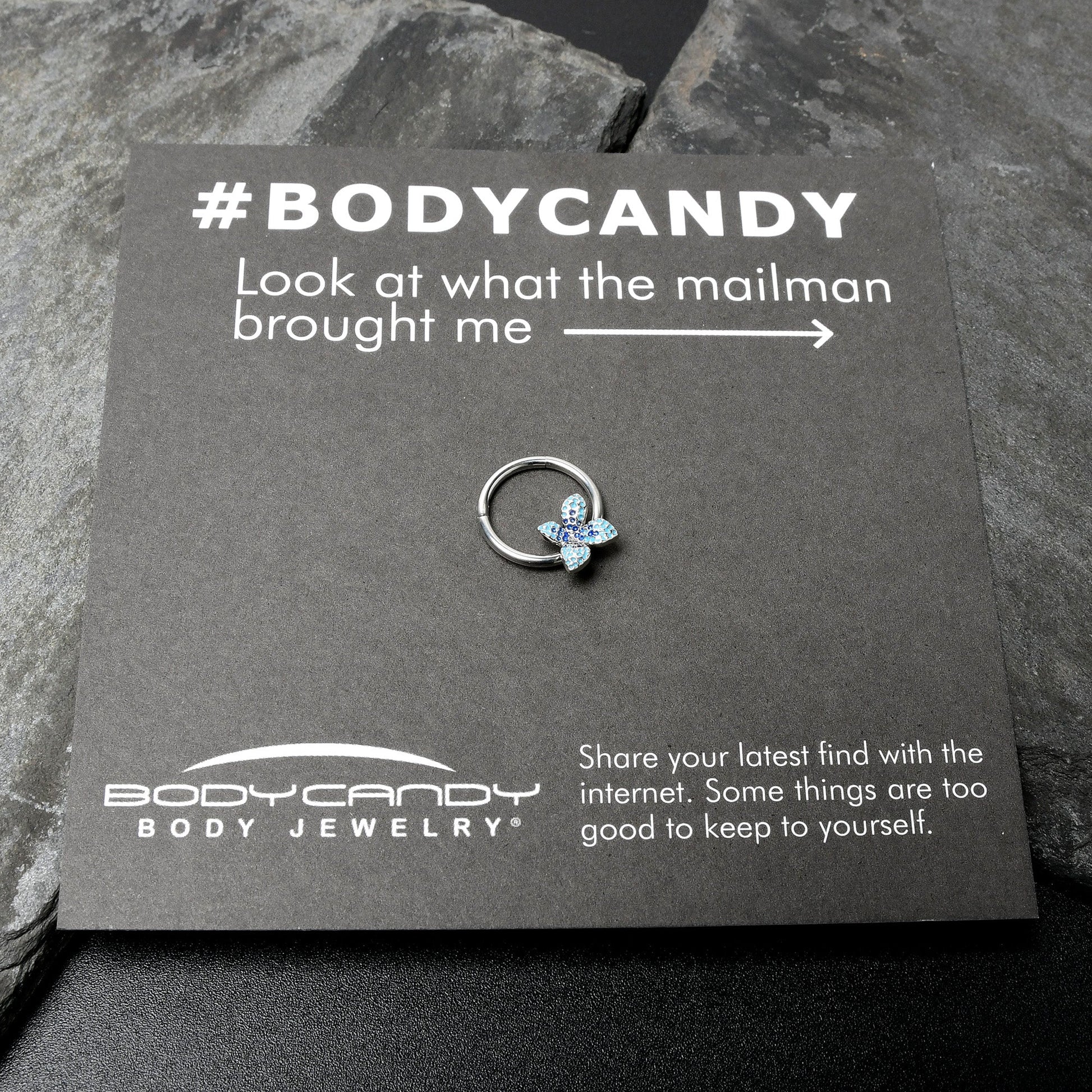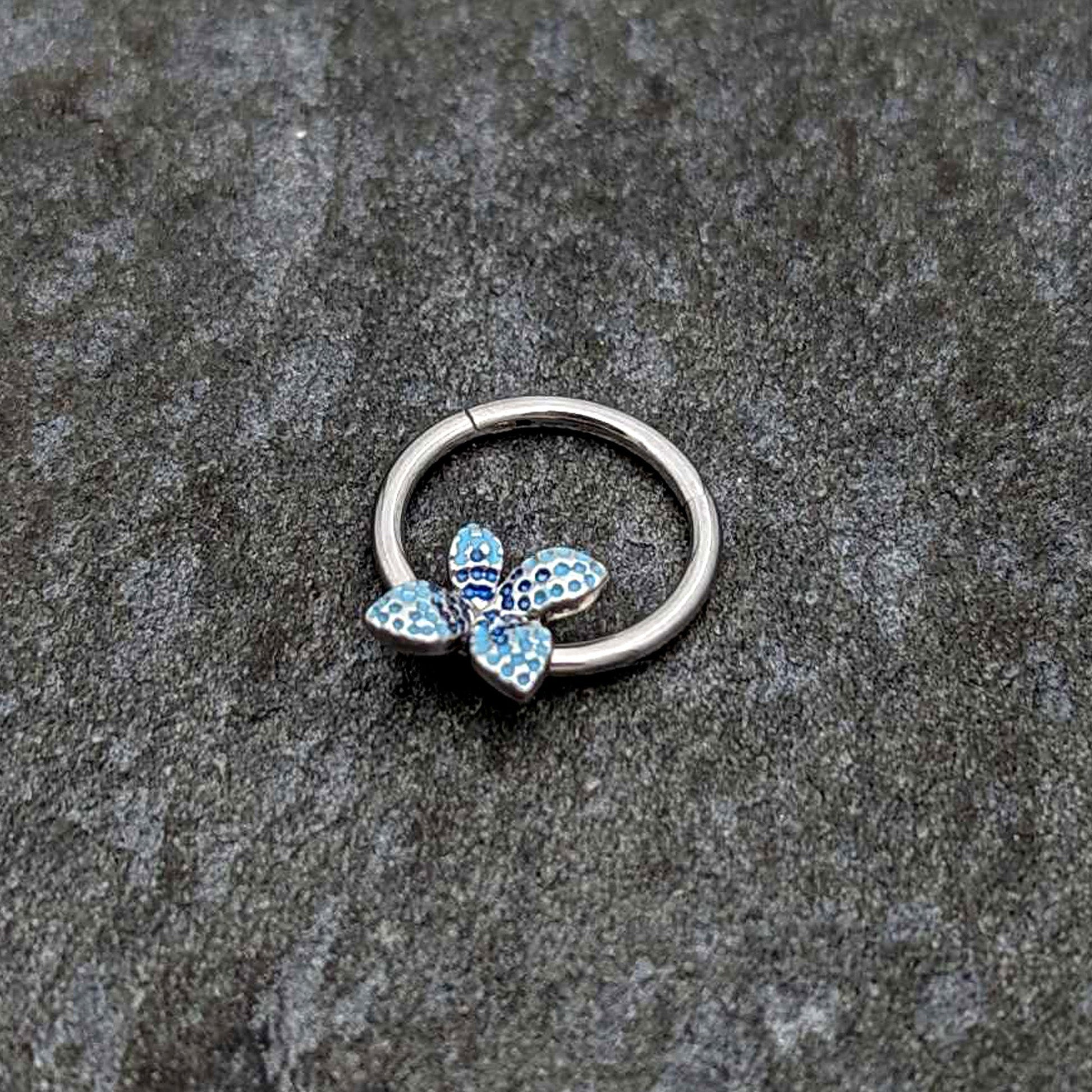 The colorful butterfly on this 16 gauge septum ring is going to steal your heart. It is made with a 10mm durable 316L surgical grade stainless steel hinged circular ring. It features a butterfly charm, embellished with inlay in shades of blue for a truly glam style. It also features a non-removable, hinged segment that makes insertion and removal a breeze and you can rock it in multiple piercings including tragus, helix, and some daith piercings. The overall look is colorful, unique, and truly eye-catching. This is one cartilage piercing ring that will be in your heart forever.Specifications