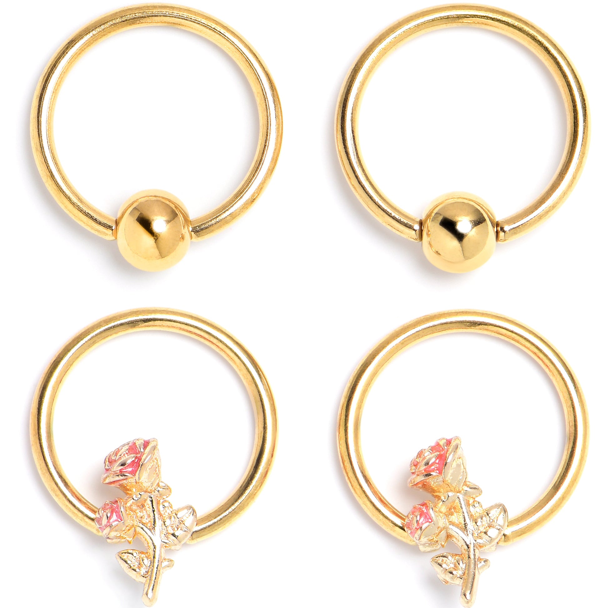 Whether you have a lot of piercings or like a cohesive look, this set of 16 gauge septum rings has you covered. They are made with 10mm gold tone anodized over 316L surgical grade stainless steel circular rings. Two have simple matching captive beads for a classic appearance. The other two feature captive rose charms, with the flowers embellished with pink detailing. They feature a captive design for secure wear and you can even rock these in multiple piercings including helix, daith, and some conch piercings. You will be ready for anything with this fun and floral cartilage piercing jewelry. Sold as a set of four.Specifications