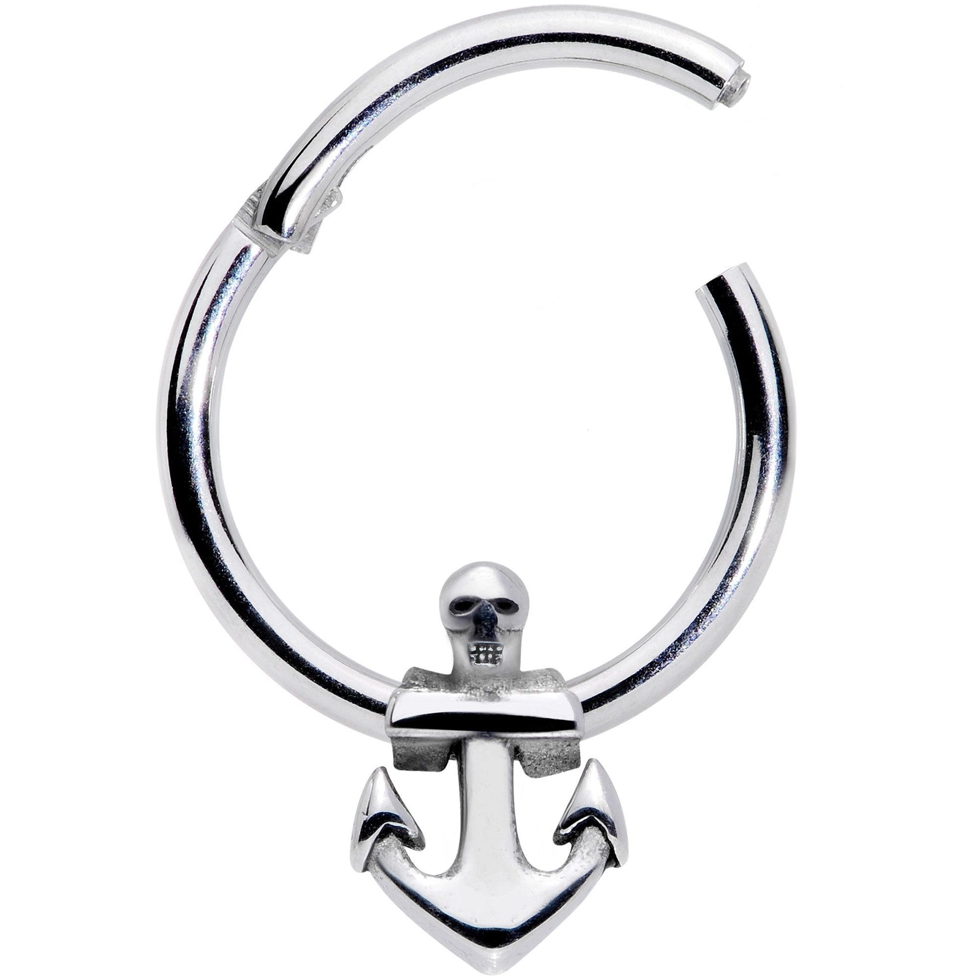 If you're looking for something unique for your septum piercing or cartilage this 16 gauge septum ring is what you're looking for! It's made with a 10mm durable 316L surgical grade stainless steel hinged circular ring. The tragus ring features a nautical anchor charm and a non-removable hinged segment that makes it super easy to insert and remove. You'll love this feature because it works so well in so many piercings including your septum and cartilage piercings like the tragus, rook, helix, and daith.Specifications