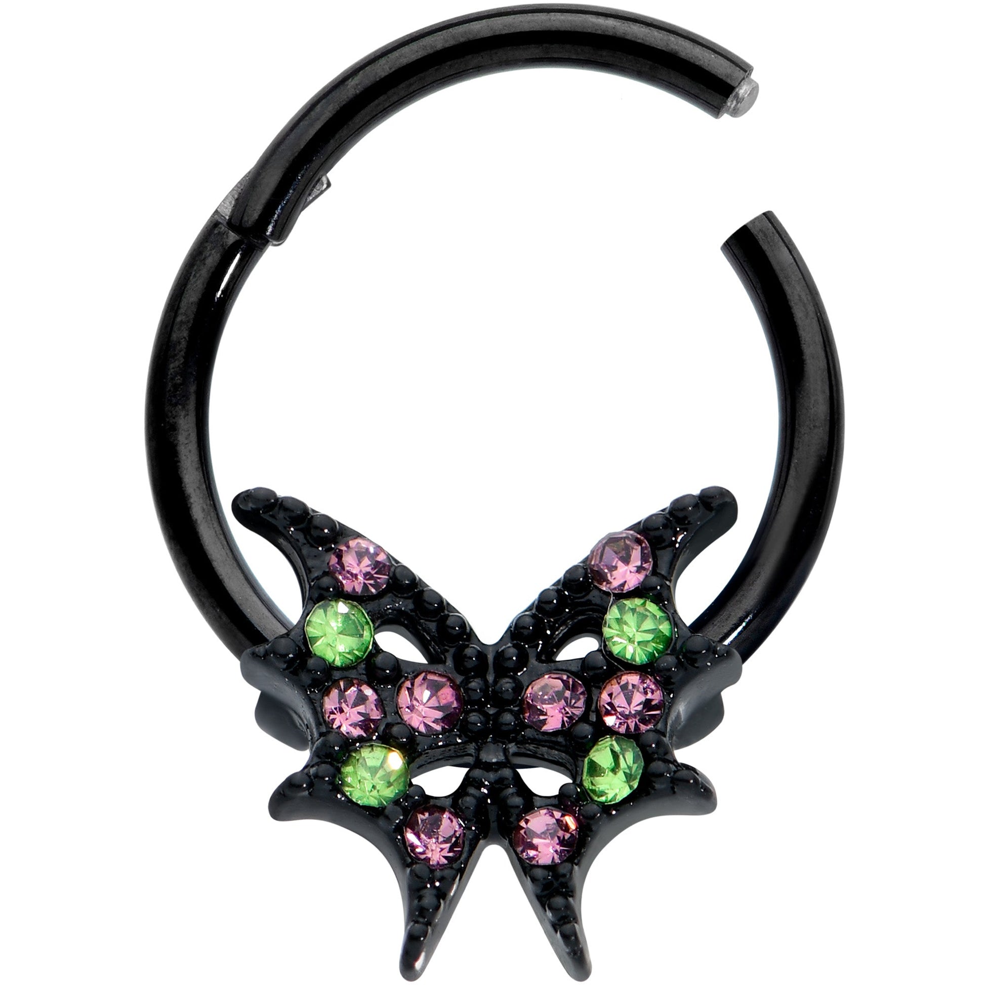 Even a creature of the night needs a touch of style like on this 16 gauge septum ring! It's made with a 10mm black PVD over 316L surgical grade stainless steel hinged circular ring. It features a bat wing charm, with strikingly angular lines. The wing is paved with pink and green gems and features a non-removable, hinged segment that makes insertion and removal a breeze. It can also be worn in multiple piercings including septum, tragus, and helix piercings. If you want to have a truly haunting look, this stylish bat wing cartilage piercing jewelry is sure to get you there!Specifications