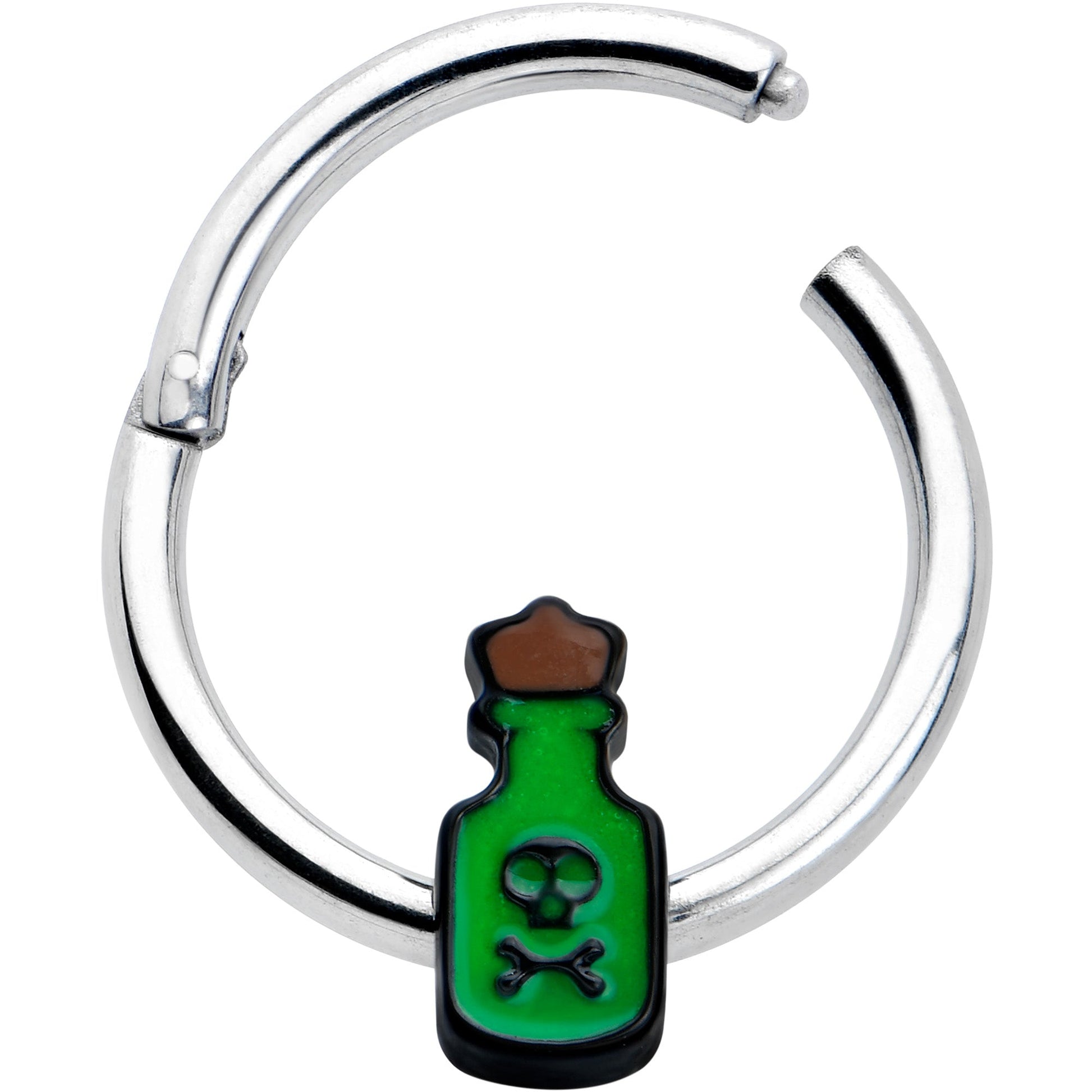 Give your cartilage piercings an unearthly Halloween glow with this 16 gauge septum ring! It's made with a 10mm durable 316L surgical grade stainless steel hinged circular ring. It features a green poison bottle charm, with a skull and crossbones marking in black. The bottle glows when the lights go out for a creepy cute look you'll love! It also features a hinged, non-removable segment that makes insertion and removal a breeze and you can rock it in multiple piercings including tragus, helix, and some daith piercings! You'll be glowing with joy when you're rocking this spooky poison bottle cartilage piercing ring!Specifications