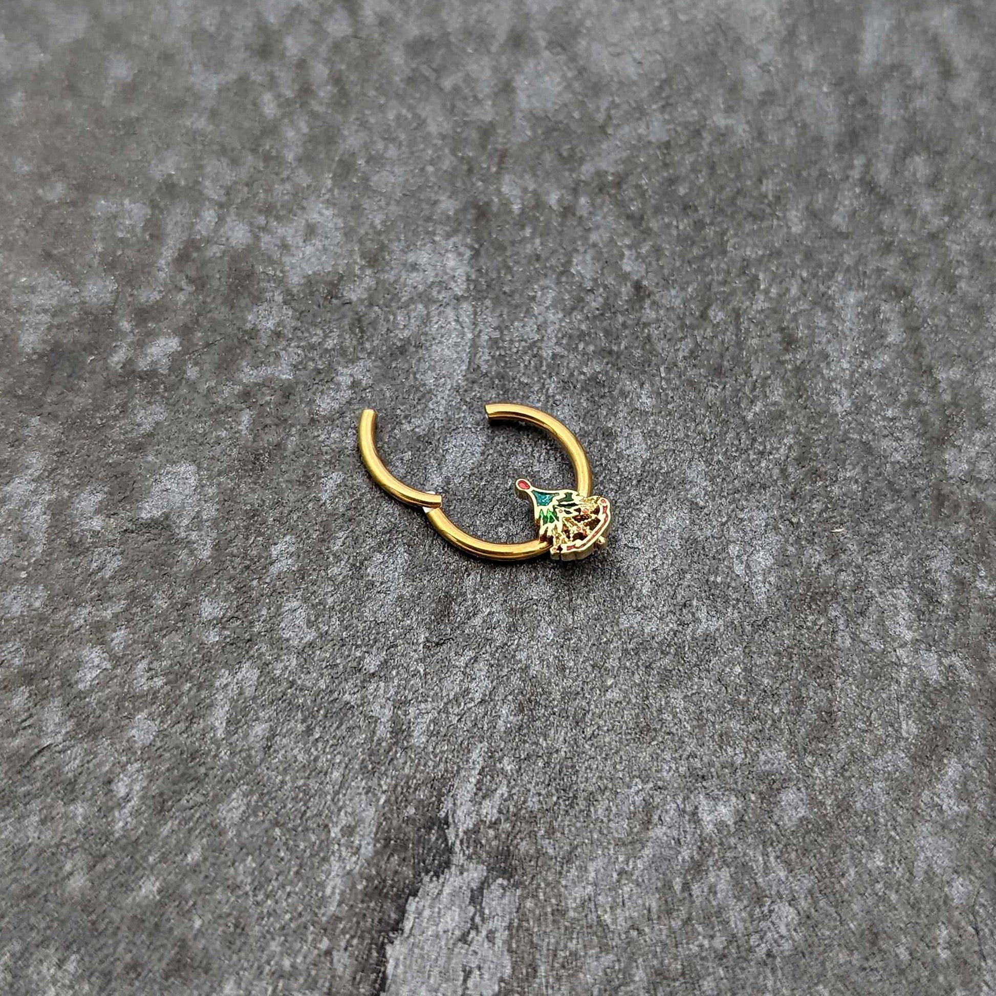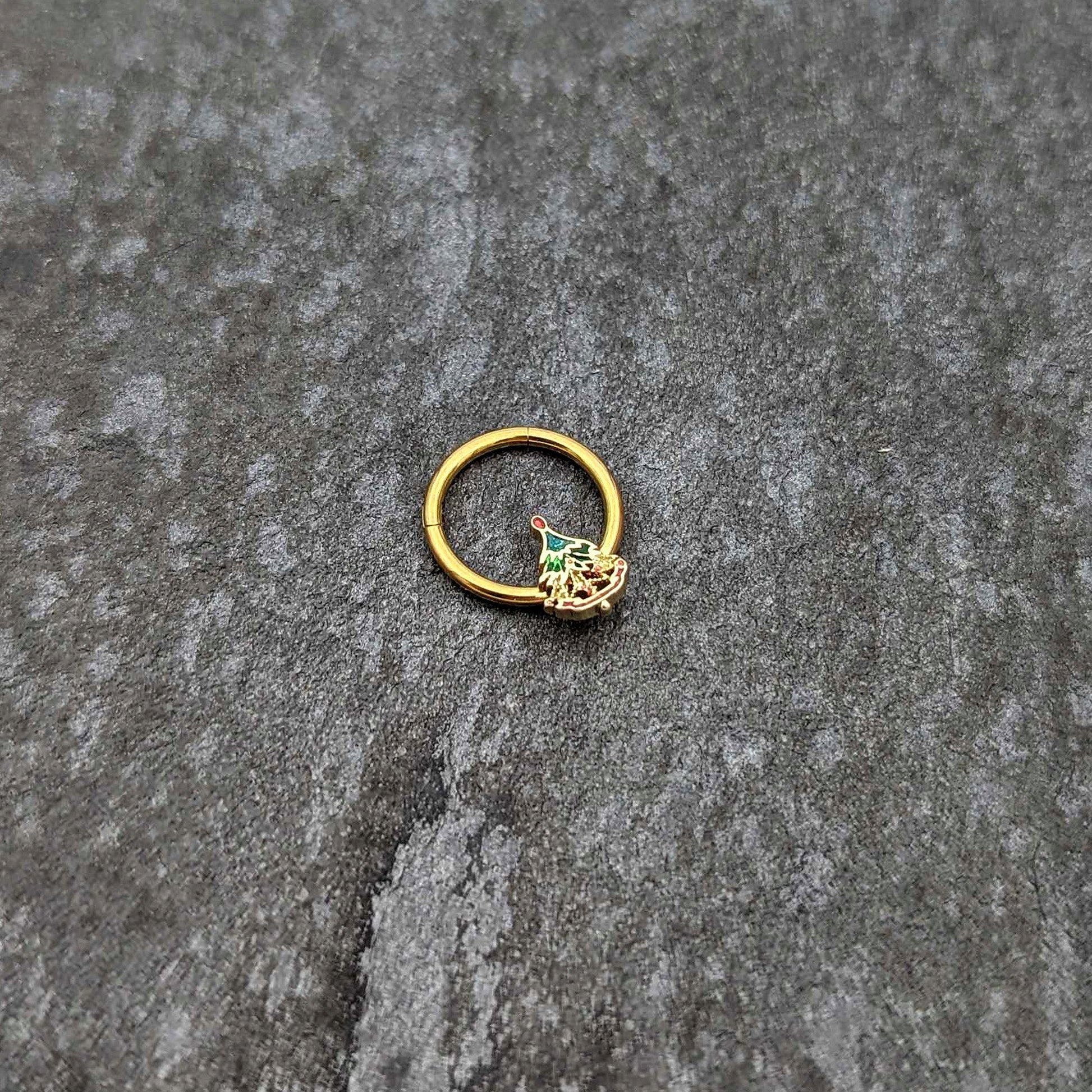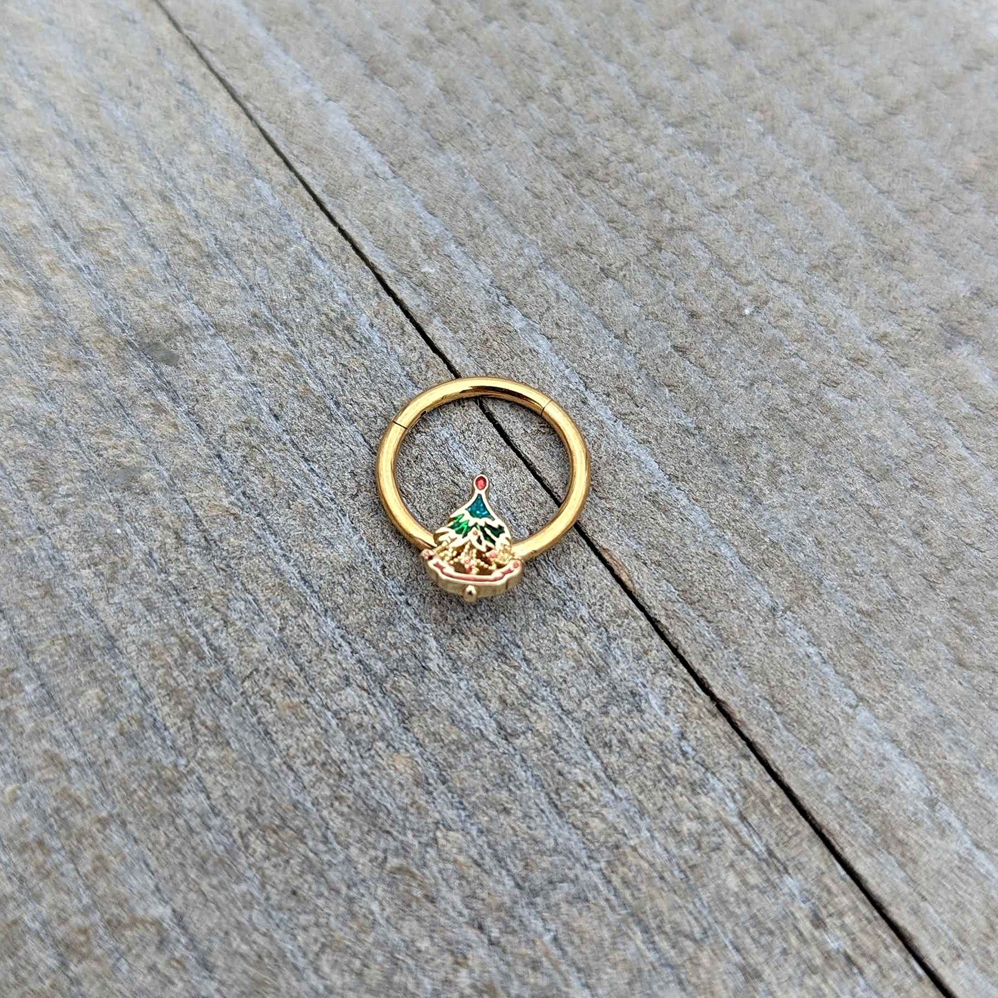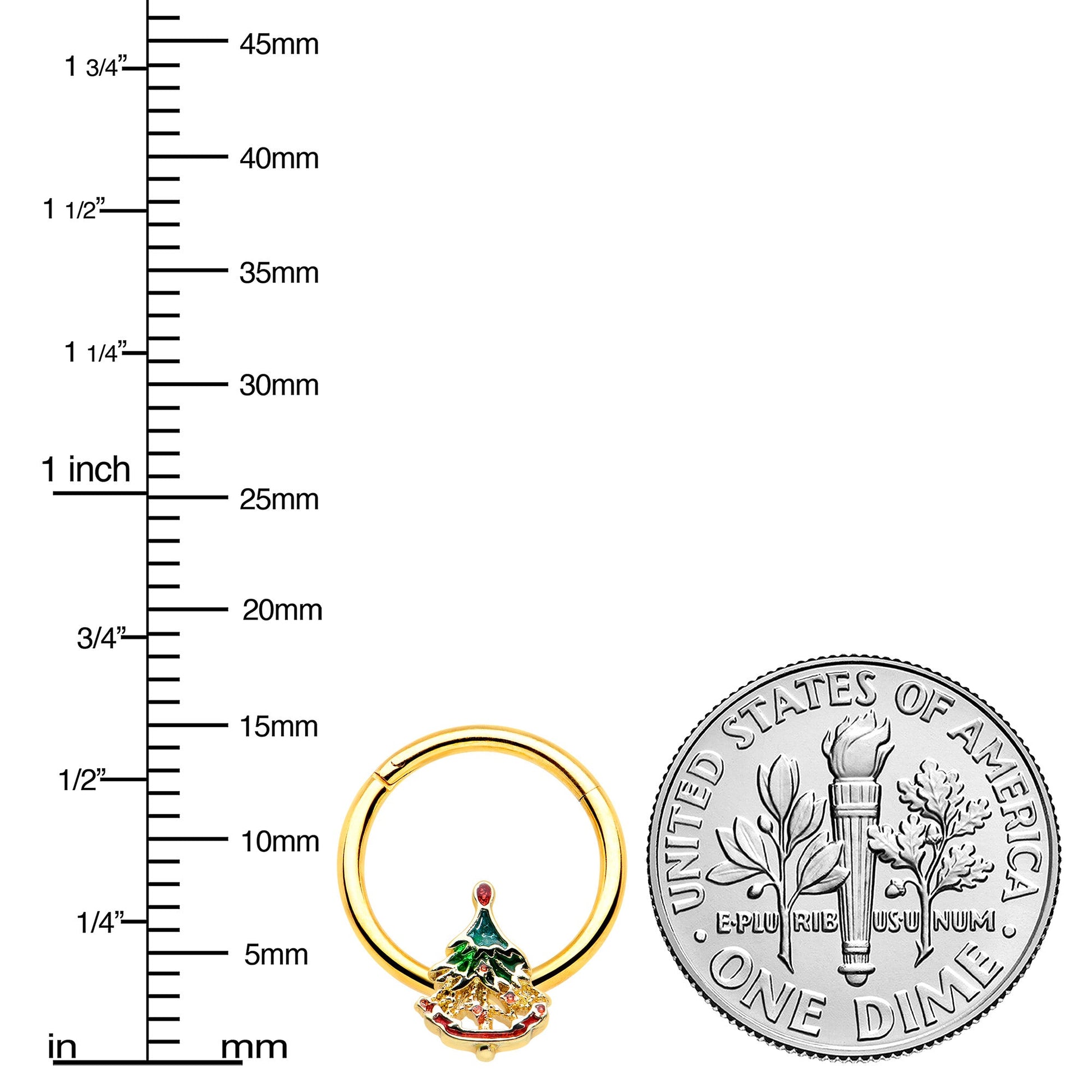 Deck your piercings with this 16 gauge septum ring! It's made with a 10mm gold tone PVD over 316L surgical grade stainless steel hinged circular ring. It features a festive Christmas tree charm, with green and blue inlay. It's further embellished with red gem orbs and a red gem inlaid star on top. It also features a non-removable, hinged segment that makes insertion and removal a breeze and you can rock this tree around multiple piercings including tragus, helix, and some daith piercings. You'll be feeling fabulous and festive when you're rocking this Christmas cartilage jewelry around!Specifications
