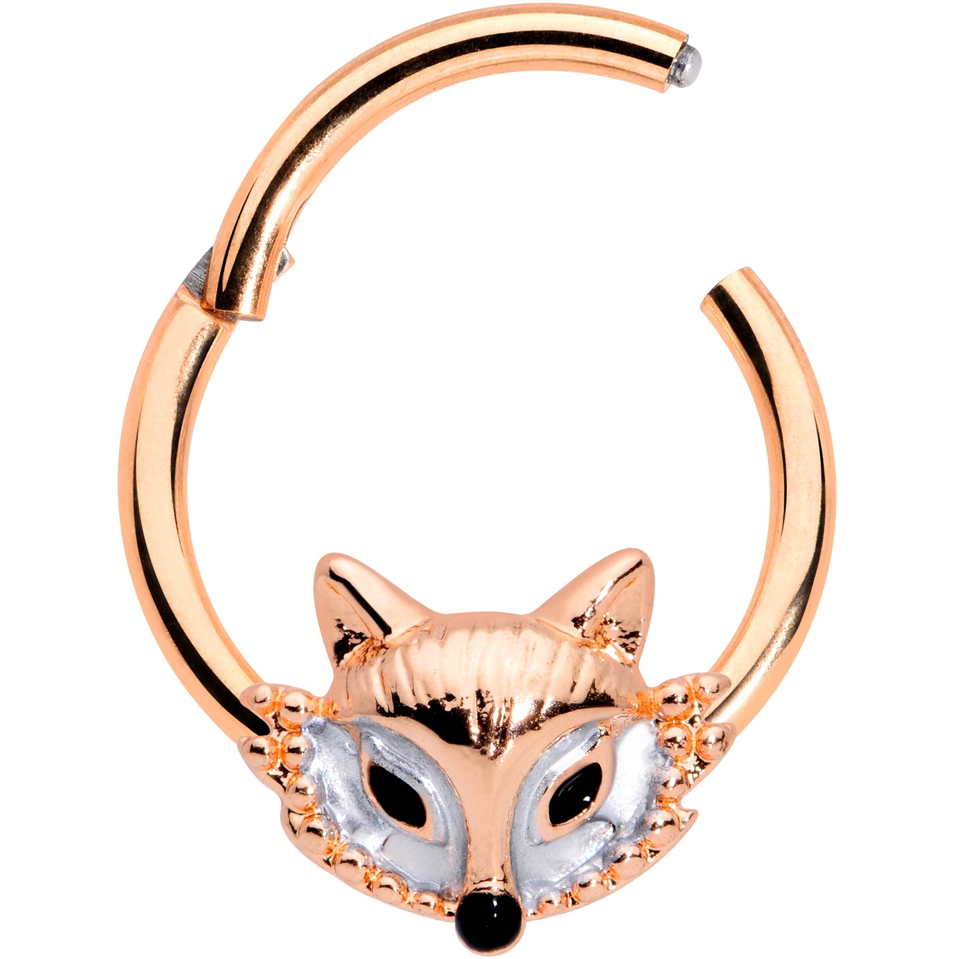 The fox on this 16 gauge cartilage jewelry will give your piercings a look that's absolutely fabulous! It's made with a 10mm rose gold tone PVD over 316L surgical grade stainless steel hinged circular ring. The front features the face of a fox charm. It has white embellishment around the eyes for maximum visual impact and black eyes and nose. It also features a non-removable, hinged segment that makes insertion and removal a cinch. You can even wear it in multiple piercings including tragus, helix, and septum piercings. This vulpine vixen is sure to add some foxy fashion to your cartilage piercings!Specifications