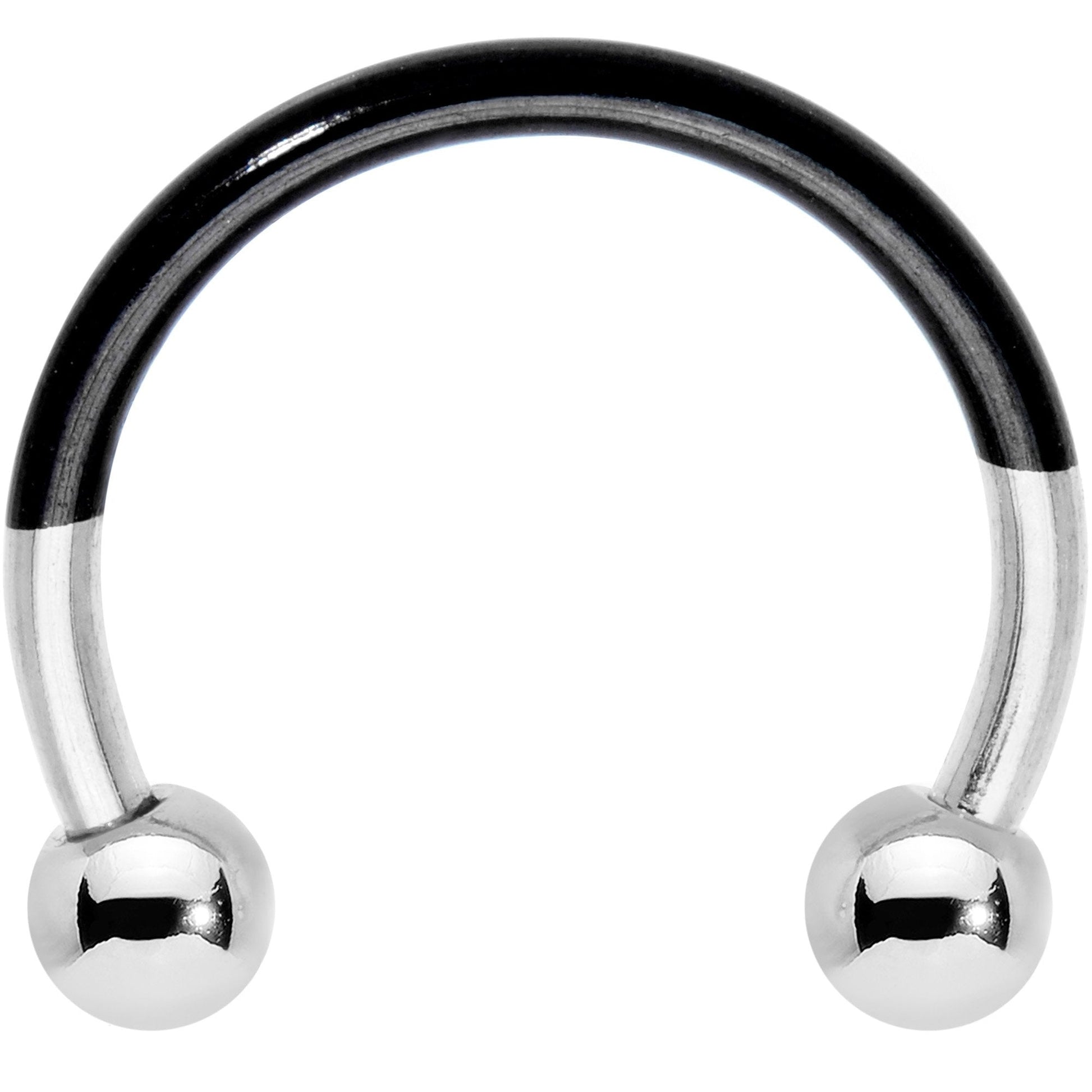 Add some style to that boring horseshoe barbell ring. This 14 gauge horseshoe barbell jewelry is made with a half black anodized titanium over 316L surgical grade stainless steel and half 316L surgical grade stainless steel curved barbell for a cool two-tone look. The curved barbell is 3/8" in length and features a 3mm ball ends. Collect each color combination!Specifications