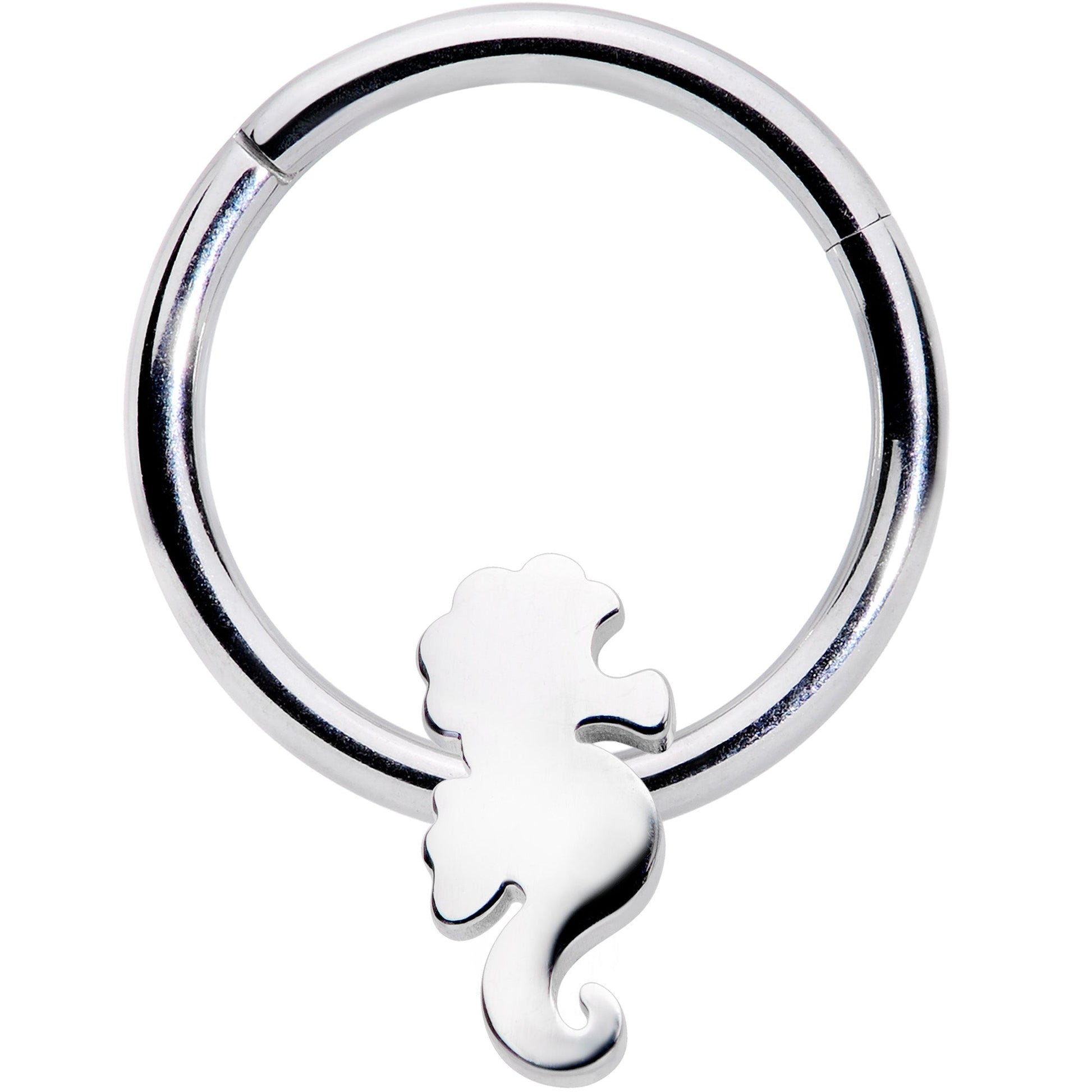 Whether you're obsessed with the ocean or smitten with seahorses, this cartilage earring is going to be perfect for you! The 16 gauge cartilage ring is made with a 10mm durable 316L surgical grade stainless hinged circular ring. It features a seahorse charm with unmistakable details like the critter's snout, fins, and tail. The septum ring features a non-removable hinged segment that makes it super easy to insert and remove. You're going to love that because it works so well in multiple piercings including cartilage piercings like the helix, tragus, daith, and rook as well as the septum. Give your piercings a marine look with this seahorse segment ring!Specifications