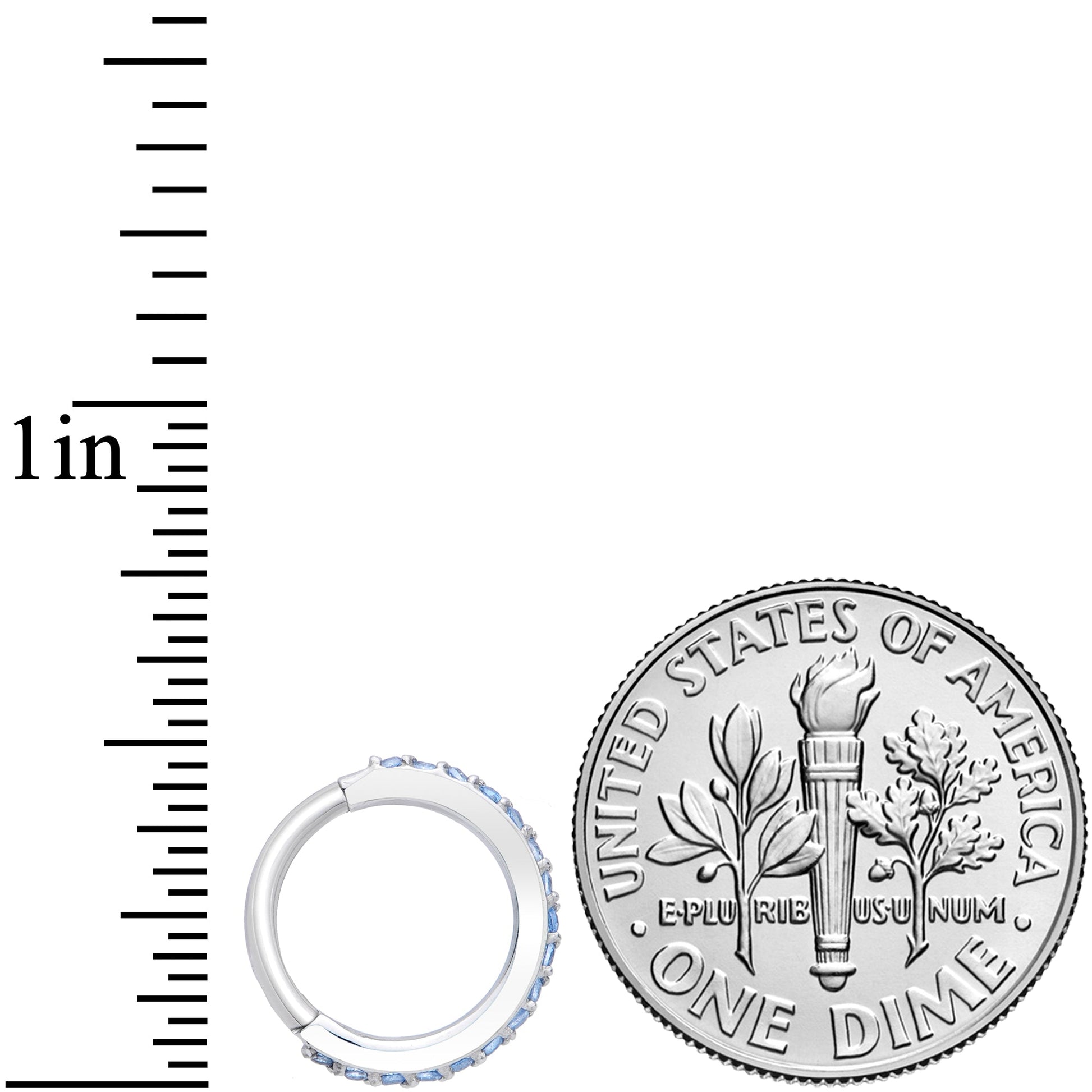 Add a touch of simple glamour to your cartilage piercings with this 16 gauge clicker ring! It's made with an 8mm durable 316L surgical grade stainless steel hinged circular ring. The rim is paved all the way around with tiny blue cubic zirconia gems for a look that is luxurious. It also features a hinged, non-removable segment that makes it easier to insert and remove. This feature is one you'll love because it works so well in multiple cartilage piercings including the helix, daith, tragus, rook, and more. Add some sumptuous style to the cartilage piercing of your choice with this gorgeous glamorous cartilage ring!Specifications