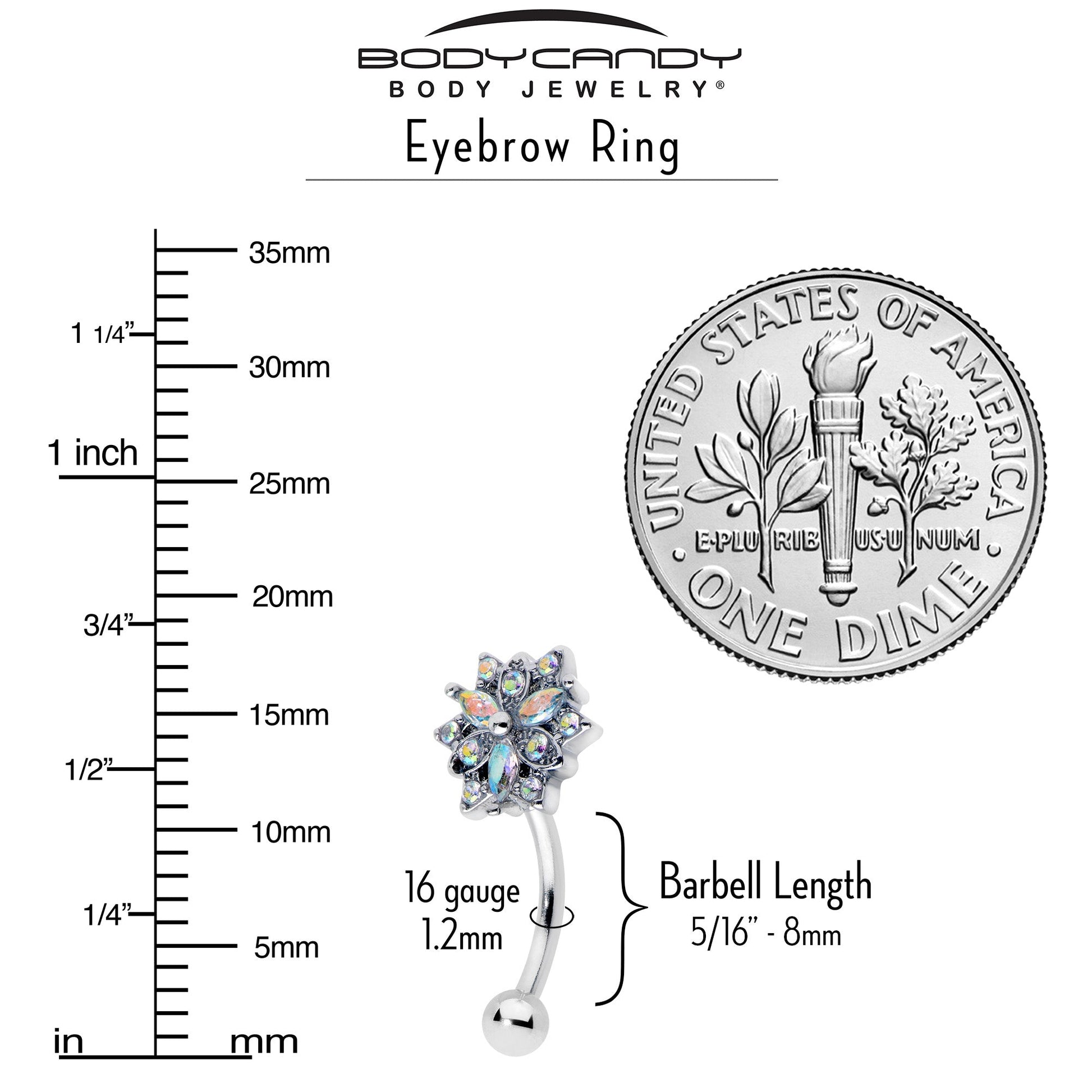 16G 5/16 Aurora CZ Gem Snowflake Style Curved Eyebrow Ring