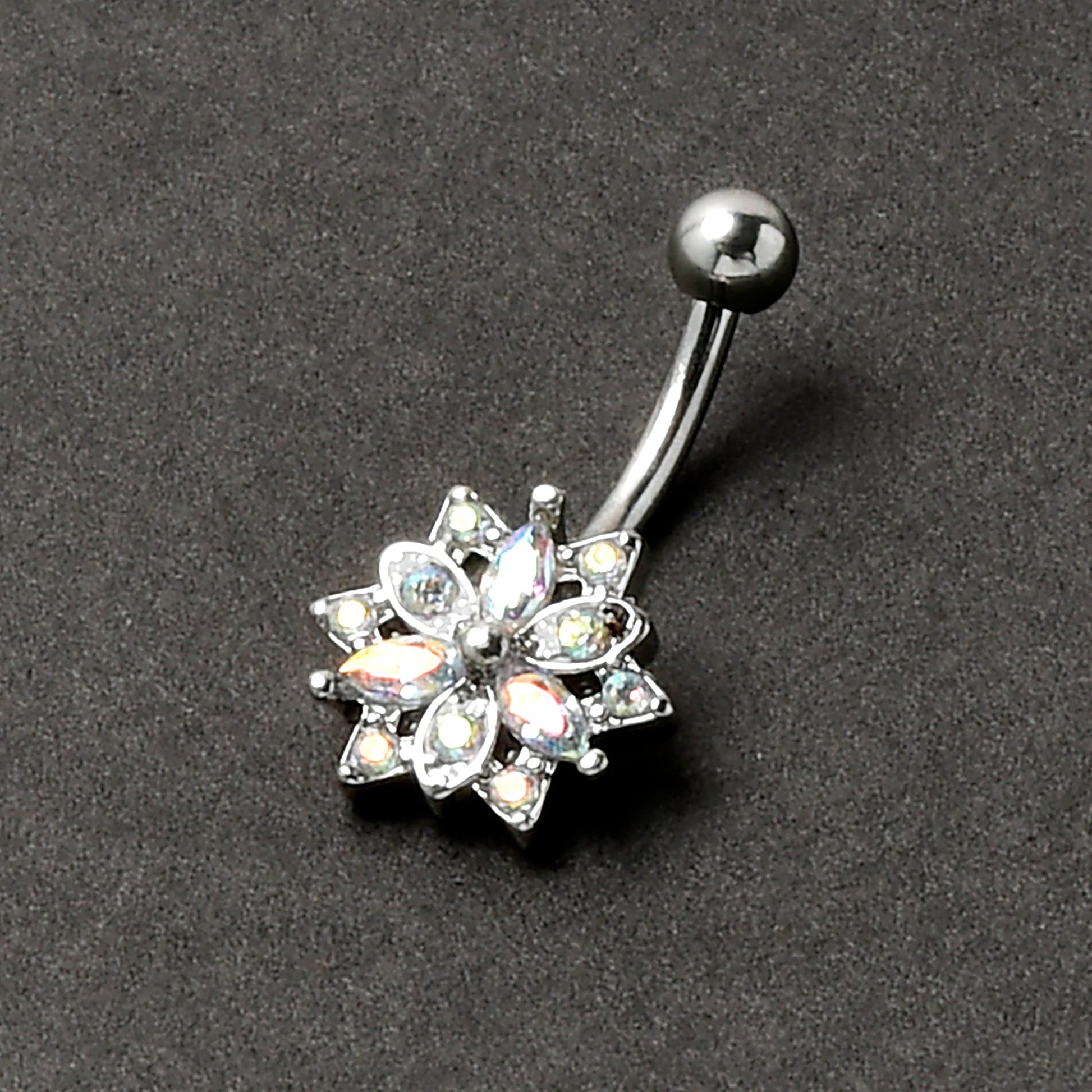The snowflake on this 16 gauge eyebrow jewelry is sure to absolutely melt your heart. It is made with an 8mm durable 316L surgical grade stainless steel curved barbell with a 4mm bottom ball end. The top end features an intricate snowflake charm set with aurora cubic zirconia gems in for a powerful punch of stylish color. You can even rock it in multiple piercings including tragus, rook, and some daith piercings. Let the snow spruce up your look with this sweet and snowy cartilage piercing jewelry.Specifications