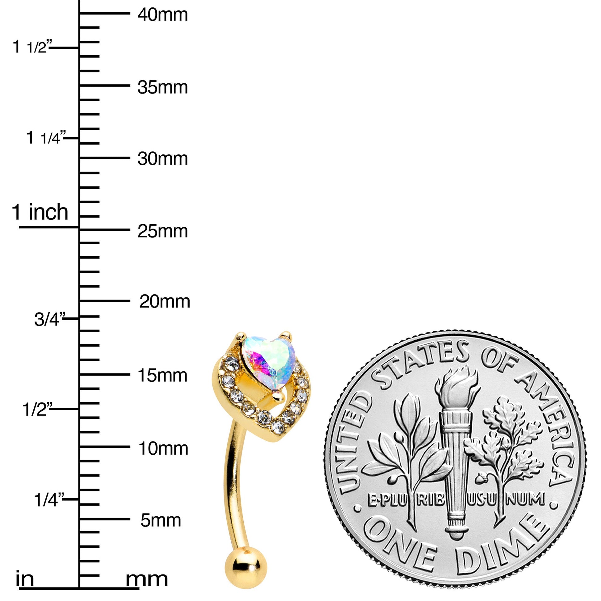 Look luxe and love it without breaking the bank with this 16 gauge cartilage ring! It's made with an 8mm gold tone PVD over 316L surgical grade stainless steel curved barbell with a 3mm bottom ball end. The top end features a heart charm, with the heart composed of a single aurora gem. The heart is surrounded by a heart composed of clear gems. You can even rock this heart in multiple piercings including tragus, eyebrow, and some rook piercings. You're going to fall in love with the opulent look of this heart-themed tragus piercing ring!Specifications