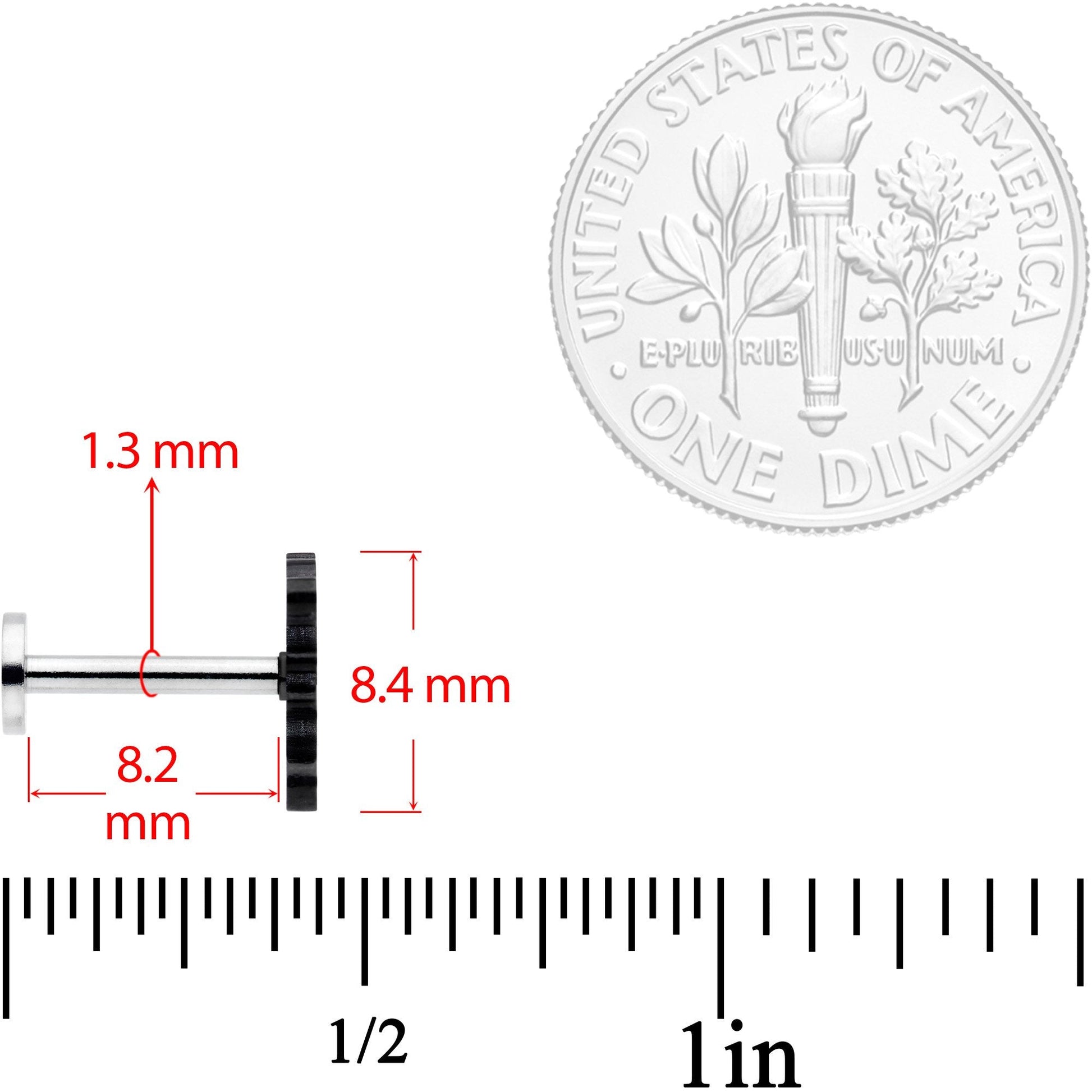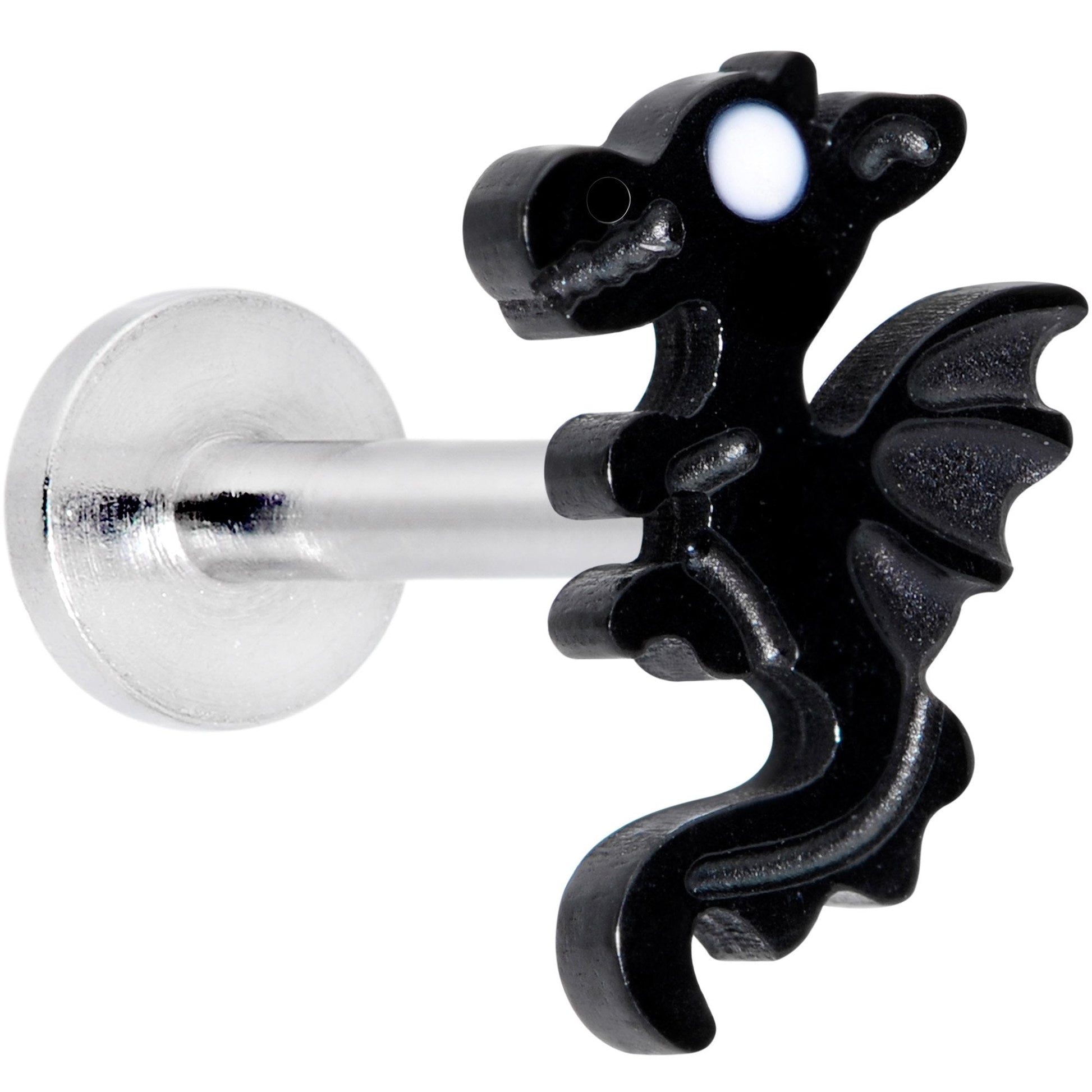 Beware, traveler! Here be dragons! This 16 gauge cartilage stud is made with an 8mm durable 316L surgical grade stainless steel straight barbell. It features a black dragon with the tiniest details of its wing and tail carefully detailed and a tiny white embellishment for its eye. These work beautifully in multiple facial piercings including the monroe and lip and cartilage piercings like the tragus, conch, and helix. So whether you're a die-hard fan of fantasy or simply think dragons are darling, you'll want to saddle up your trusty steed and do battle with this fantastic dragon!Specifications