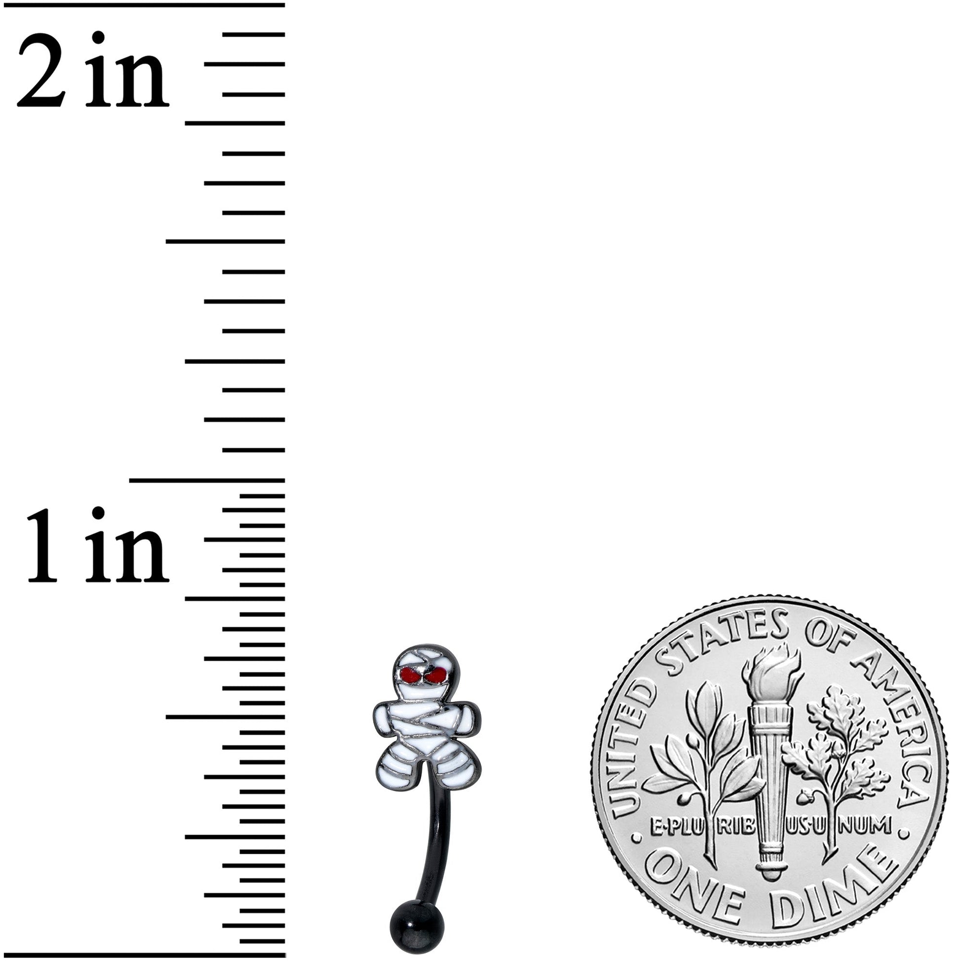 The mummy on this 16 gauge cartilage jewelry will have your piercing looking perfect for Halloween! It's made with an 8mm black PVD over 316L surgical grade stainless steel curved barbell with a 4mm ball end. The other end features a mummy charm with gruesome red eyes and white wrappings, arms spread as though it's ready to grab someone! With such creepy detailing, this mummy will have your eyebrow piercing looking petrifying!Specifications