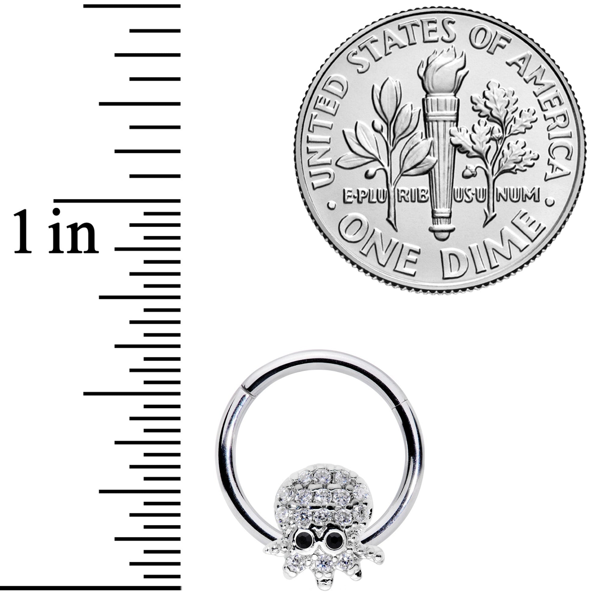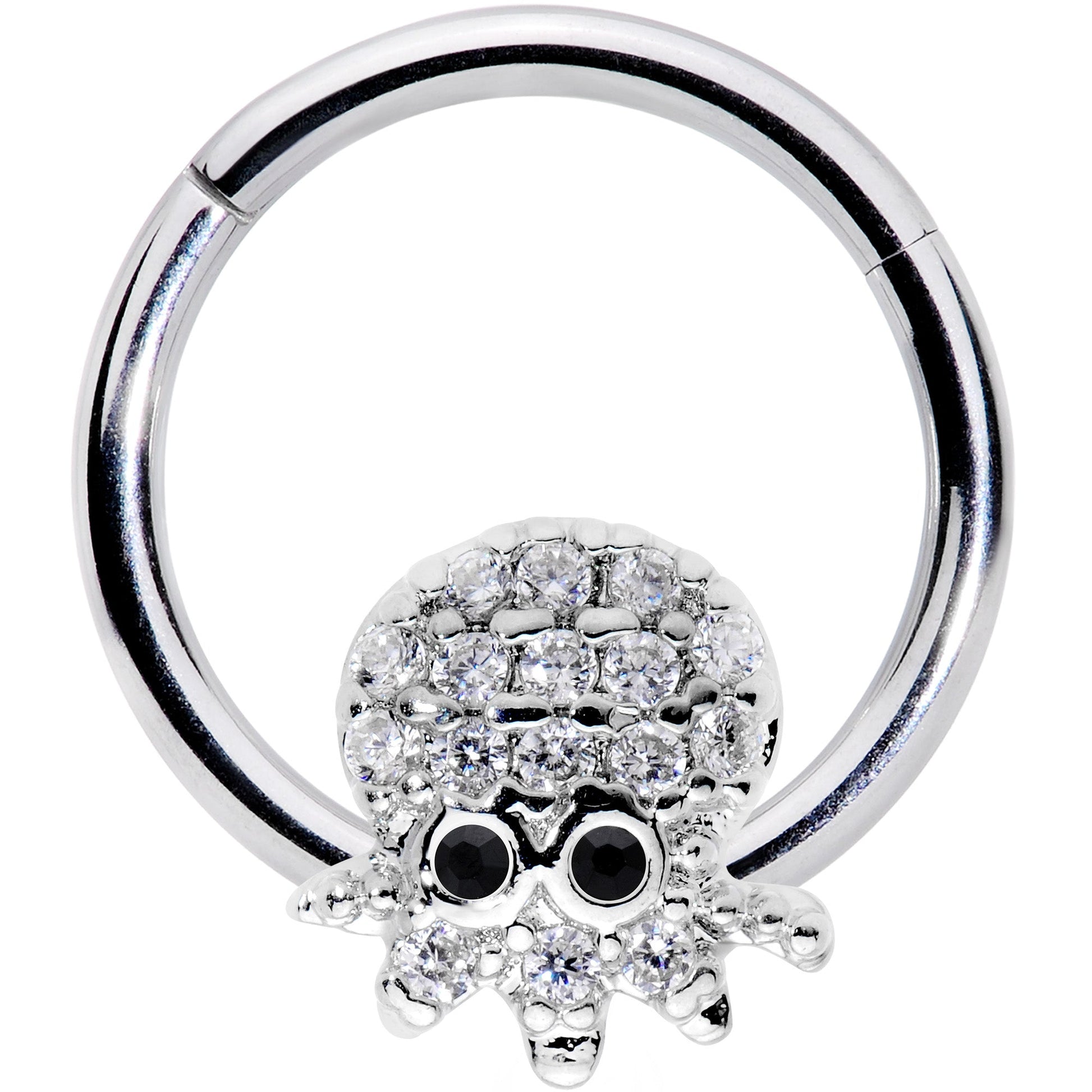 Yar, matey! Set sail for glamour with this 16 gauge octopus cartilage earring! It's made with an 8mm durable 316L surgical grade stainless steel hinged circular ring and features our sweet little eight-legged cephalopod friend. The octopus charm is paved in clear cubic zirconia gems with black cubic zirconia gems for eyes. The ring features a non-removable hinged segment that makes it super easy to insert and remove. You'll love this feature because it works in so many piercings including cartilage piercings like the tragus, rook, helix, and daith, and even your septum! So raise the anchor - we're heading for nautical grandeur in whatever piercing you choose!Specifications