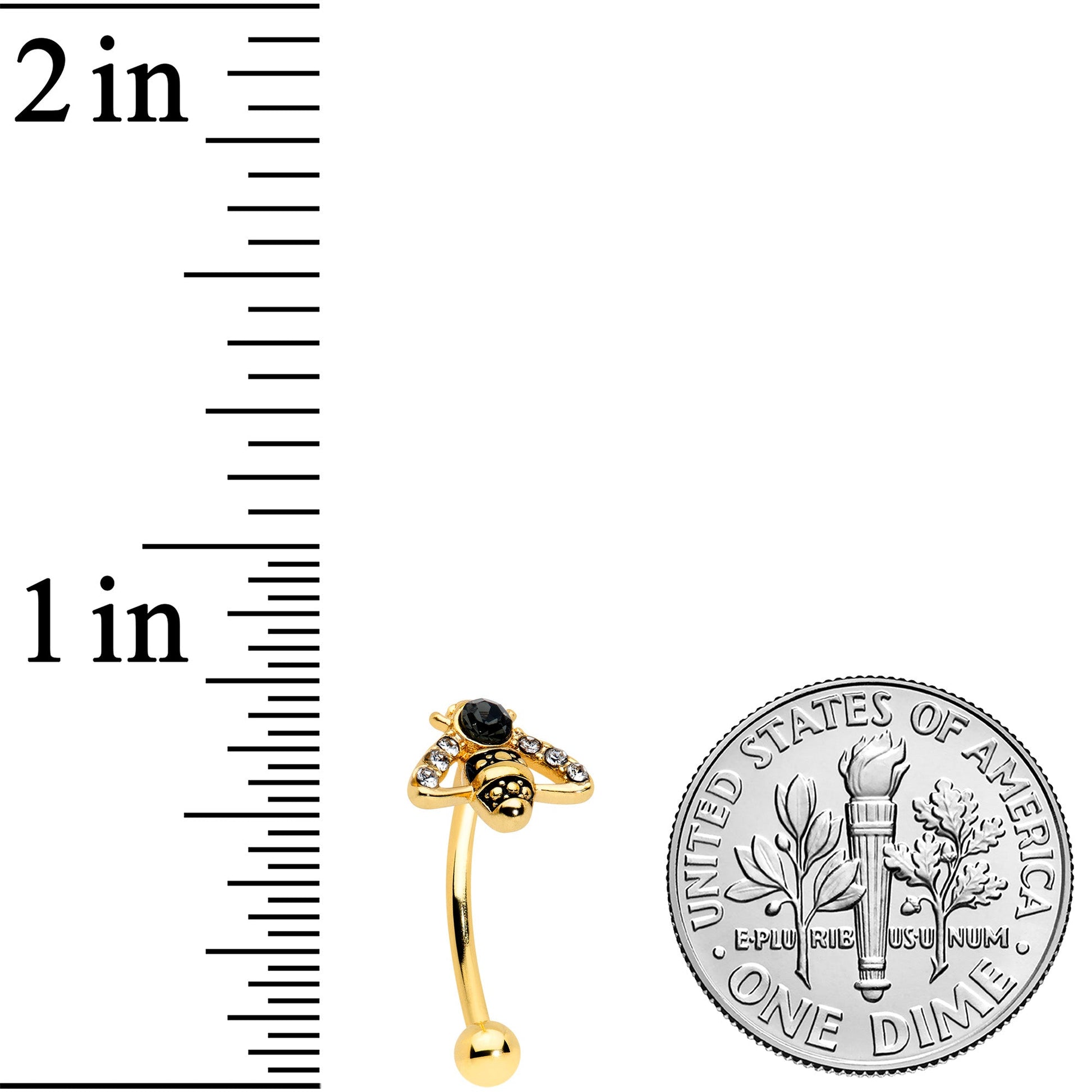 When you rock this 16 gauge eyebrow ring, you'll be sure to catch a buzz....of style! It's made with an 8mm gold tone PVD over 316L surgical grade stainless steel curved barbell with a 3mm bottom ball end. The top end features a bee charm, with angular wings for an elegant look. The bee has clear gems set into its wings, as well as a large black gem set into its head. You can even boast this bee in multiple piercings including tragus, rook, and eyebrow piercings. You'll have too much style to be just a drone when you're rocking this elegant bee cartilage jewelry!Specifications