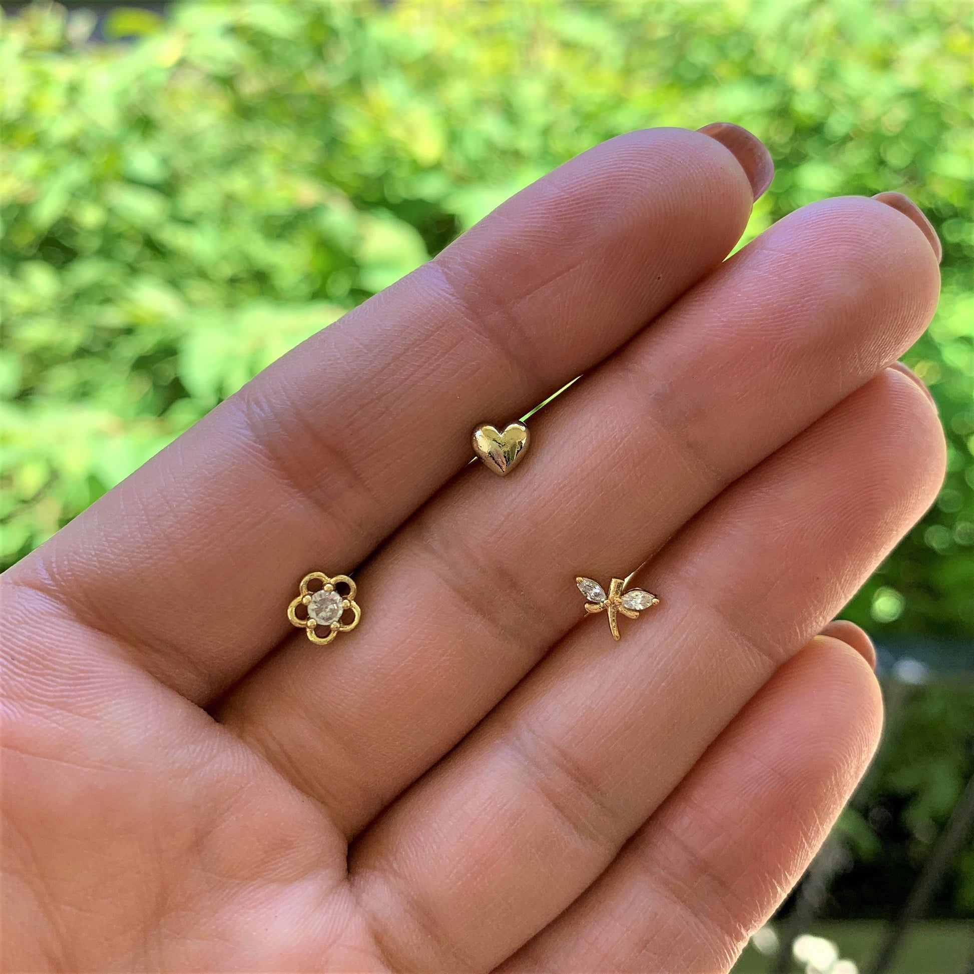 Keep your jewelry options open with this set of 16 gauge cartilage jewelry! You get two that are made with 8mm gold tone PVD over 316L surgical grade stainless steel straight barbells with flat disc ends. One features a gold tone heart charm for a classic, romantic look. The other features a flower charm with a clear cubic zirconia gem set at the center for a look of stylish whimsy. The third one is made with an 8mm flexible Bioplast straight barbell with a flat disc end. It features a dragonfly charm with clear gems set in its wings for a look that's perfect for nature lovers! This tragus jewelry can be worn in lip piercings like the labret and monroe as well as cartilage piercings like the helix, tragus, and conch. Sold as a set of three.Specifications