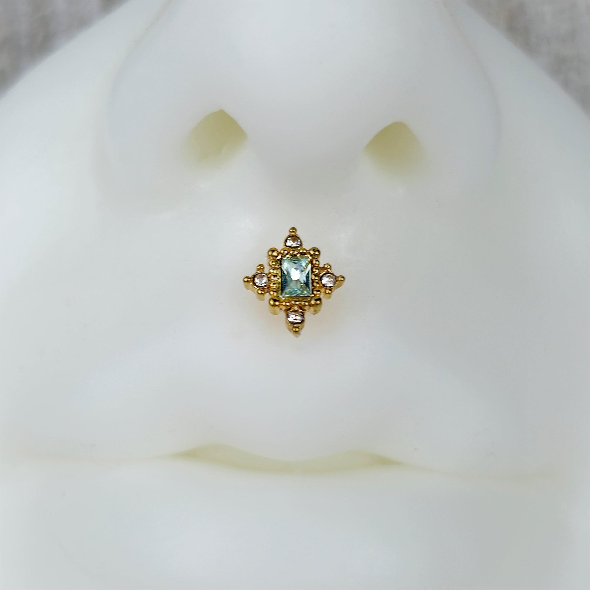 Have a look fir for royalty with this 16 gauge lip ring. It is made with an 8mm gold tone PVD over 316L surgical grade stainless steel straight post with a flat disc end. It features a square charm with a large clear gem center. Set at the edges are clear gems and detailing that is reminiscent of a royal insignia. You can even rock it in multiple piercings including lip, monroe, tragus, helix, and some conch piercings. You will be ready to take your throne when you are rocking this regal cartilage piercing jewelry.Specifications
