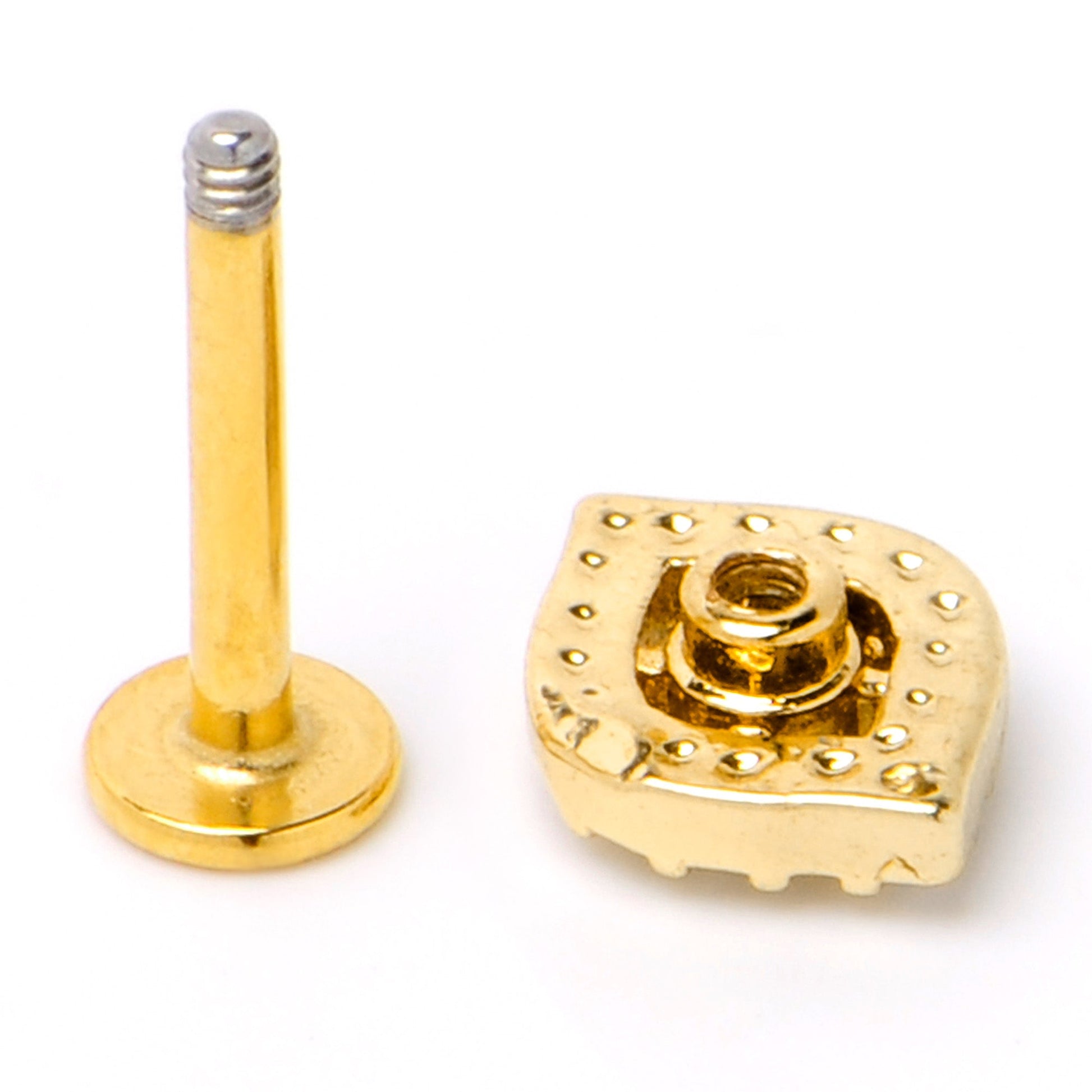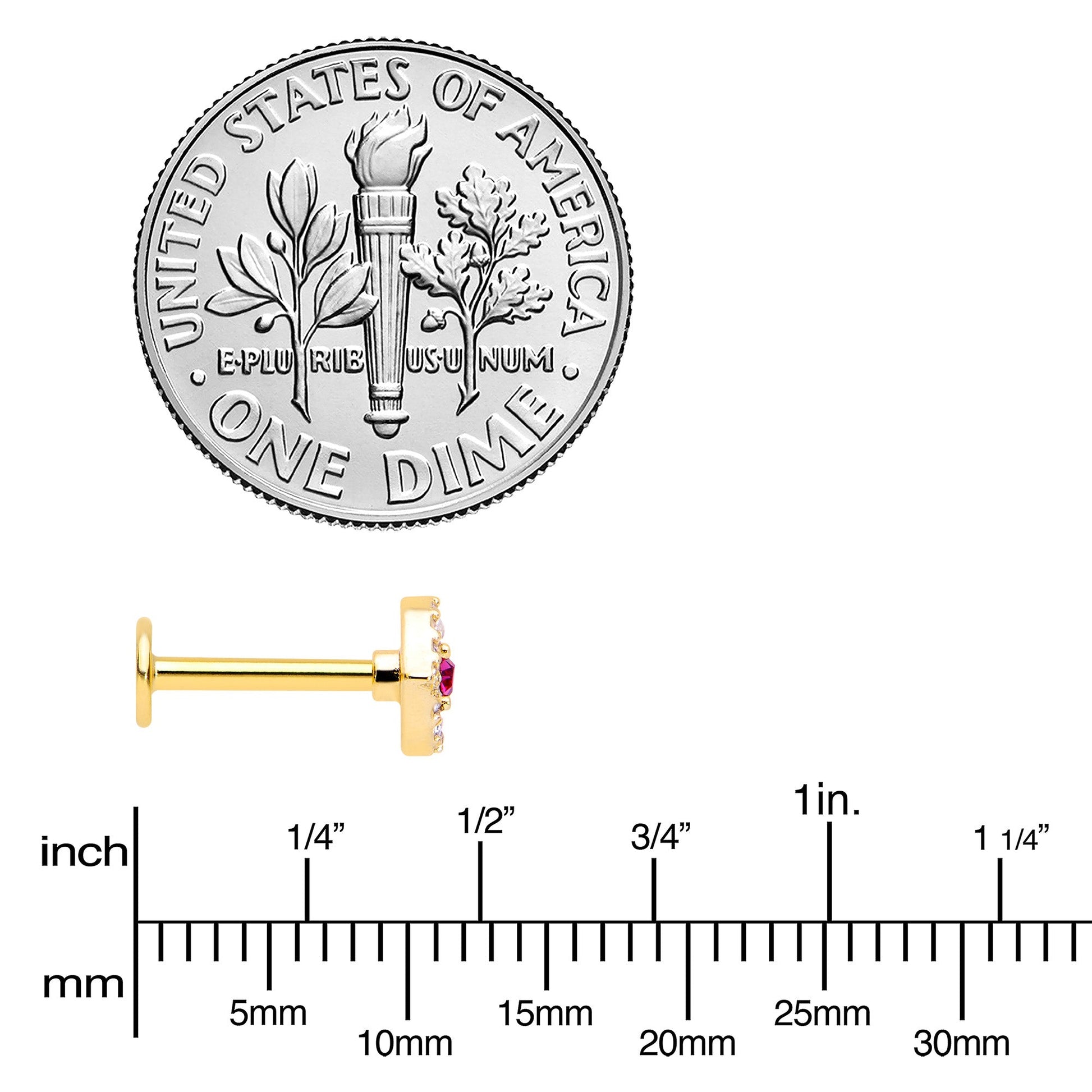 Keep your eyes open and you will spot amazing things - like this 16 gauge lip ring. It is made with an 8mm gold tone PVD over 316L surgical grade stainless steel straight post with a flat disc end. It features an eye charm, with the rim paved in clear gems. The center of the eye is a large pink gem for a striking splash of color. You can even rock it in multiple piercings including lip, monroe, tragus, helix, and conch. You will have all eyes on you with this eye-opening cartilage piercing ring.Specifications