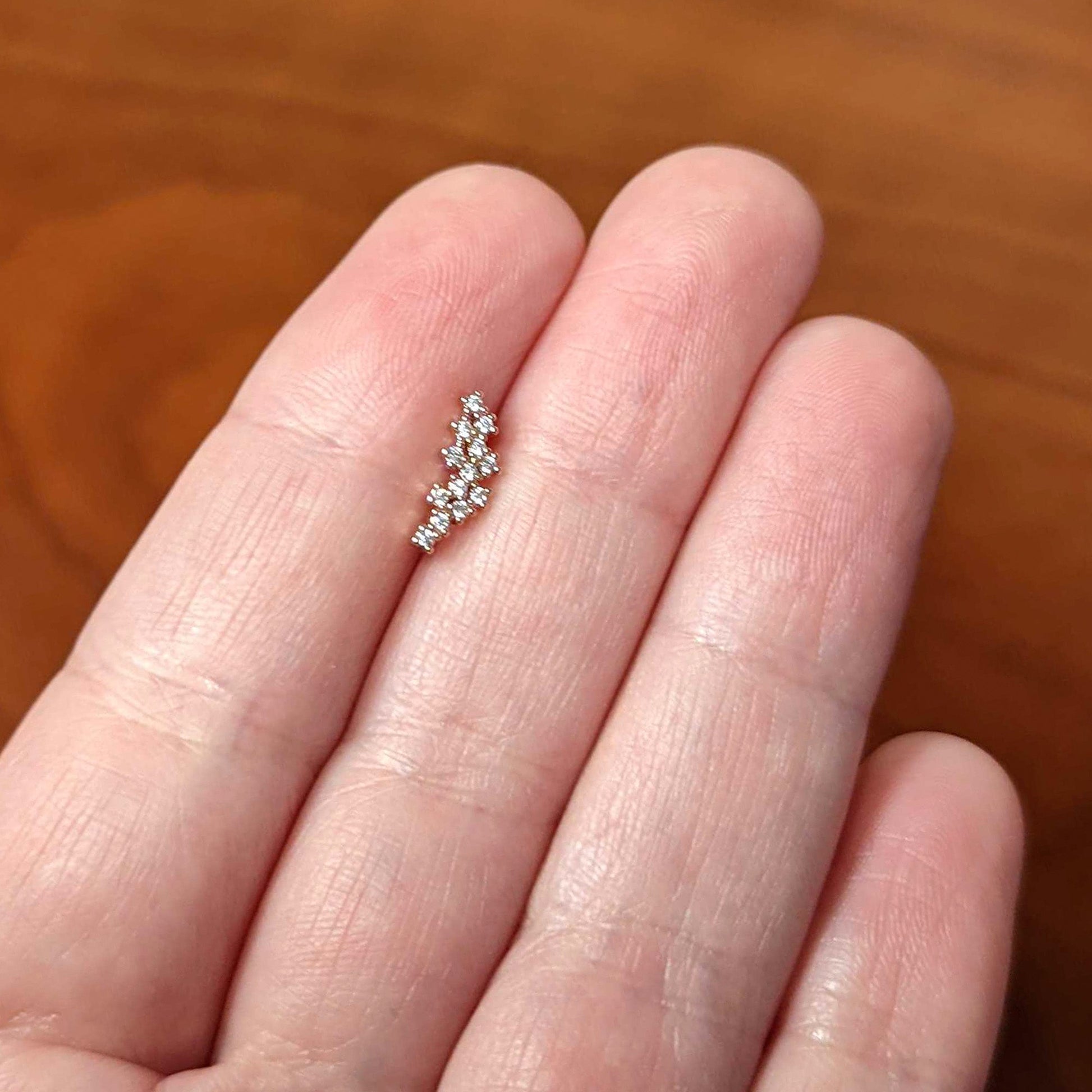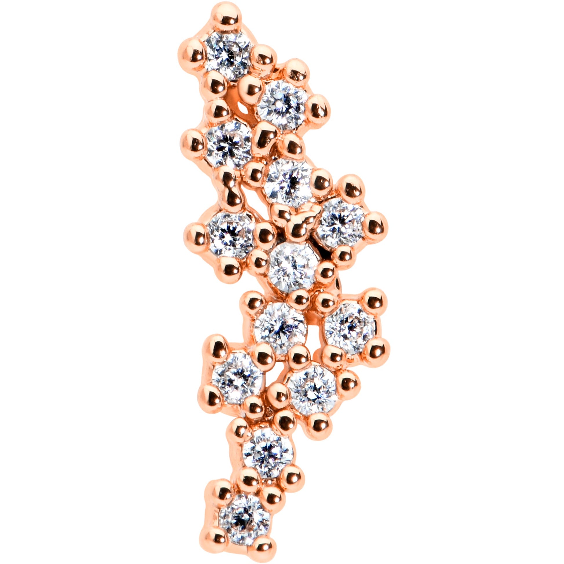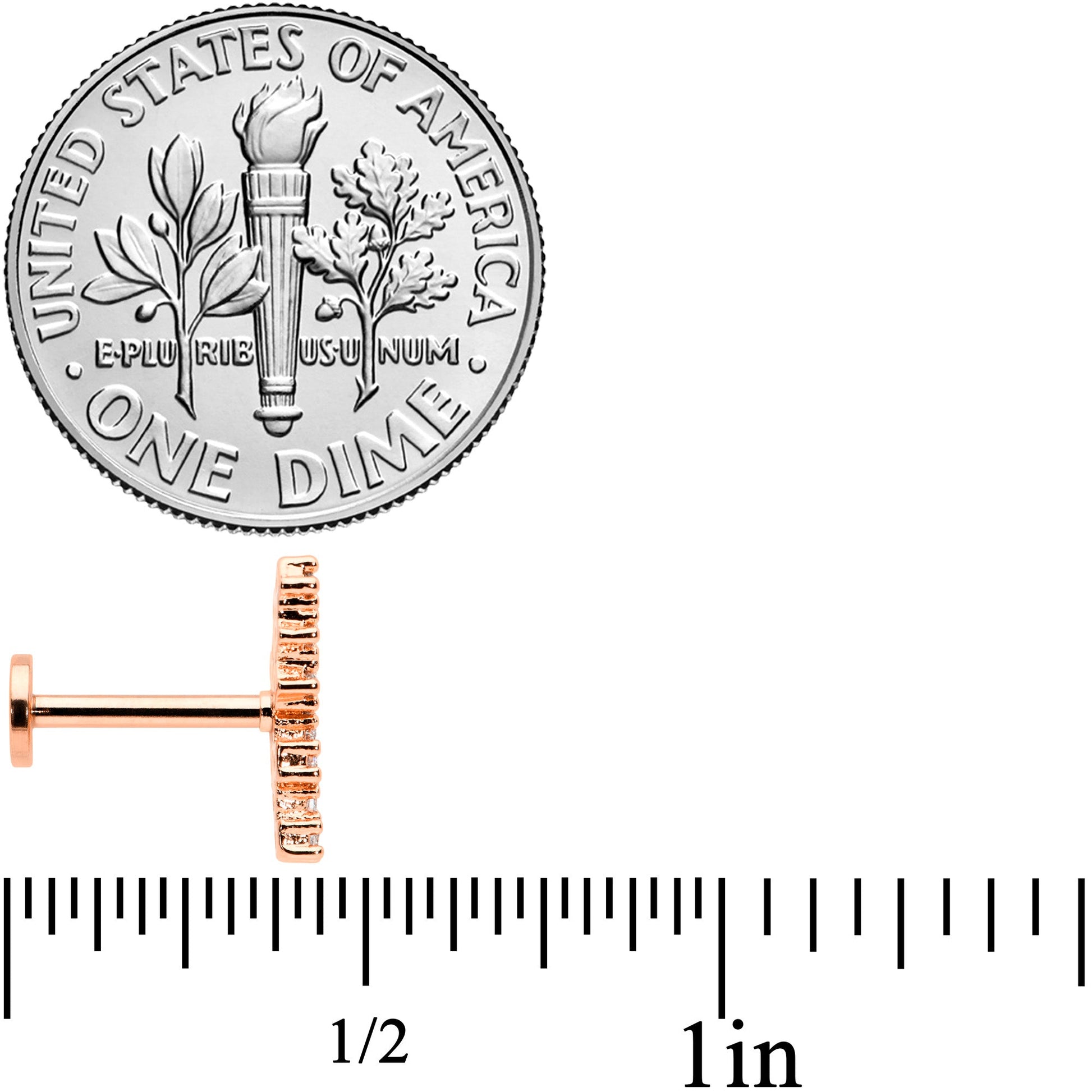 The arc on this 16 gauge lip ring is so simply elegant, it'll have your head going in circles! It's made with an 8mm rose gold tone PVD over 316L surgical grade stainless steel straight barbell with a flat disc end. It features an arc charm of clear cubic zirconia gems with textured detailing. It also features an internally threaded design that makes insertion and removal extra comfortable and you can even rock it in multiple piercings including lip, monroe, tragus, helix, and some conch piercings. This elegant cartilage piercing ring has it all!Specifications