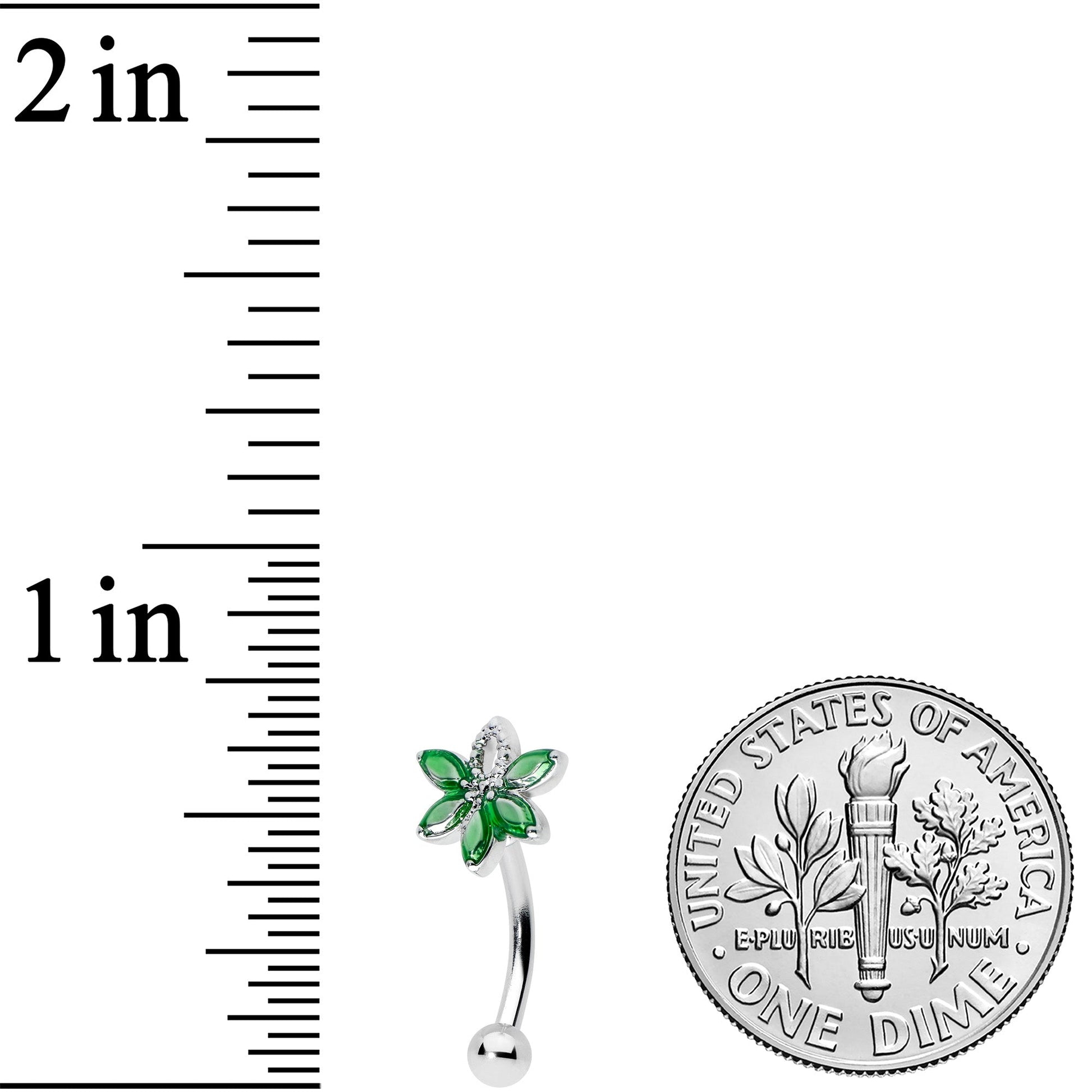 The pot leaf on this 16 gauge eyebrow jewelry packs a powerful punch....of style! It's made with an 8mm durable 316L surgical grade stainless steel curved barbell with a 3mm bottom ball end. The top end features a pot leaf charm, with five leaves composed of single green gems. The topmost leaf features textured detailing for an eye-catching appearance. You can even wear this weed in multiple piercings including tragus, rook, and eyebrow! You'll be stoned on style when you're rocking this gorgeous, ganja-themed cartilage jewelry!Specifications