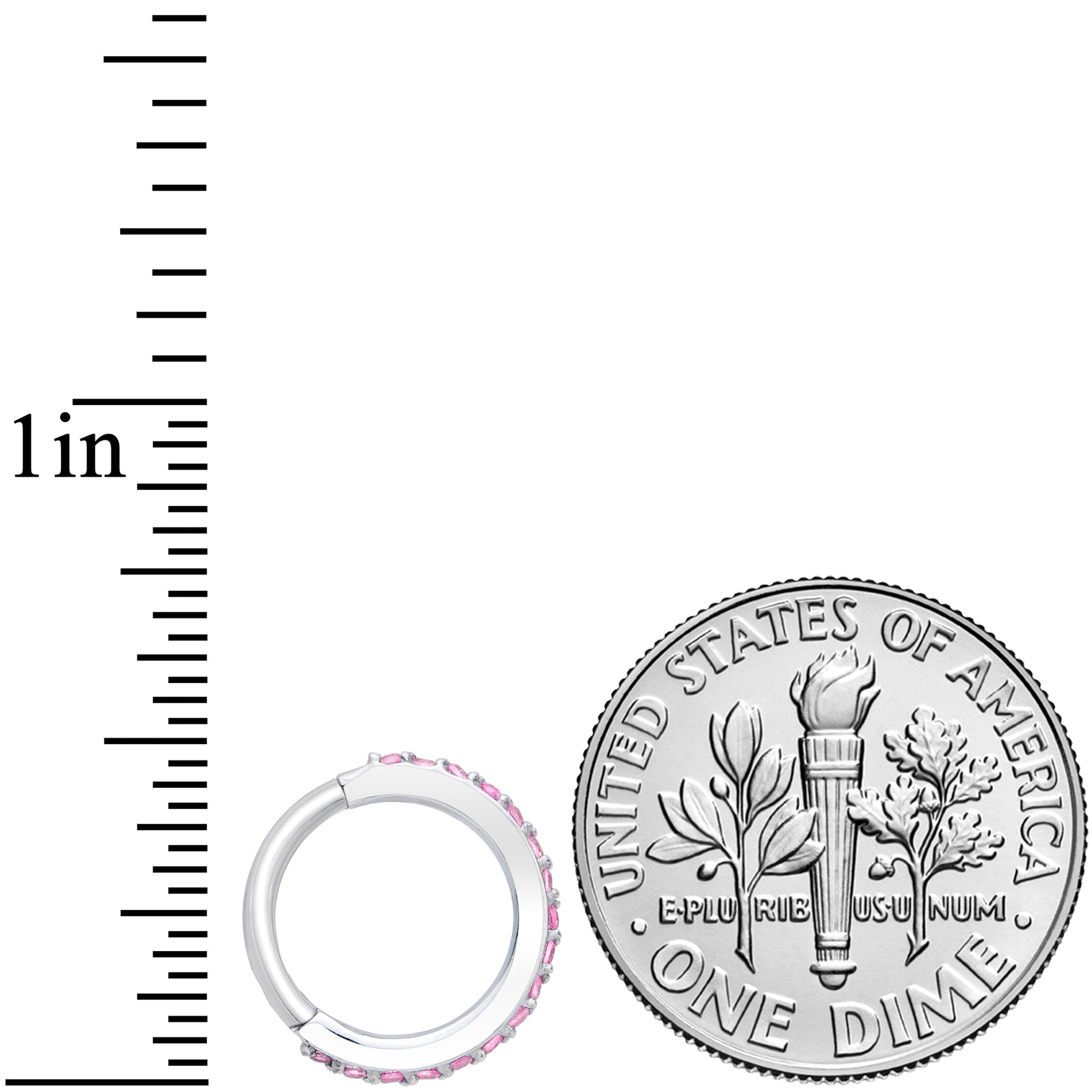 Add a touch of simple glamour to your cartilage piercings with this 16 gauge clicker ring! It's made with an 8mm durable 316L surgical grade stainless steel hinged circular ring. The rim is paved all the way around with tiny pink cubic zirconia gems for a look that is luxurious. It also features a hinged, non-removable segment that makes it easier to insert and remove. This feature is one you'll love because it works so well in multiple cartilage piercings including the helix, daith, tragus, rook, and more. Add some sumptuous style to the cartilage piercing of your choice with this gorgeous glamorous cartilage ring!Specifications