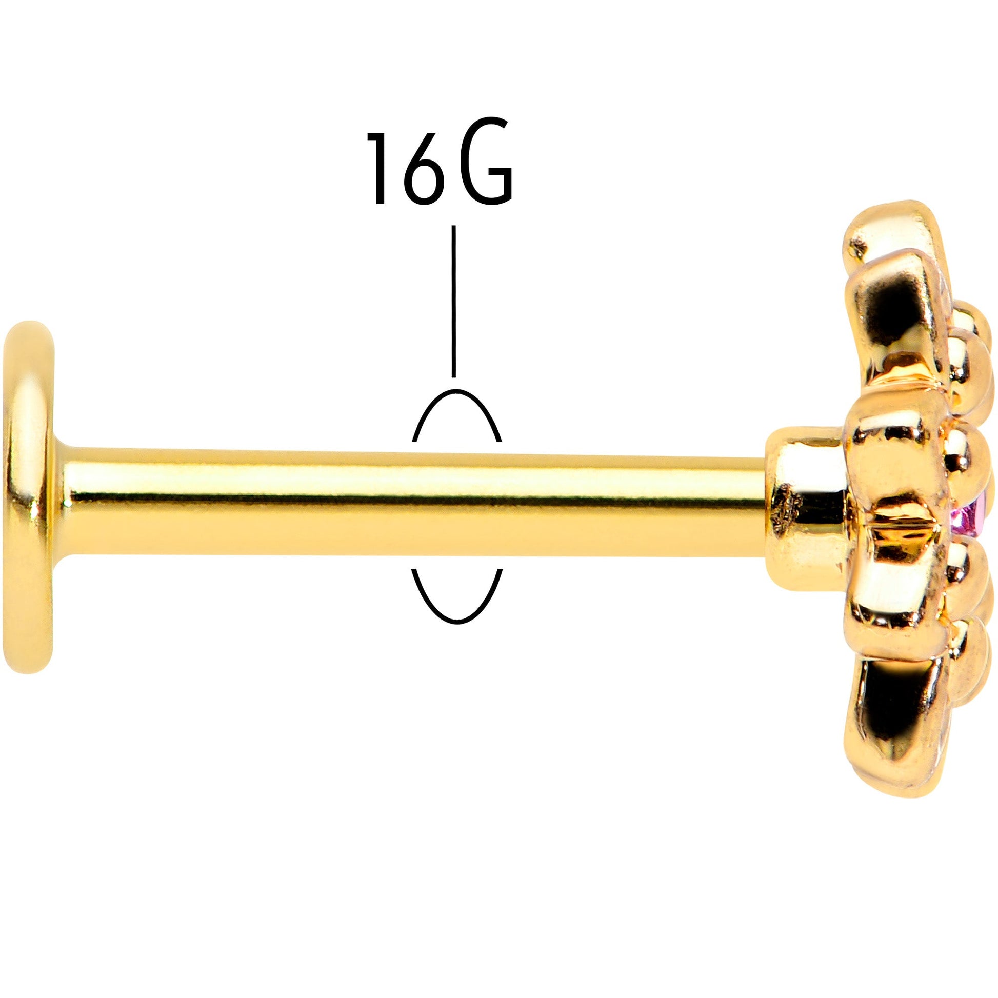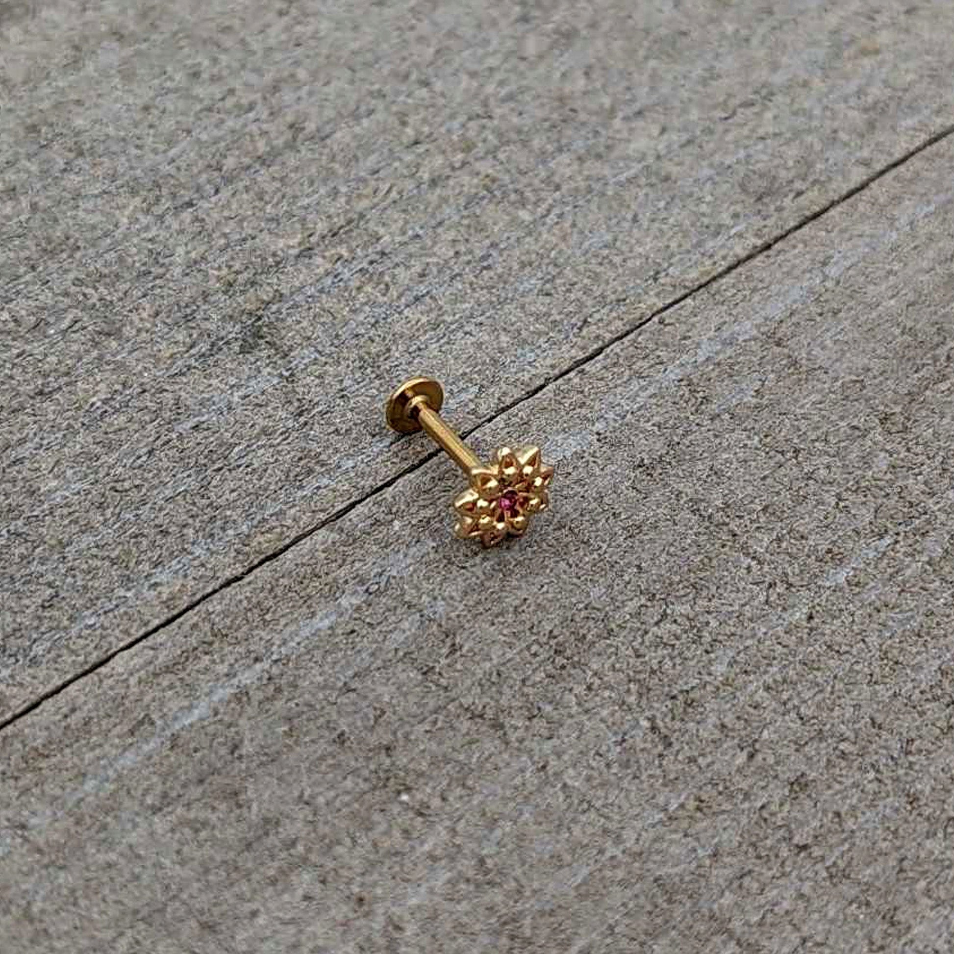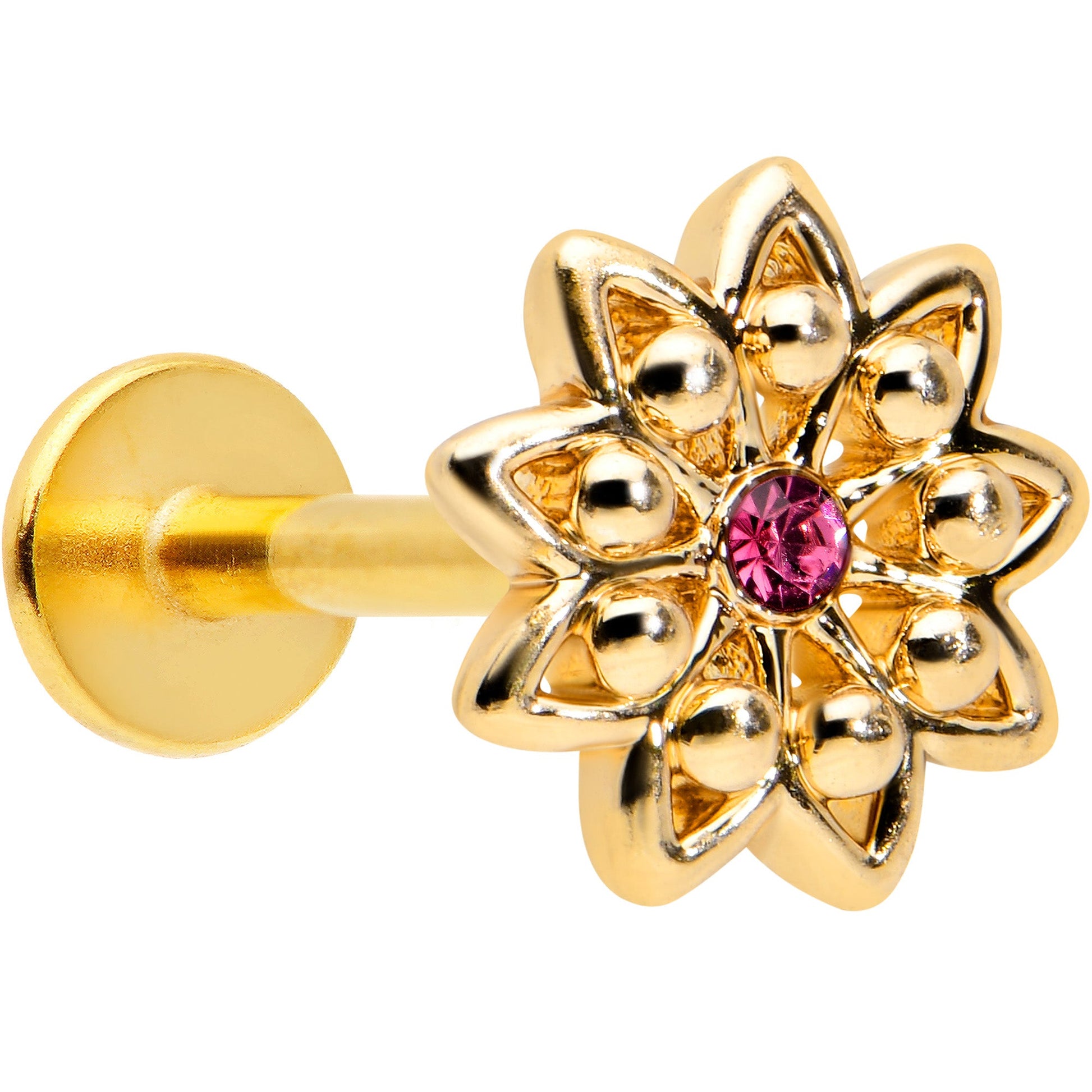 Some flowers are meant to be stars, like this 16 gauge lip ring! It's made with an 8mm gold tone PVD over 316L surgical grade stainless steel straight post with a flat disc end. It features a detailed flower charm, with textured petals and the flower is set at the center with a pink gem for stunning color contrast. You can even flaunt this flower in multiple piercings including lip, monroe, tragus, helix, and some conch piercings. Let your piercings bloom like the stars they are when you're rocking this striking starry flower cartilage piercing jewelry.Specifications