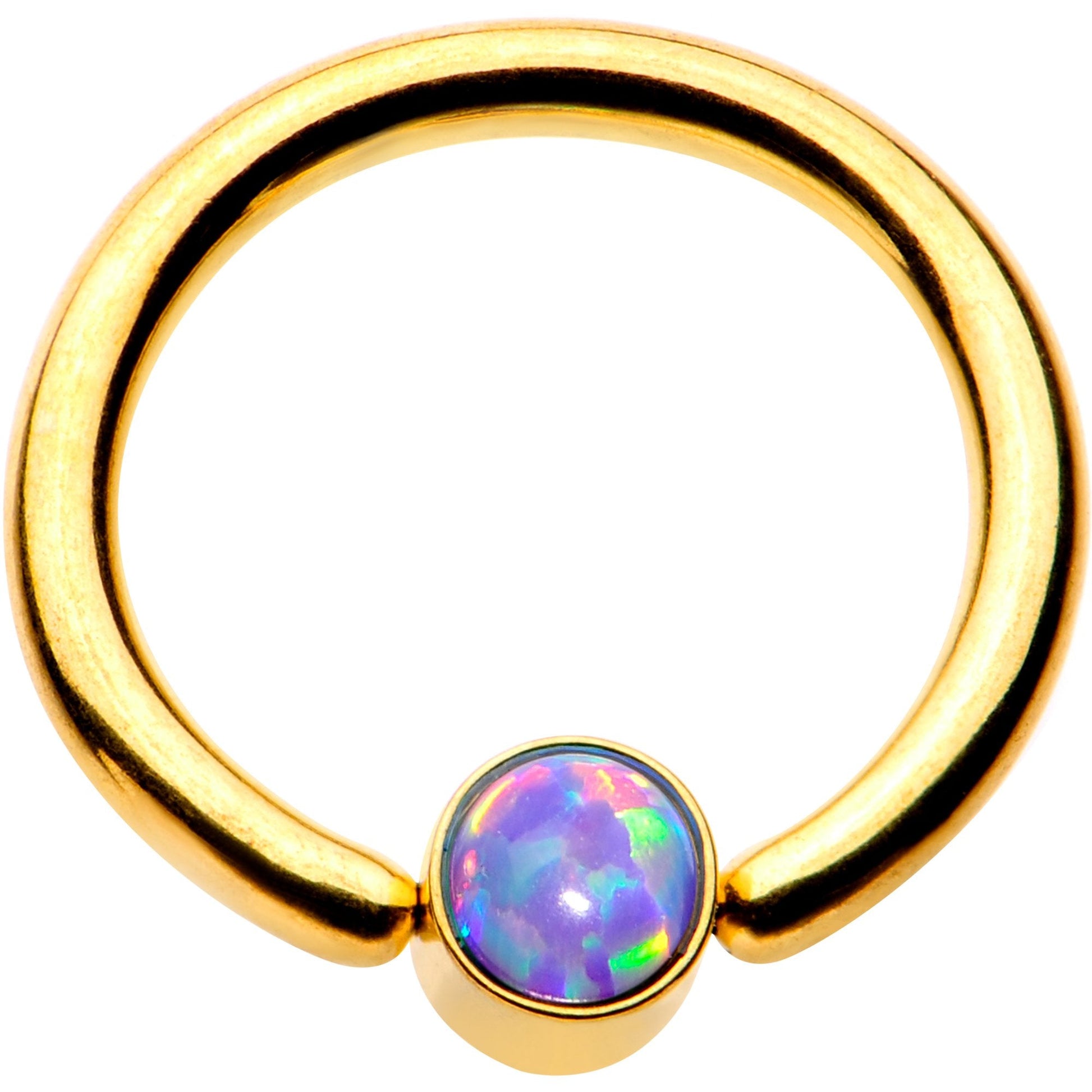 If you love simple style and cool colors then this pretty 16 gauge captive bead ring is just right for you. Made with an 8mm circumference durable 316L surgical grade stainless steel circular ring, this BCR captive disc earring features a flat captive disc set with a 4mm purple faux opal inlay and is perfect for cartilage, septum, lip, nipple, eyebrow piercings and more.