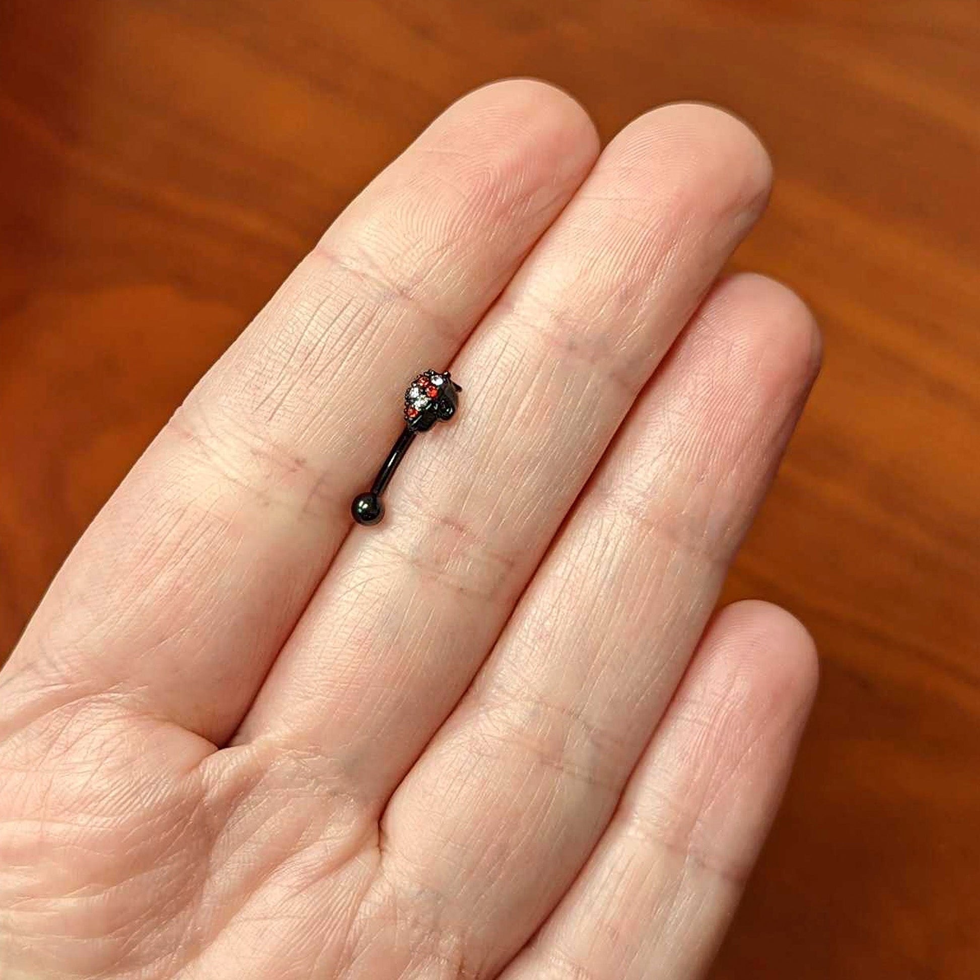 Get spooky, stylish and sexy all at once with this 16 gauge cartilage jewelry! It's made with an 8mm black PVD over 316L surgical grade stainless steel curved barbell with a 3mm bottom ball end. The top end features a skull charm, with one side of the skull's face paved with clear and red gems. You can even sport this skull in multiple piercings including tragus, rook, and eyebrow! Add a bit of creepy cool to your cartilage piercings with this skull-themed eyebrow piercing ring!Specifications