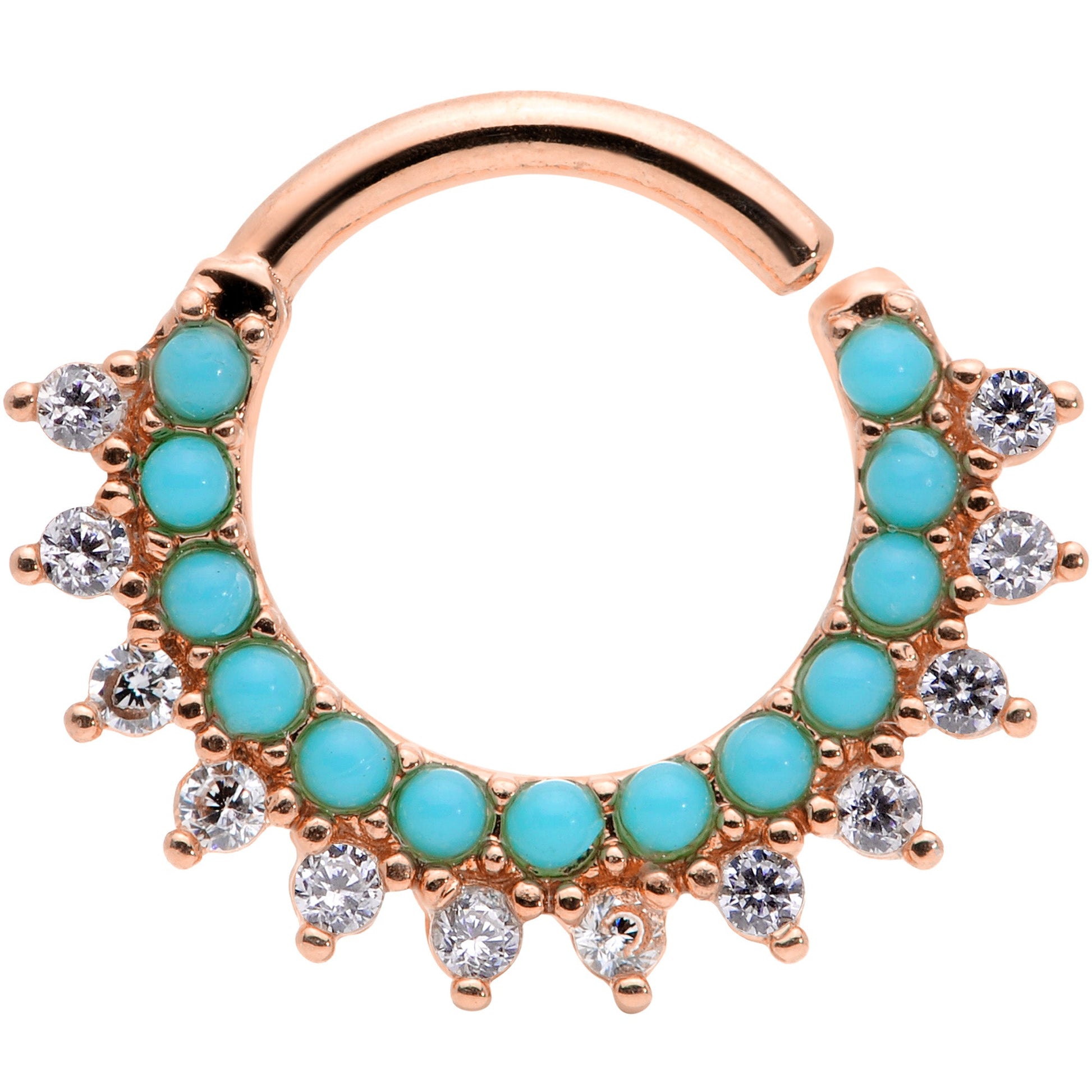 This 16 gauge cartilage jewelry is reminiscent of the sun coming up over the southwestern desert! The 8mm tragus earring is made with rose gold tone plated over brass. It features a row of small synthetic turquoise stones which are further embellished with a row of triangular clear cubic zirconia gems. This cartilage ring is super easy to insert and remove - simply twist the ring open, insert, and then twist gently shut again. You'll love this feature because this works so well in multiple piercings including the septum as well as cartilage piercings like the tragus, helix, daith, helix, and rook. Let the sun shine on all of your piercings...or from them with this beautiful southwestern-styled cartilage earring!