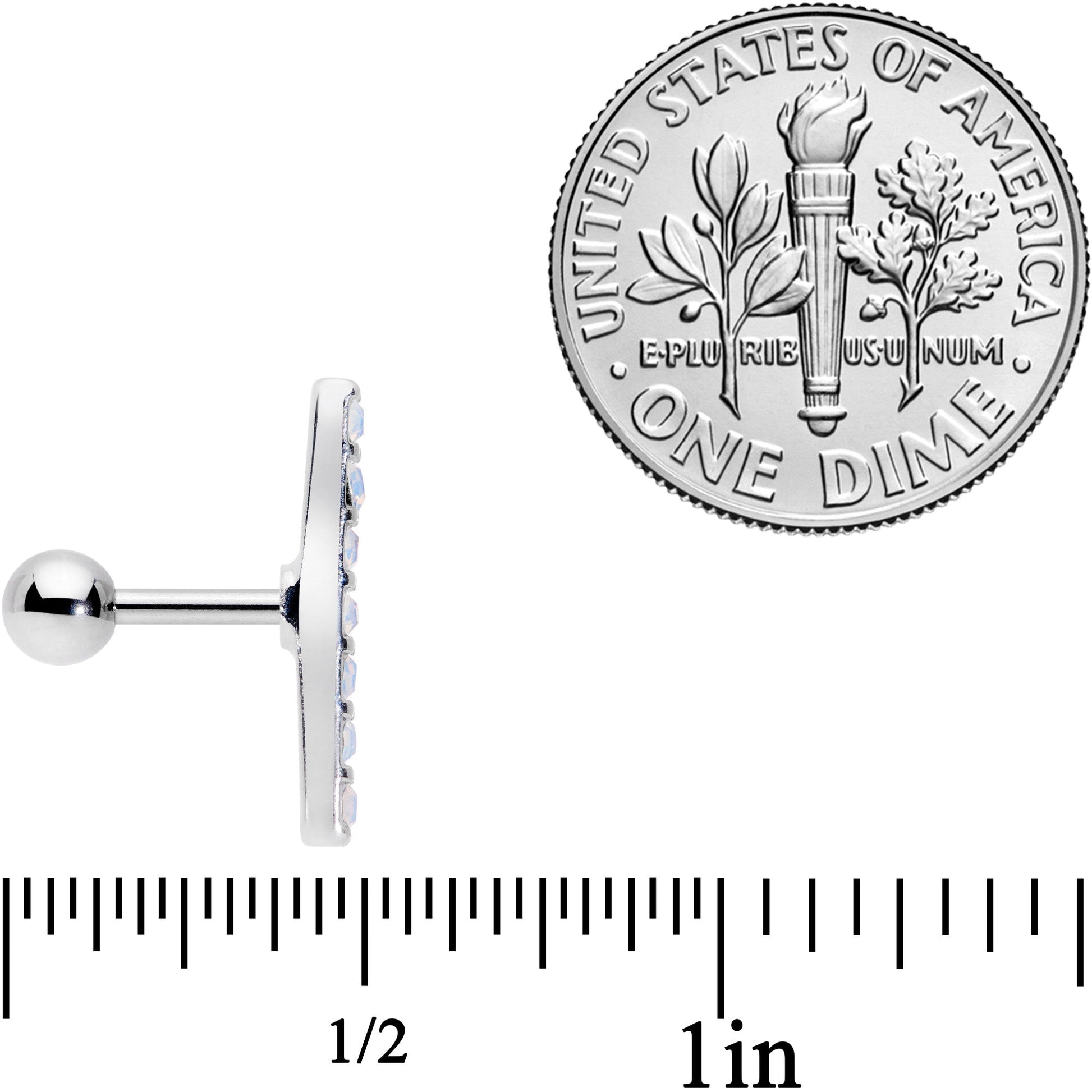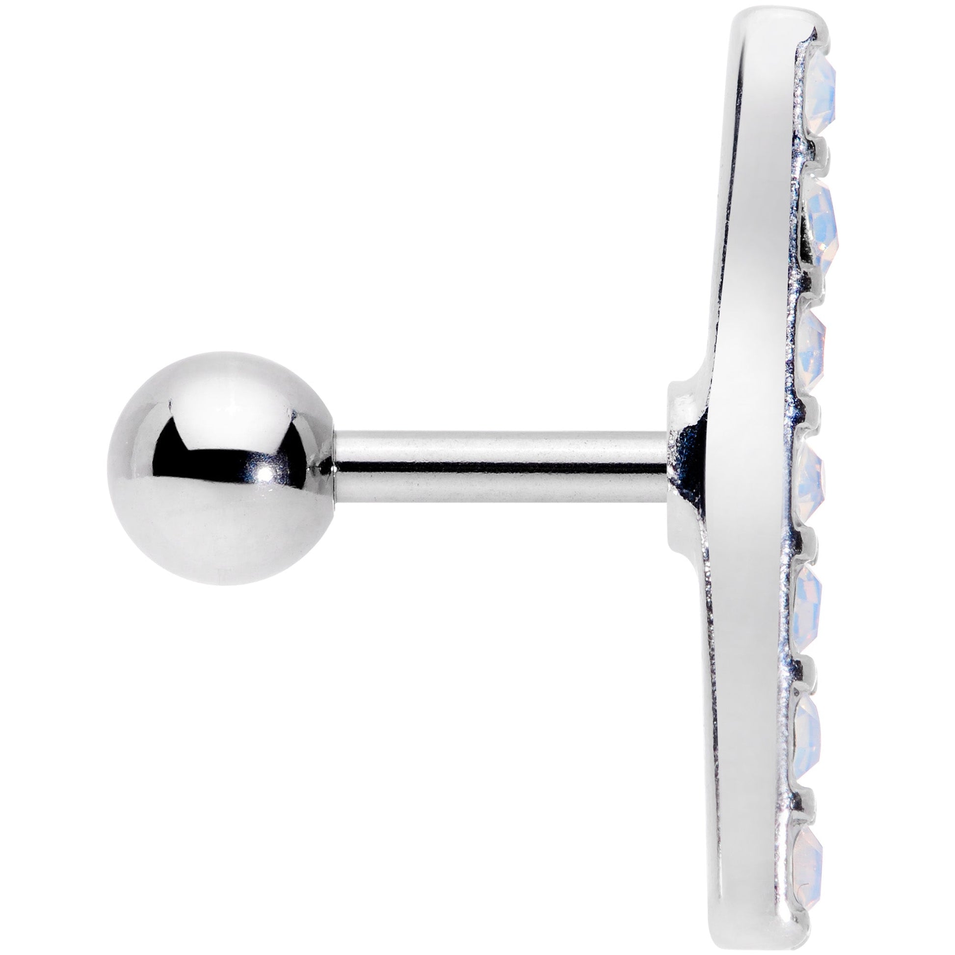 If you're into beauty you'll think you went to seventh heaven with this 16 gauge cartilage stud! It's made with an 8mm durable 316L surgical grade stainless steel straight barbell with a 4mm ball end. The front end features a single row of seven white faux opals for a look that's both elegant and very much on-trend. Even better, this cartilage earring works well in multiple piercings including the tragus, helix, conch, and more! Let your cartilage piercings look absolutely heavenly!Specifications