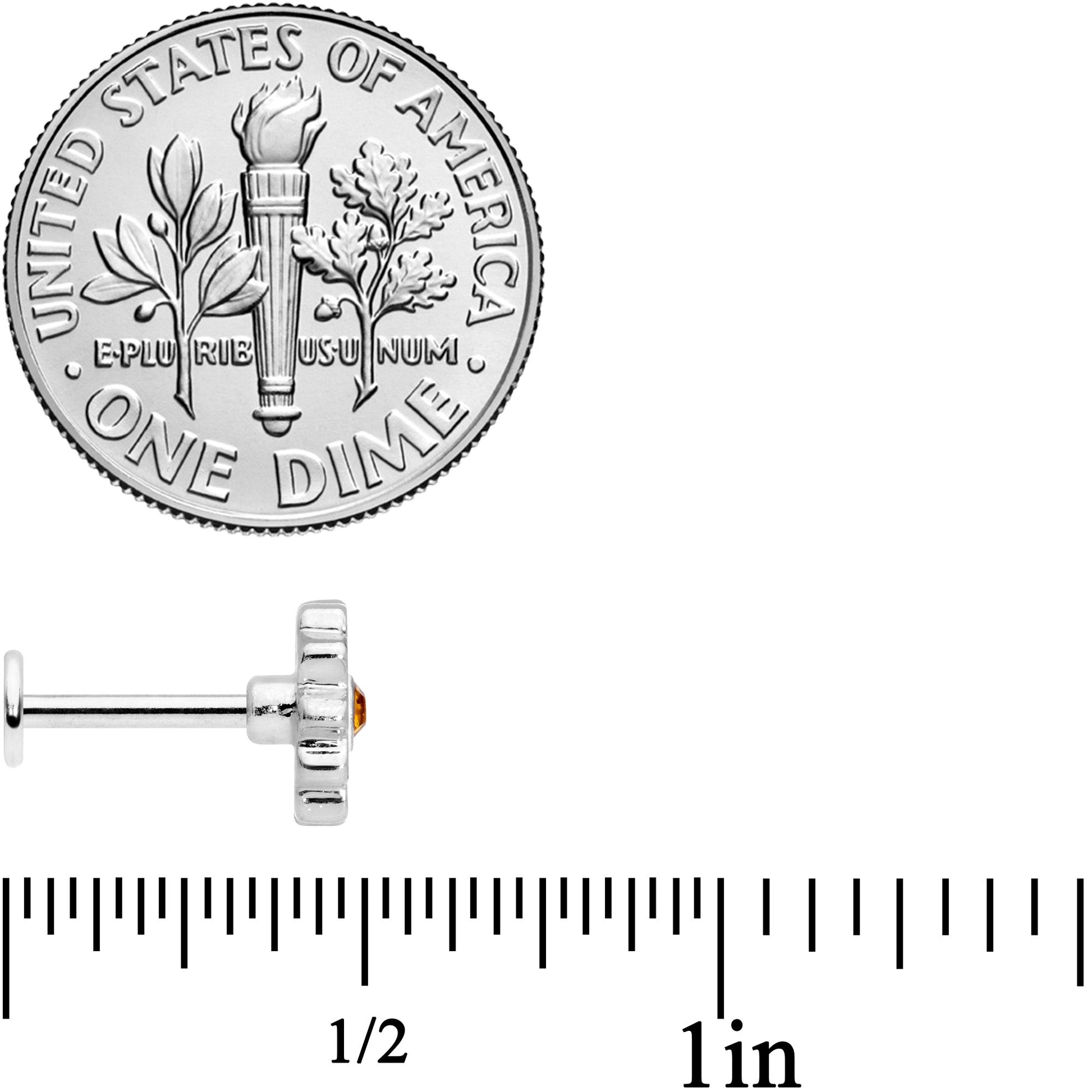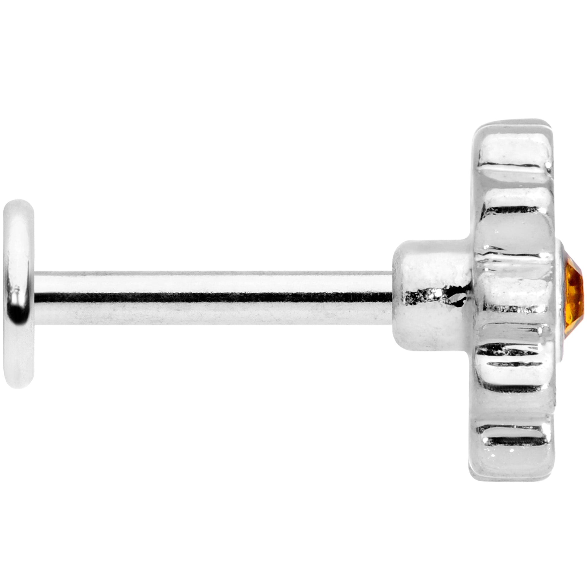 Get your flower power on with this 16 gauge floral lip ring! It's made with an 8mm durable 316L surgical grade stainless steel straight barbell with a flat disc end. The front end features a daisy flower charm. Set at the center is a dark yellow gem for a look that adds richness to realism as well as adding a striking pop of color. And this mighty daisy works well in multiple piercings including lip piercings like the labret and monroe as well as cartilage piercings like the helix, tragus, and conch piercings. If you're a flower fanatic, this labret jewelry is sure to please!Specifications