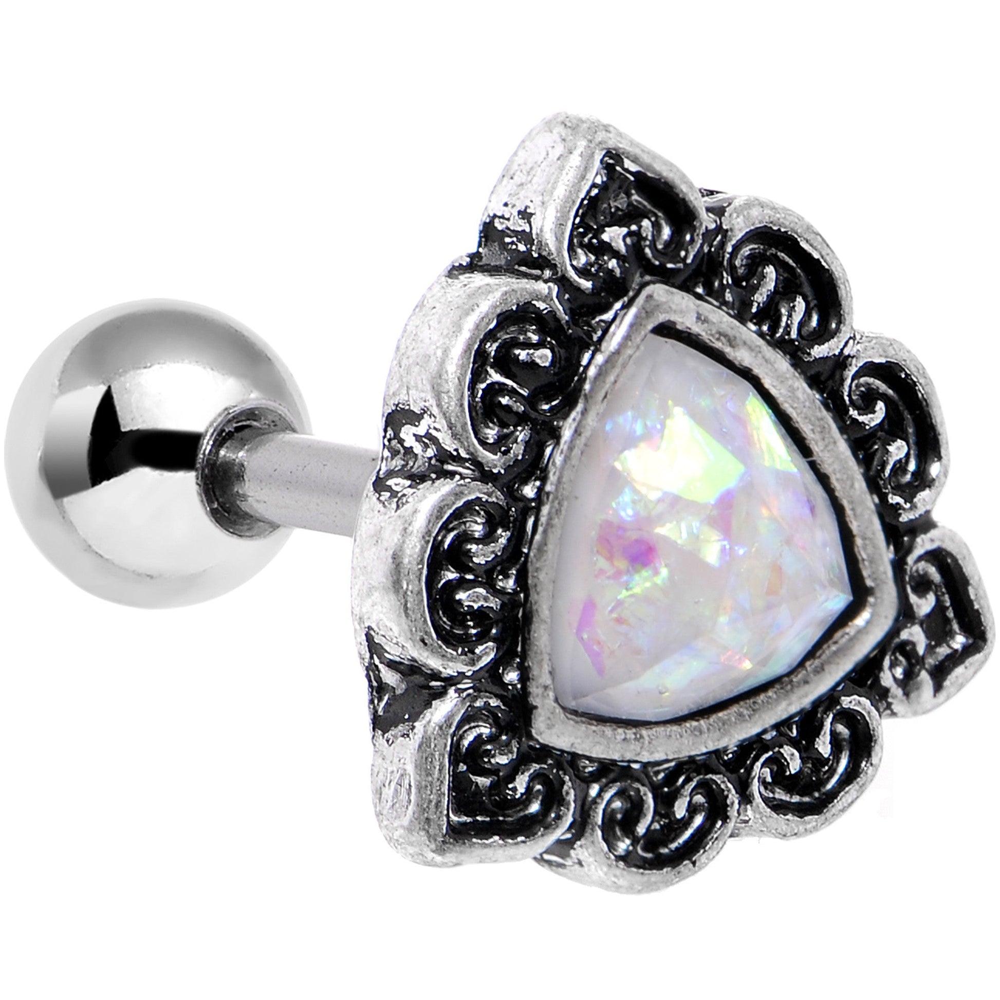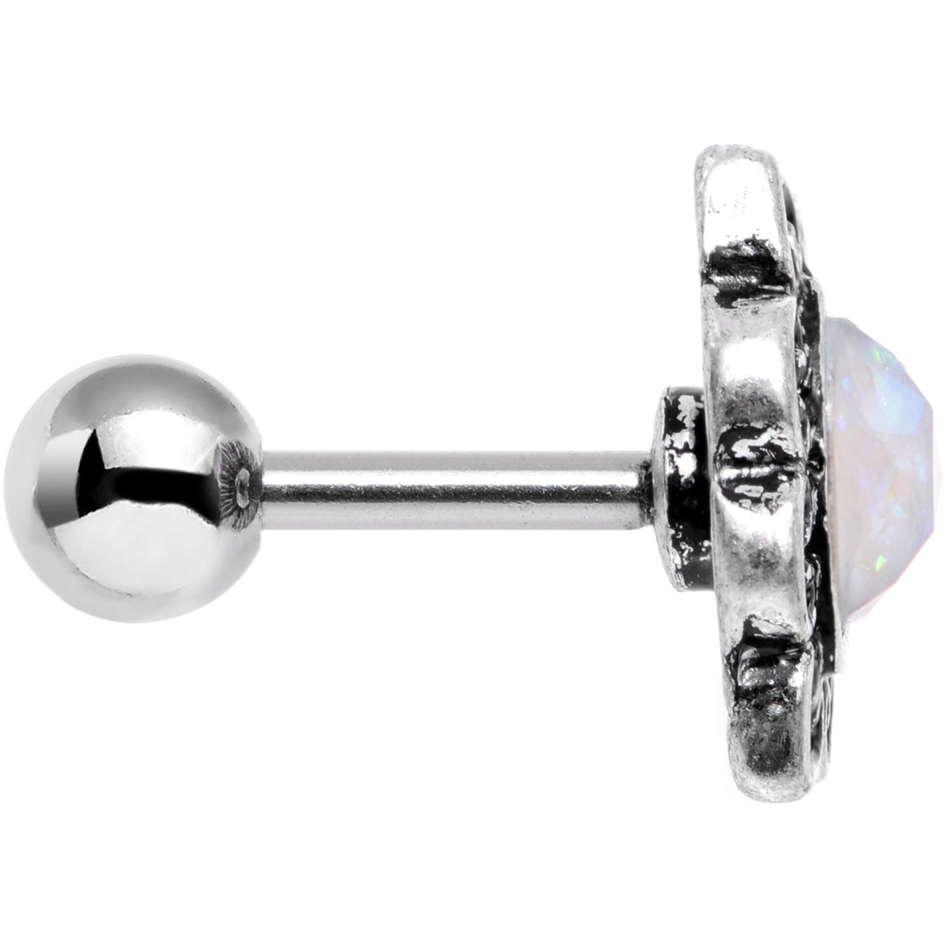 16G Iridescent White Faux Opal Ornate Tragus Cartilage Earring