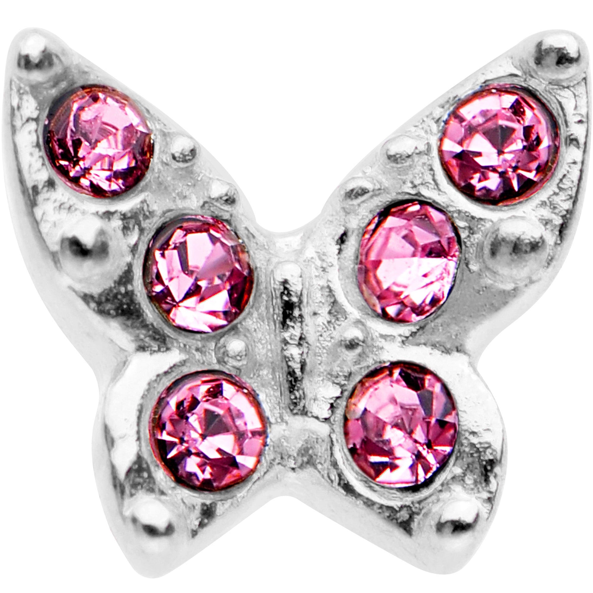 Flap and soar through life with this cute little flapping butterfly cartilage stud earring. A pink gem encrusted butterfly sits at the end of this tragus cartilage piercing. The silver tone butterfly is mounted on a 1/4" straight barbell made with durable 316L surgical grade stainless steel. Great for a tragus piercing or other ear cartilage piercing.
