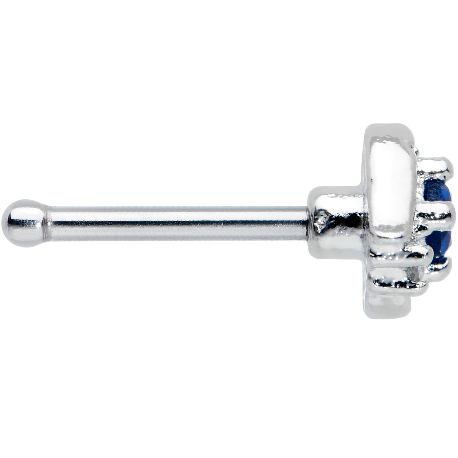 The simple elegance of this 20 gauge nostril ring will make your head swirl! It's made with a 6mm durable 316L surgical grade stainless steel straight post. It features a swirl charm, set with a large deep blue gem oval at the center. The swirl portion is embellished with clear gems for an added touch of style. Add a swirl of sexy style to your nostril piercing with this seductive swirl nose jewelry!Specifications